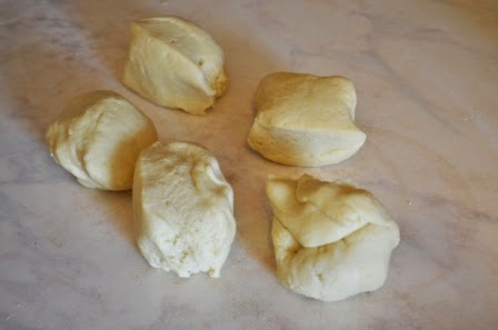 4. Каждый кусок раскатываем в круг, достаточно тонко. Стол обязательно припылить мукой, обрезать ровный круг по тарелке 20 см в диаметре. Перекладываем на противень, застеленный пергаментом или силиконовым ковриком, накалываем вилкой и выпекаем при 200 гр примерно 8 минут до золотистого цвета.