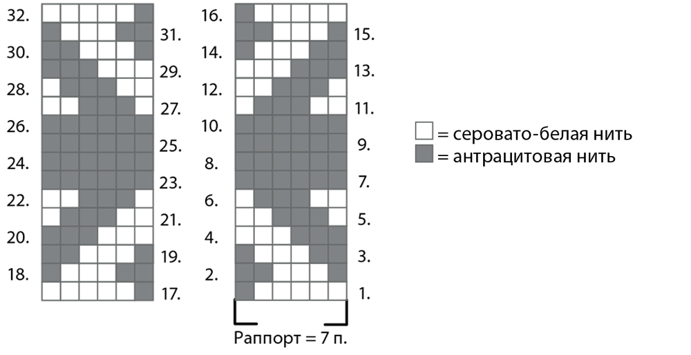 Связав 14 p. серовато-белой нитью, выполнить 17—32-й p. по счетной схеме.