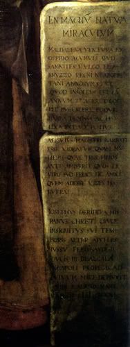 Все имена, даты и обстоятельства создания «Портрета бородатой женщины» известны из длинной латинской надписи, начертанной на блоках камня в правой части картины. Она гласит[2]: