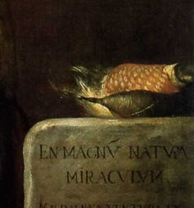 Между описанием сюжета полотна и длинной «подписью» художника оставлен большой «пробел». Подпись пространная, она включает не только его имя, но и гордое упоминание того, что он получил Орден Христа, а также сравнение себя с великим мастером античности Апеллесом (герцог Алькала таким образом соотносится почти что с Александром Македонским, покровителем Апеллеса, но это остаётся непроизнесённым). В середине постамента большая трещина, которая разделяет слова «POTIVS» и «ALICVIVS», создавая цезуру между описанием волос Магдалены и сравнением с «бородатым мужчиной».