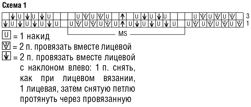 Начать с кром. и петель перед раппортом, раппорт постоянно повторять, закончить петлями после раппорта и кром. В высоту повторять с 1-го по 4-й ряд. Во время прибавок и убавок следить за тем, чтобы количество накидов и провязанных вместе петель узора было одинаковым.