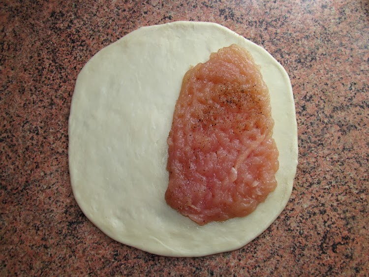 К этому времени тесто должно быть уже готово к использованию. Делим его на части, каждую часть тонко раскатываем, и на одну сторону ложим отбивную.