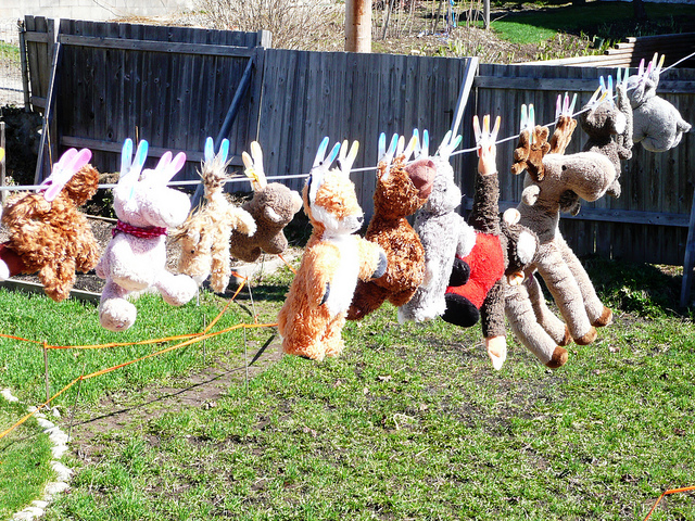 Если у вас есть возможность, то сушите выстиранное бельё на улице. Натяните верёвку специально для малыша, чтобы он до неё доставал. Покажите, как правильно вешать бельё на прищепки.
