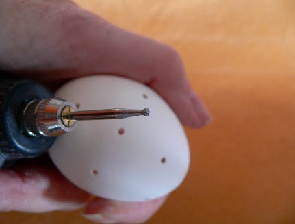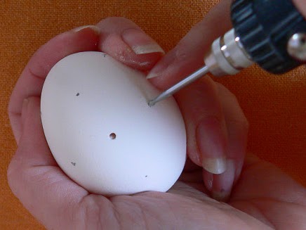 2. Дырочки просверлим маленькой дрелью для рукоделия (13 тыс оборотов и два сверла). При этом скорлупку крепко держать в ладони, сверлом сильно не нажимать.
