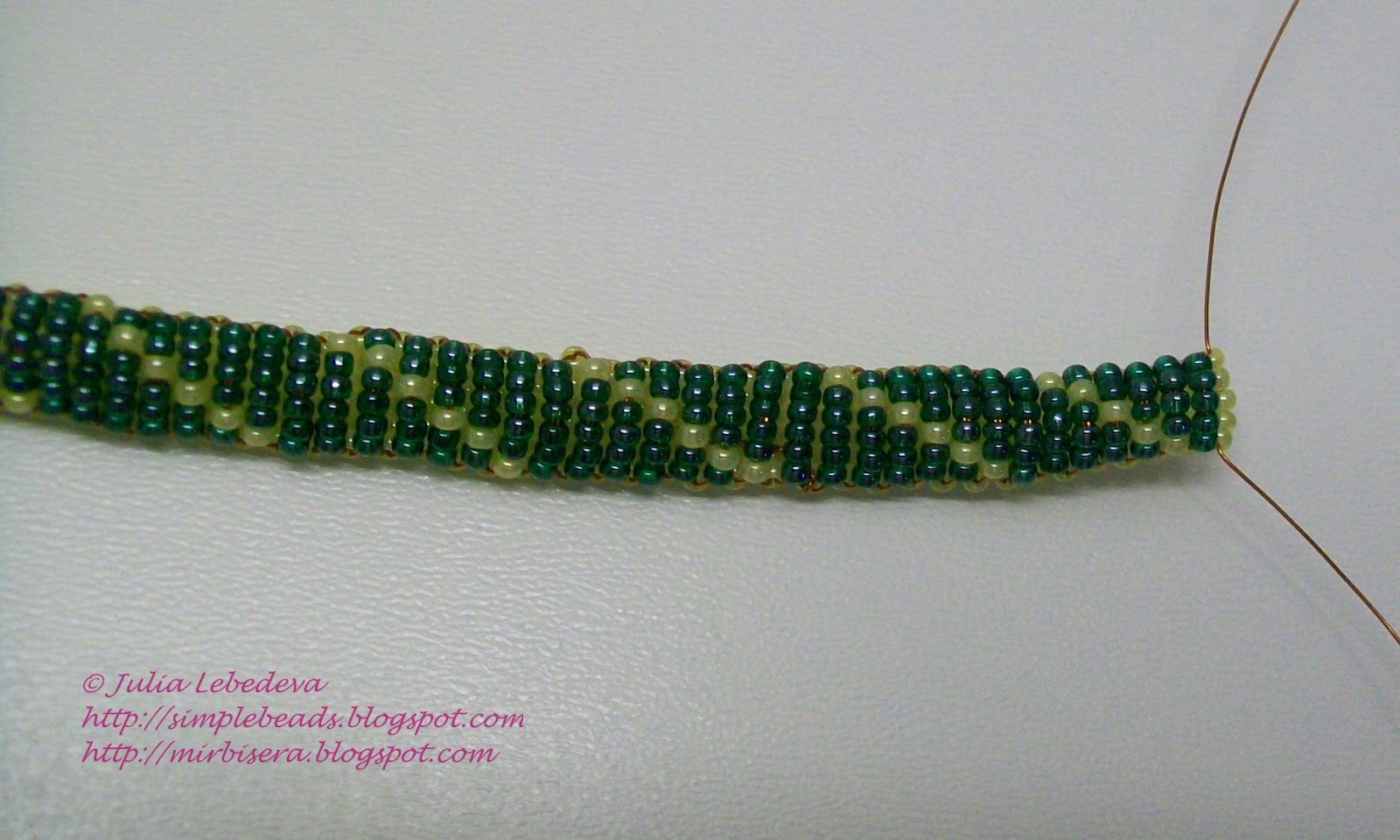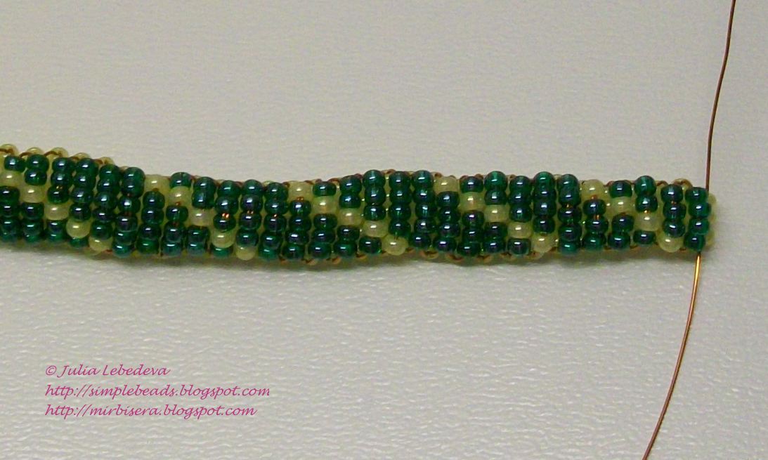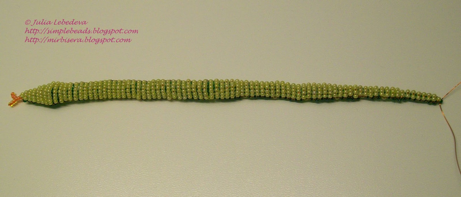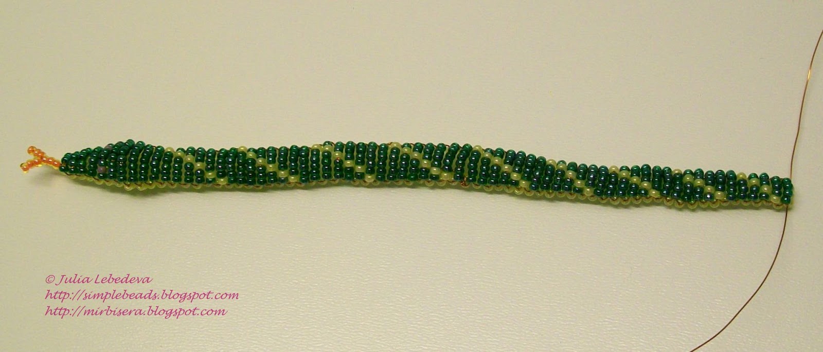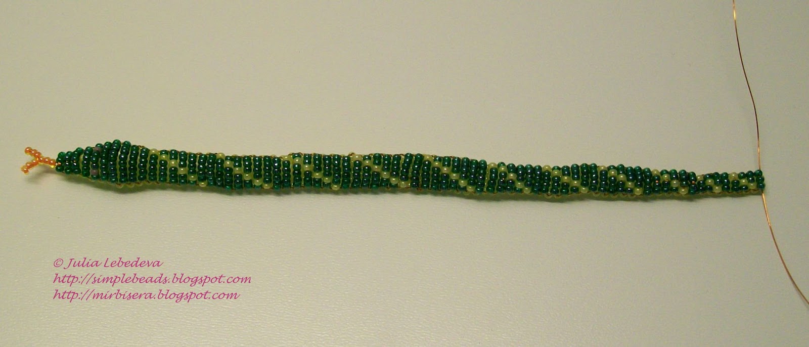 Далее на спинке змеи начинаем делать рисунок. Поскольку он несимметричен, надо выбрать один конец проволоки, и в каждом ряду набирать бисеринки только на этот конец проволоки, иначе рисунок собьётся. Итак, выбираем один из концов проволоки (у меня это - правый) и набираем бисеринки только на него, а другой конец проволоки будем только пропускать через набранные бисеринки.