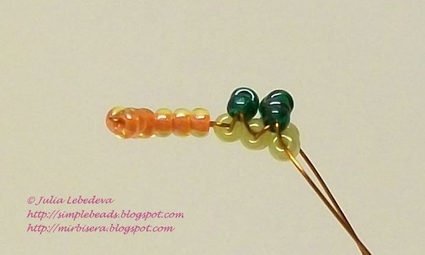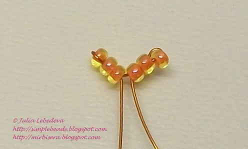 Далее набираем на один из концов проволоки ещё 3 оранжевые бисеринки.