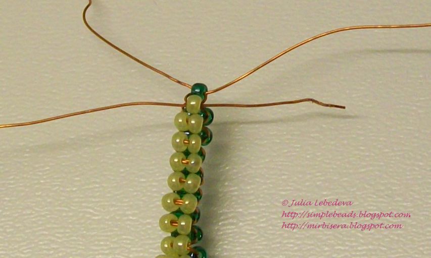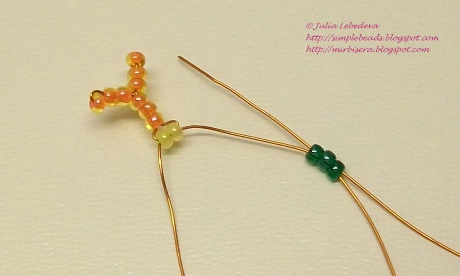 Верхний ярус - набираем бисеринки на проволоку в следующем порядке: 4 зелёные, 1 жёлтая, 1 зелёная.