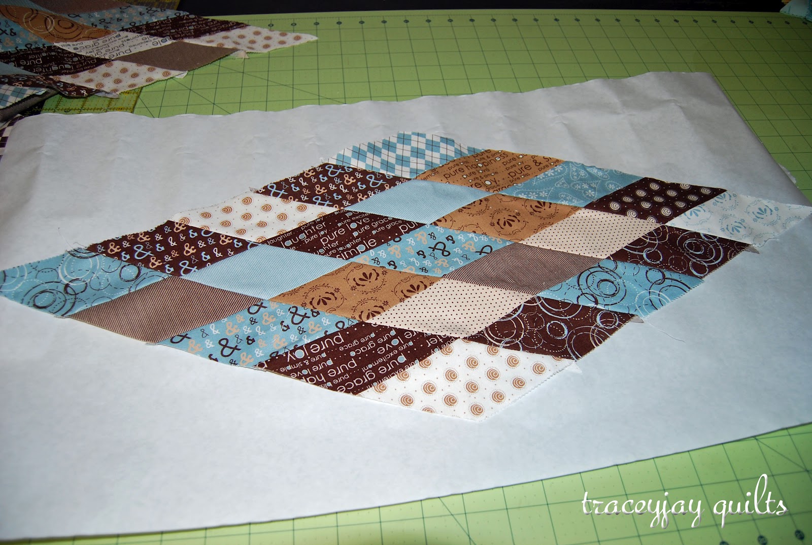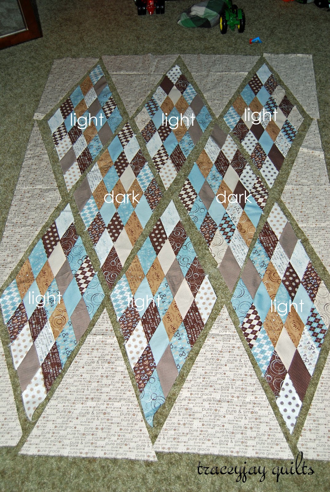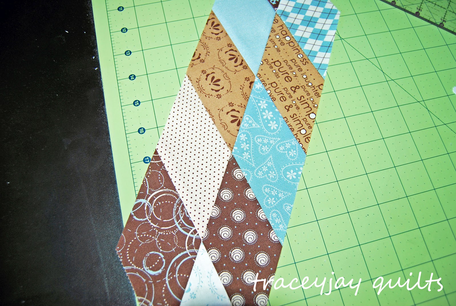- Make eight diamond blocks (each with five strip pieced sections -- see pic directly below for what a finished block looks like)