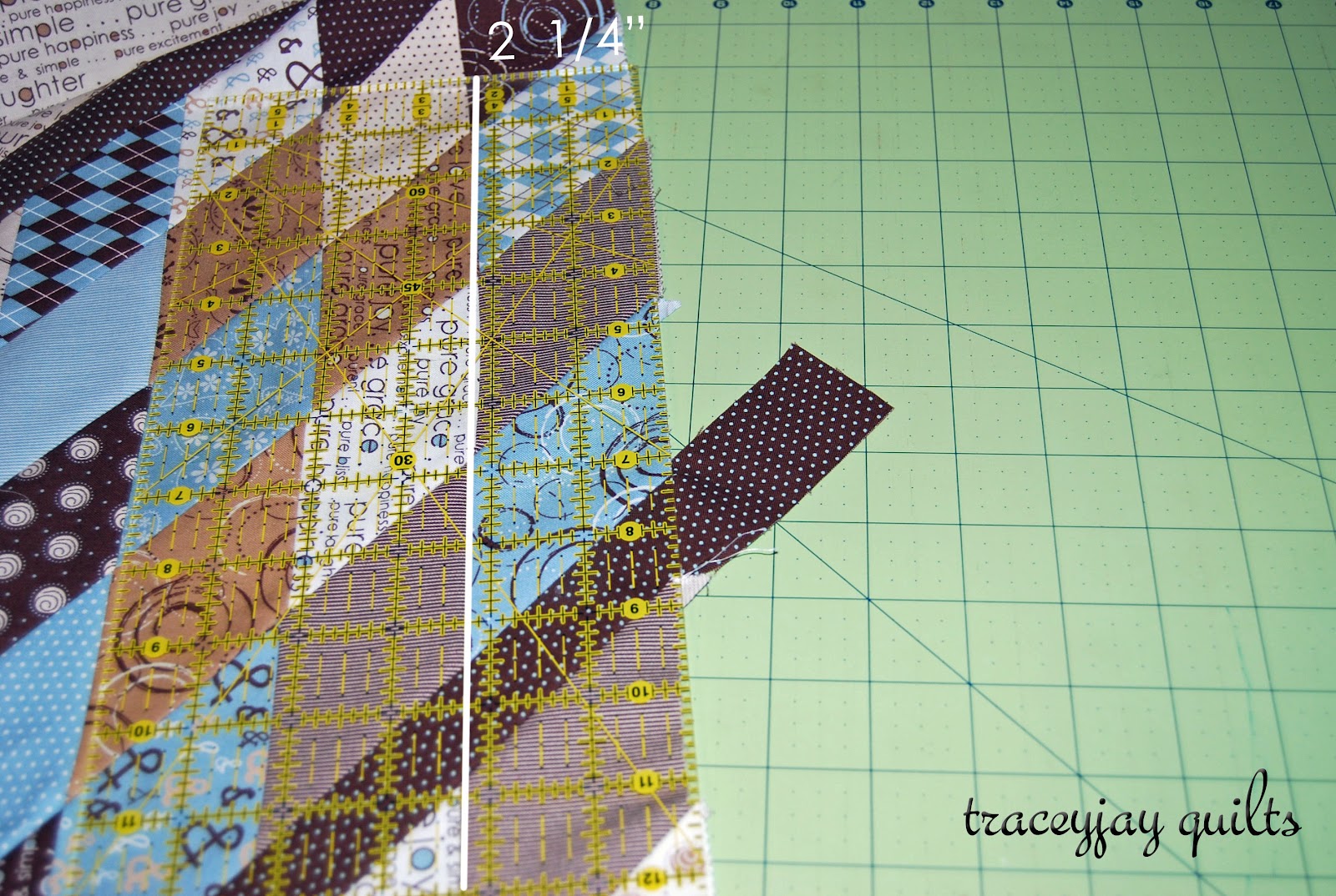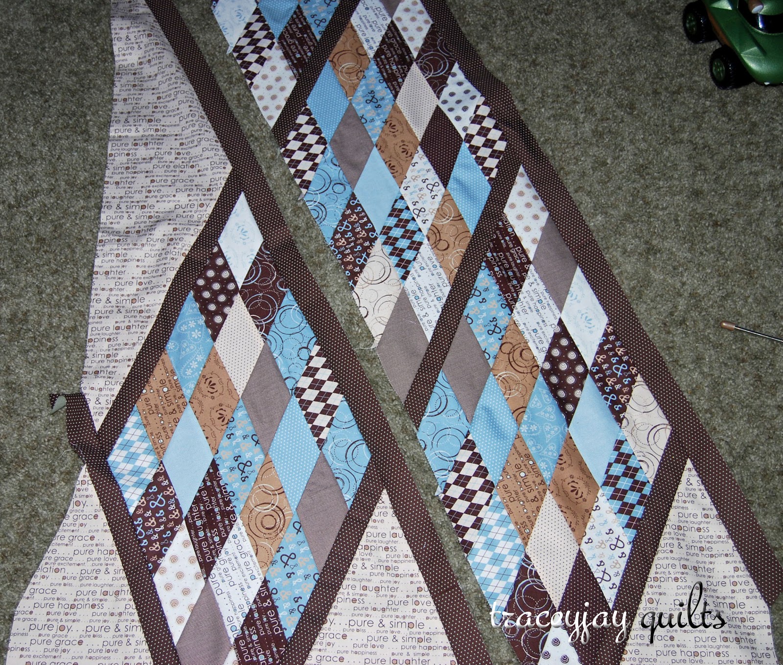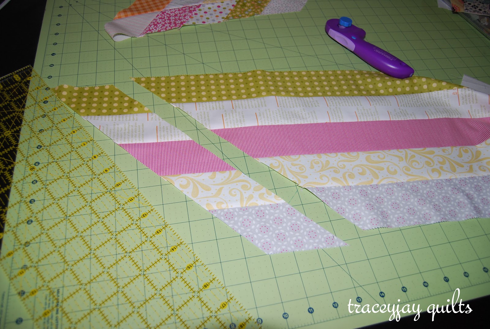 - Make eight diamond blocks (each with five strip pieced sections -- see pic directly below for what a finished block looks like)