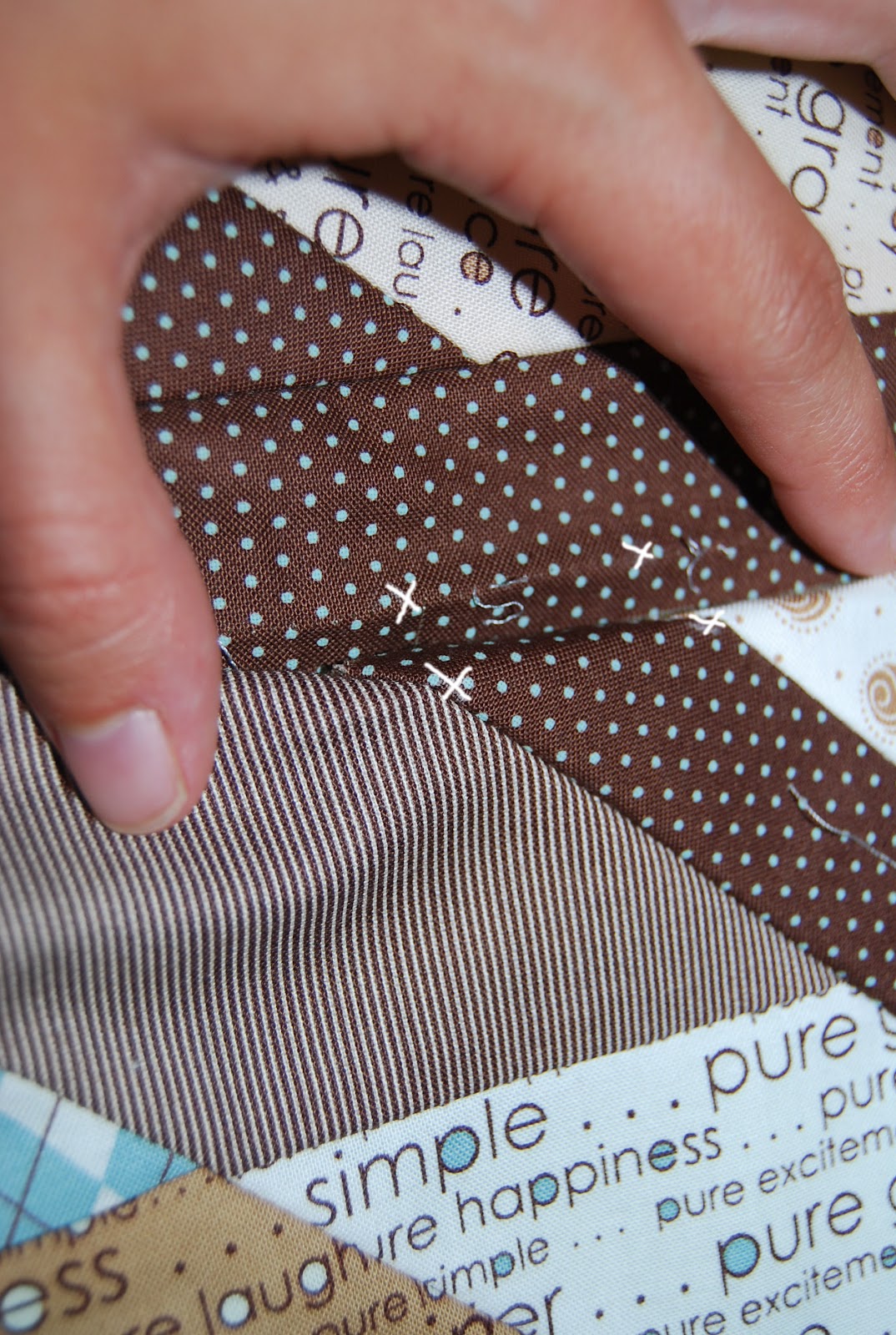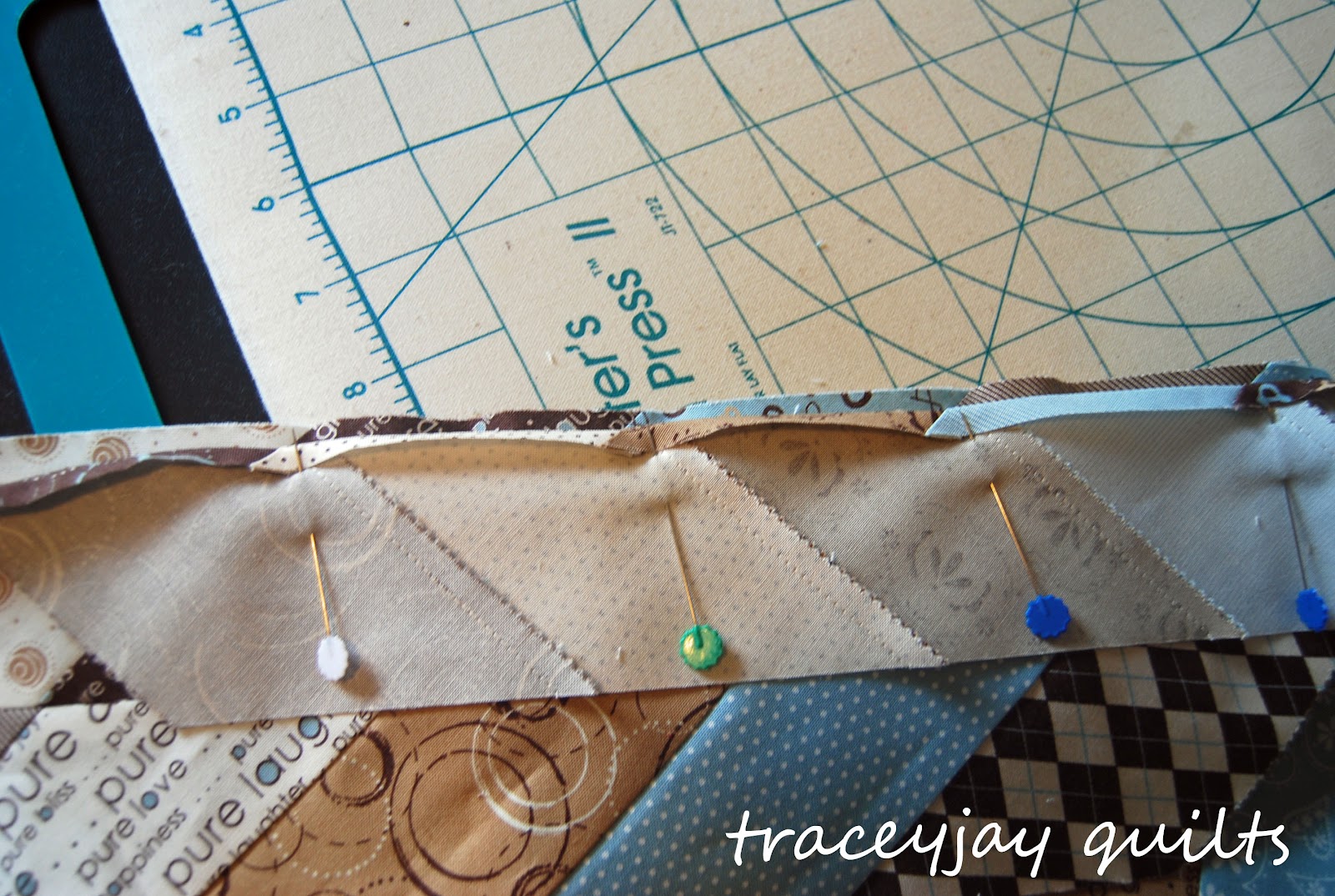It can be tricky to join the rows of diamonds lined up when adding the sashing -- I pressed a 1/4" seam along one edge (similar to when joining the strip-pieced sections for the blocks), and then used a pencil to mark where the sashing needed to line up in order to make a straight line of the "short" edges. (This is another one of those spots I mentioned earlier where I did some "winging it," and you might be able to tell from the picture that particular seam was ripped at least once so I could get it right.)