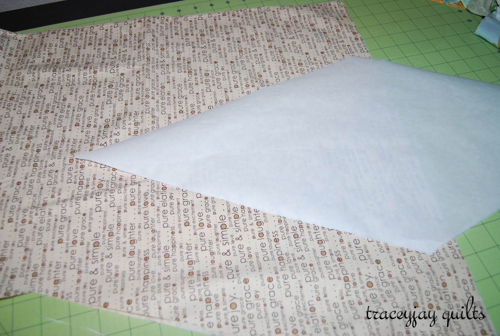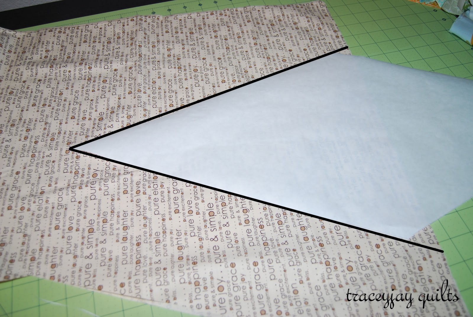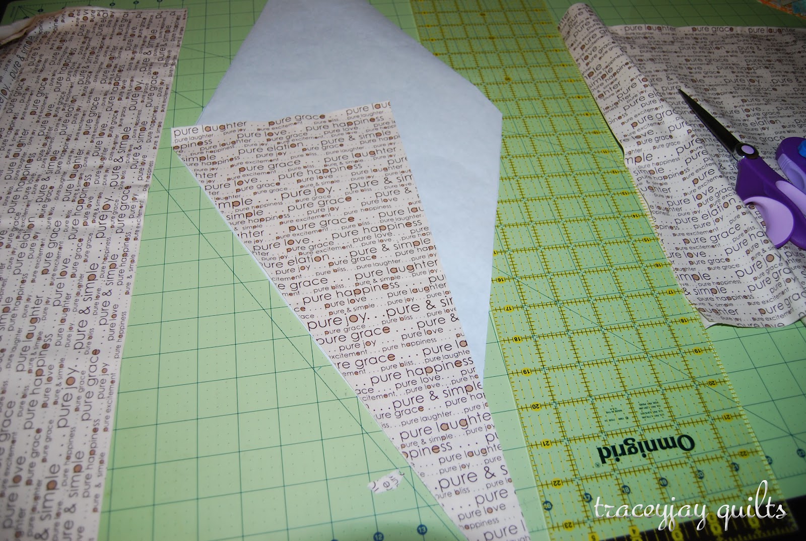 Using the template, you need to make setting triangles for your sides, corners, and top/bottom. Depending on your fabric choice (if it is directional or not), you will need to pay attention to how you orient your template. I like freezer paper because I can just iron it down, and then use the rotary cutter to cut my setting triangle.