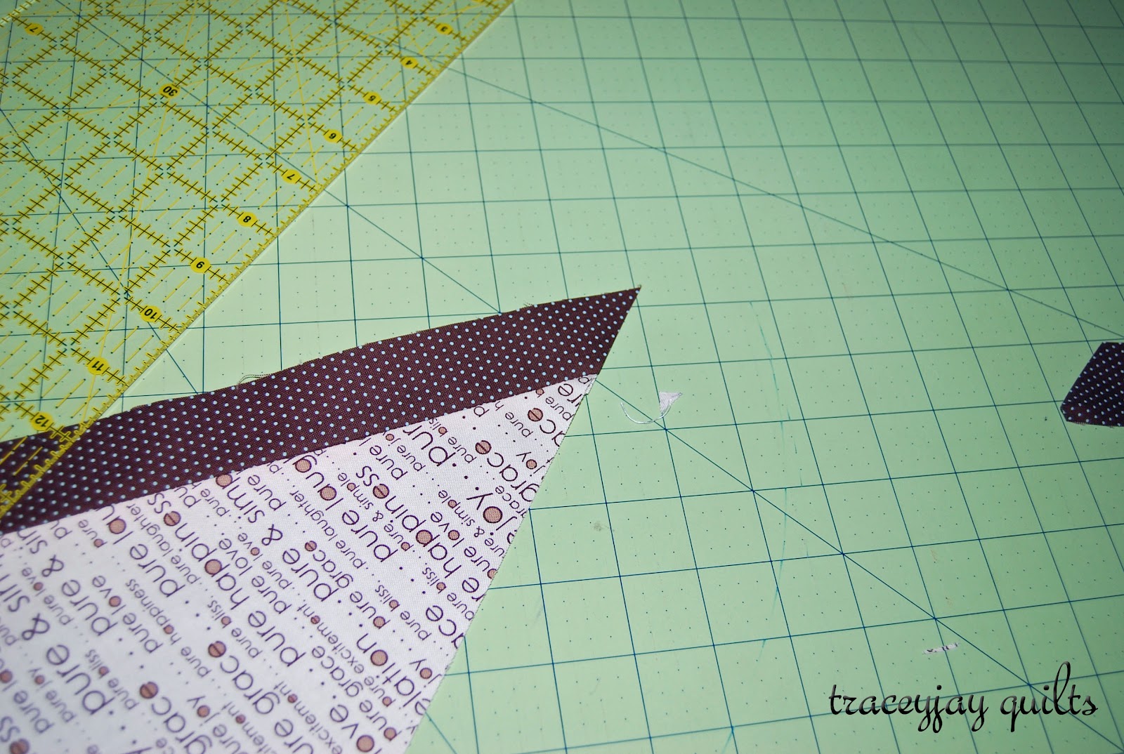 Sew a length of sashing along the "short" edge of your setting triangles or block. The end of the sashing will extend past the end of the triangle or block. Use your ruler to trim the edge.