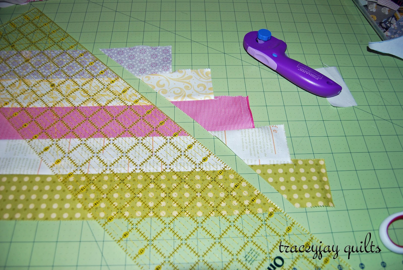 Cut and piece 1 1/2" strips long enough for your length of sashings. You will need some "short" sashing strips (that go along the edge of the blocks/setting triangles in one direction, and some "long" (that go along the edge of the rows to join the rows together). Use your template, or measure the edge of your block, and make sure there is enough length to fully extend past the edge, so it can be trimmed later (this is important when dealing with bias edges.