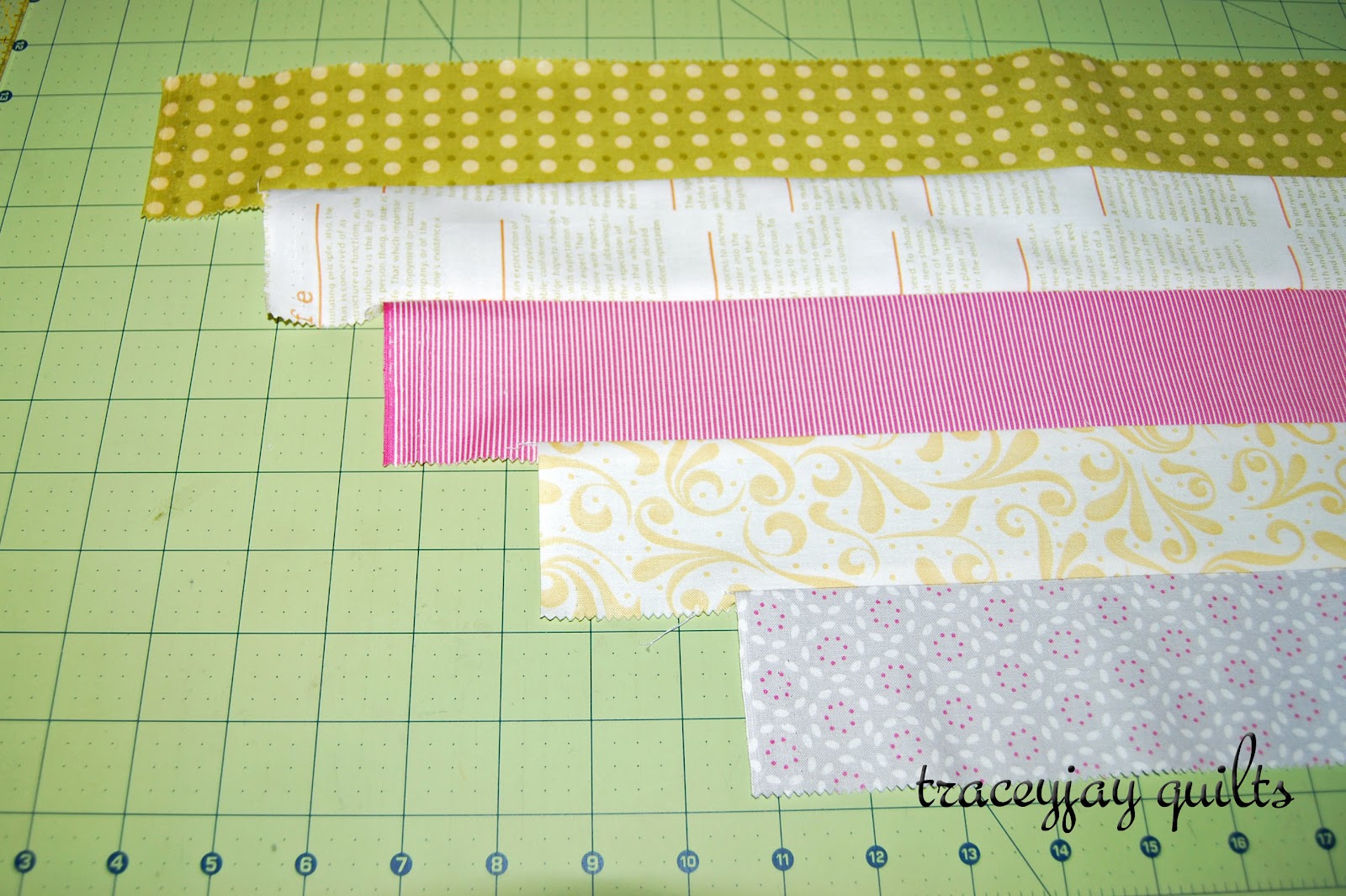 - Group in to sets of five, following the pattern of dark/light/dark/light/dark and light/dark/light/dark/light. If your sashing is dark in value, you will need three sets with light on the outside, and two sets with darks on the outside. Switch if your sashing is light (like in the Sunkissed example), and make more groups with dark on the outside (twenty-five strips total, with thirteen light and twelve medium or dark -- reverse if using light sashing). The picture below shows a set of strips that are dark/light/dark/light/dark.