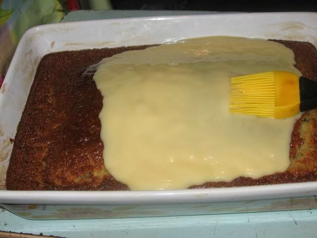Ещё горячим смазываем его сгущёнкой. Стакана будет в самый раз, но хватит и половины стакана.