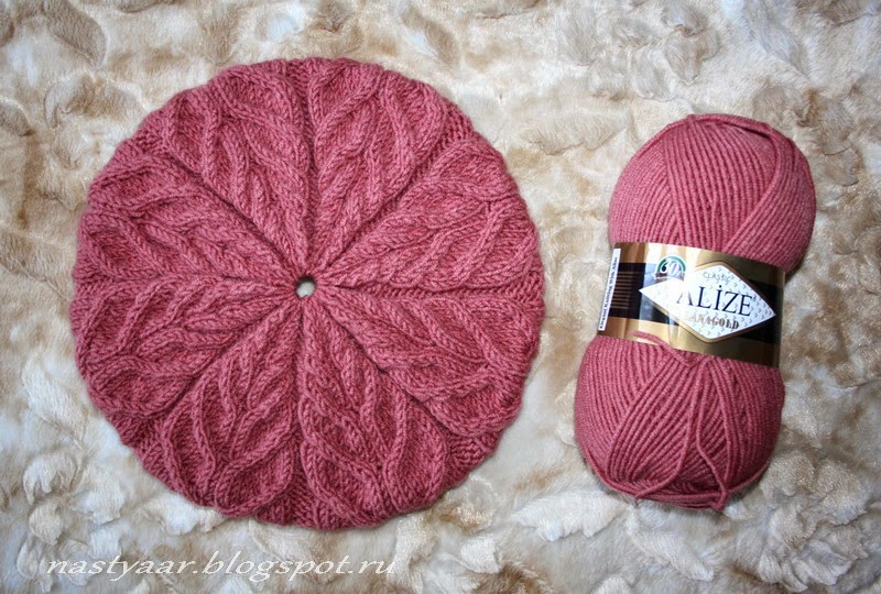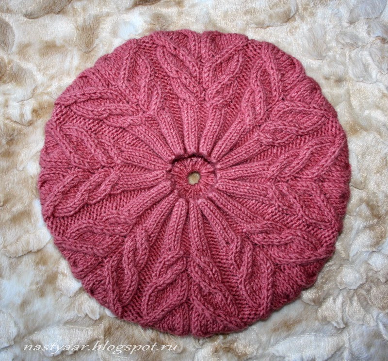 Мой берет после стирки и сушки на тарелке(пряжа Alize lanagold 240 м 100 гр, спицы № 3 на резинку,№ 3,5 на рисунок, набирала 120 п, ОГ-56 см):