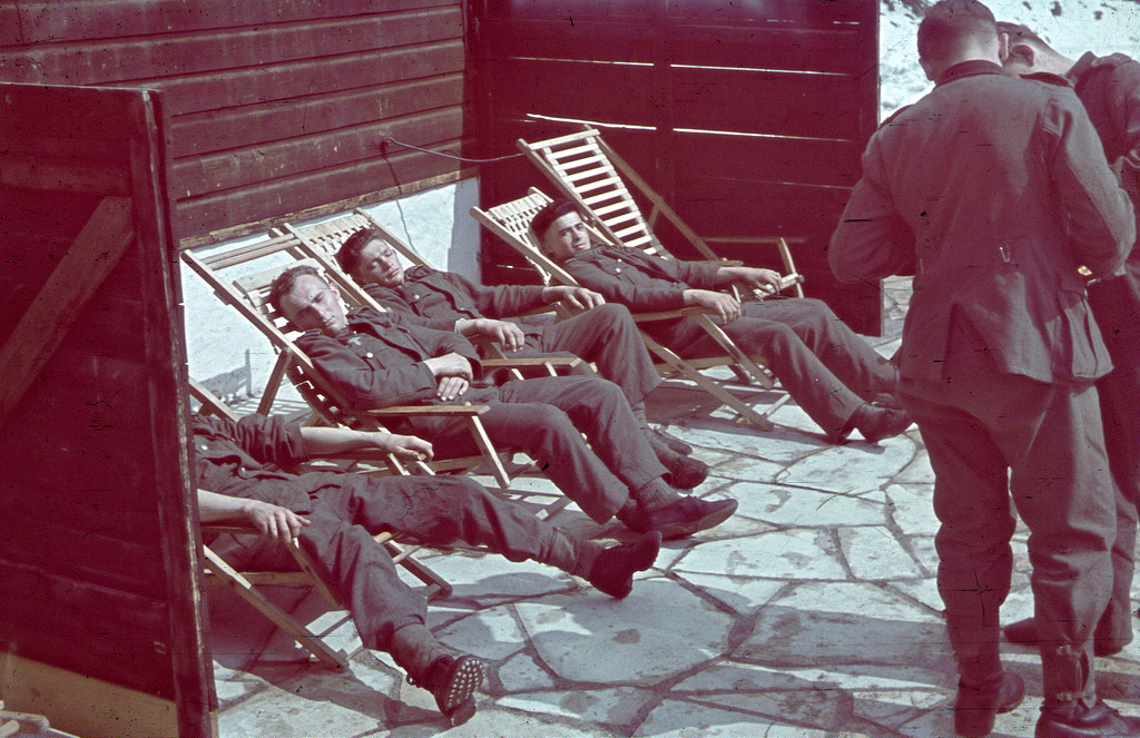 Горные солдаты вермахта на отдыхе в шезлонгах у охотничьего домика |