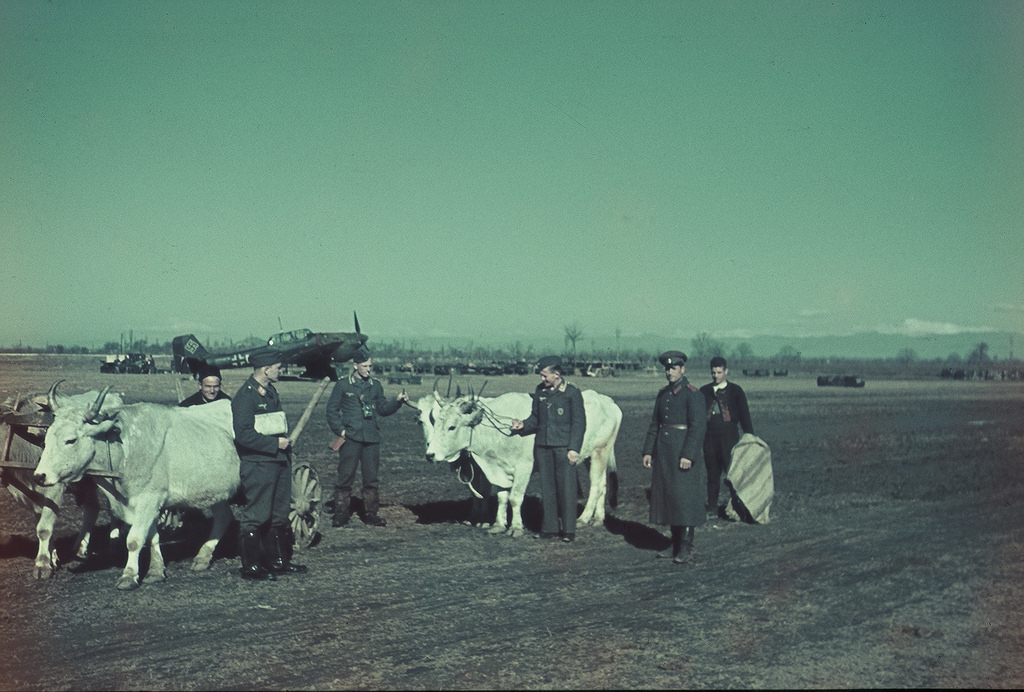Немецкие летчики с крестьянином и волами на одном из аэропортов Болгарии |