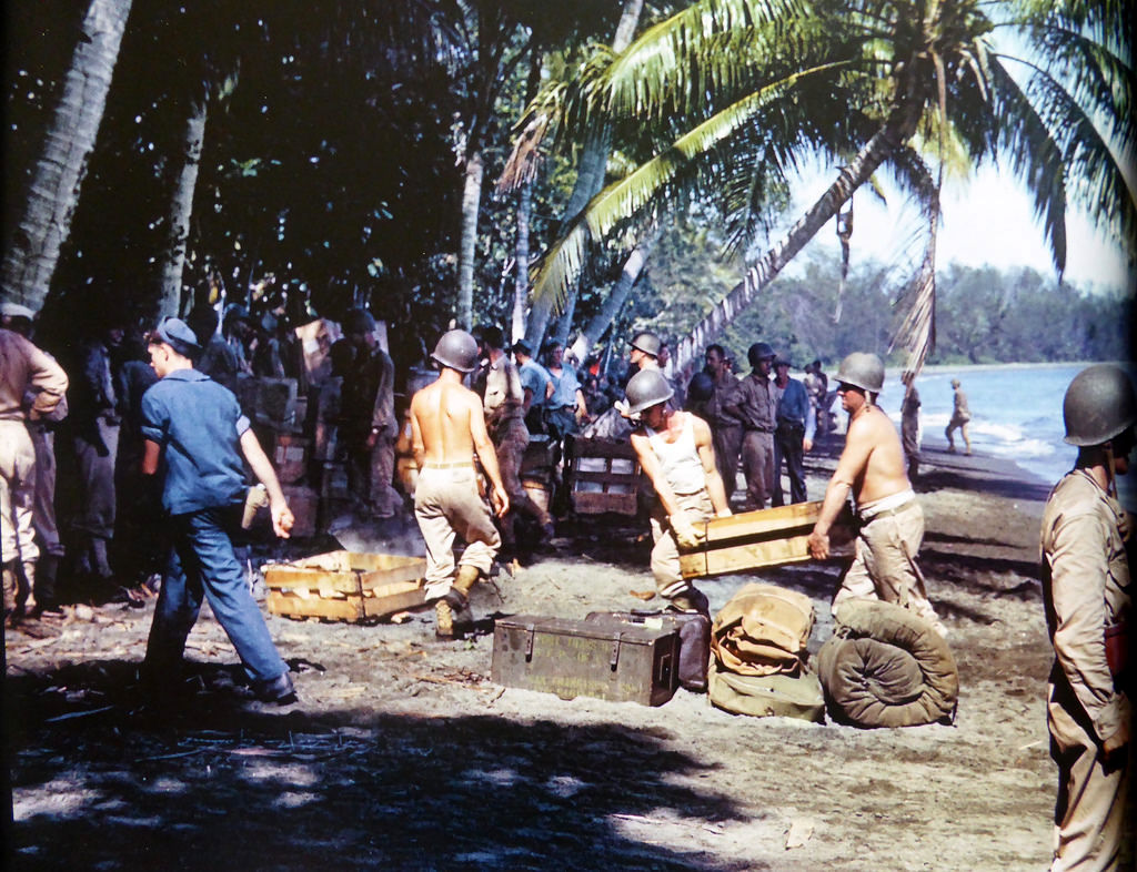 Американские солдаты и моряки разгружали боеприпасы и магазины на берегу Гуадалканал, 1942 |