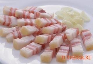 Сало режем длинными кусками, шпигуем чесноком (надрезая кармашки).
