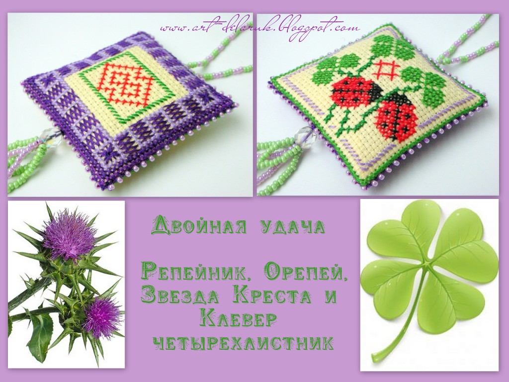 А до этого была вот такая двухсторонняя подушечка-подвеска с Репейником и Орепеем, которая уже месяц исправно служит своей новой хозяйке. Она попроще в исполнении...без выпендрежа, но как всегда с соблюдением всех правил и с душой)))