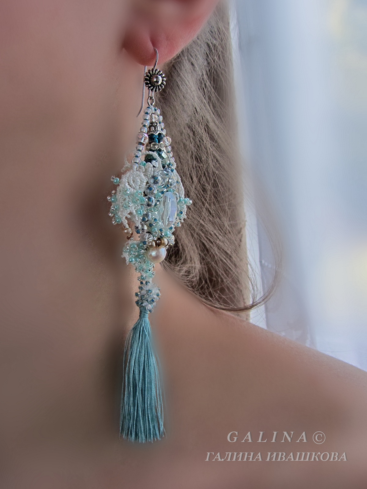 Cерьги Небесные. Ручная вышивка. Общая длинна с кистью и швензой 12,5 см. Вышитый элемент 4 х 4,5 см. Вышивка двусторонняя.