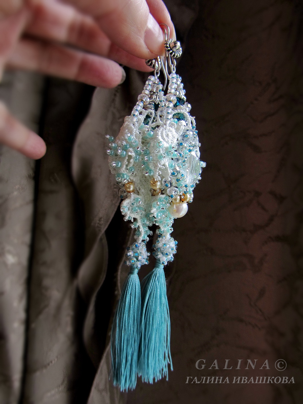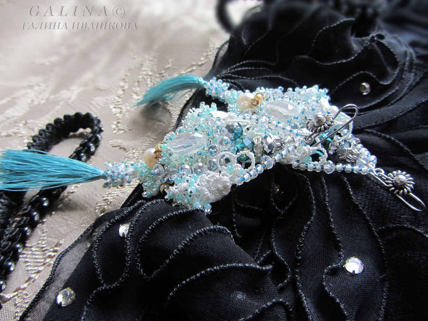 В работе использованы чешский бисер, пайетки, стеклярус, хрустальные бусины, жемчуг натуральный, речной жемчуг, стразы, шёлковые нитки, шёлковый шнур, металлофурнитура тибетское серебро, кружево винтажное, ,капроновые нитки.