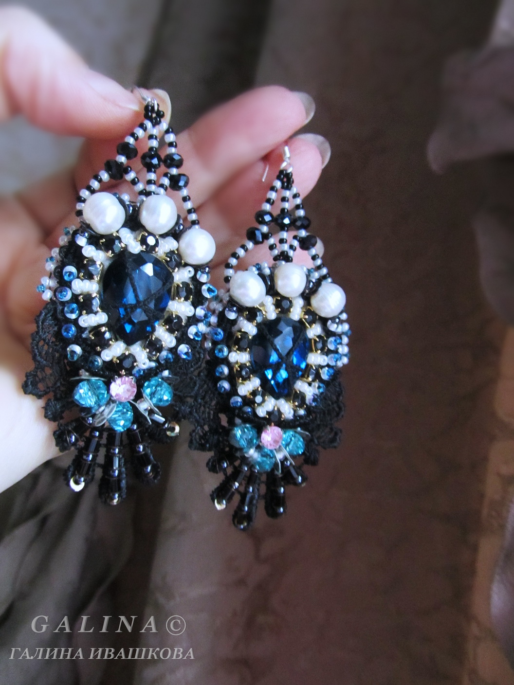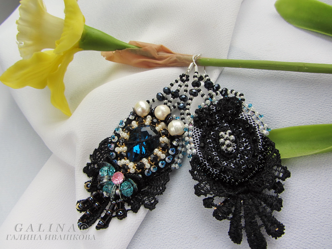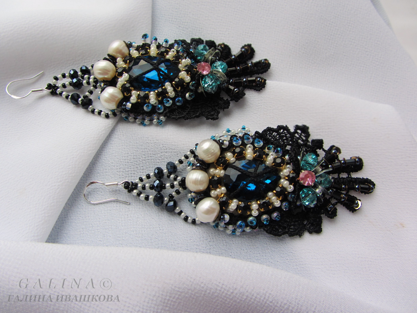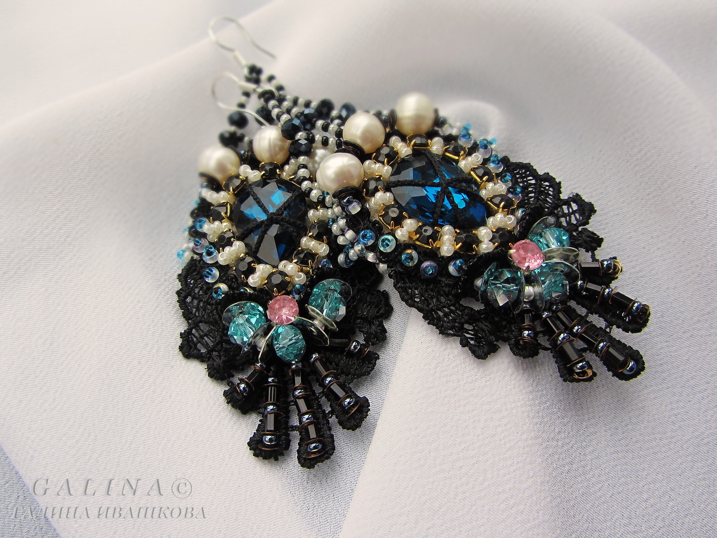В работе использованы чешский бисер, хрустальные бусины, жемчуг натуральный, жемчуг Сваровски, бусины ювелирное стекло, шёлковые нитки, кружево винтажное, стеклярус, сетка, кристаллы, стразовая лента, мелкие золотые и чёрные пайетки, капроновые нитки.