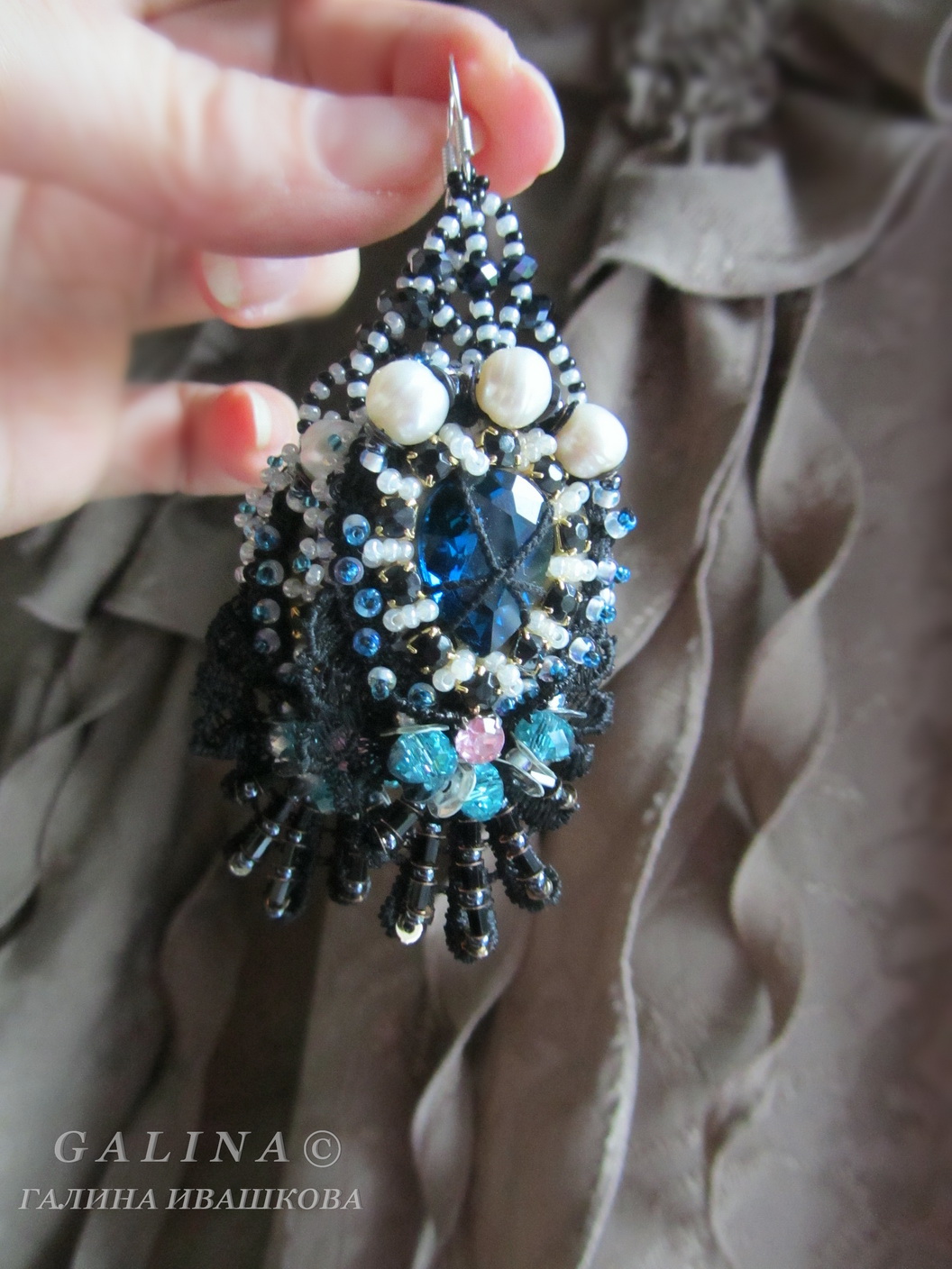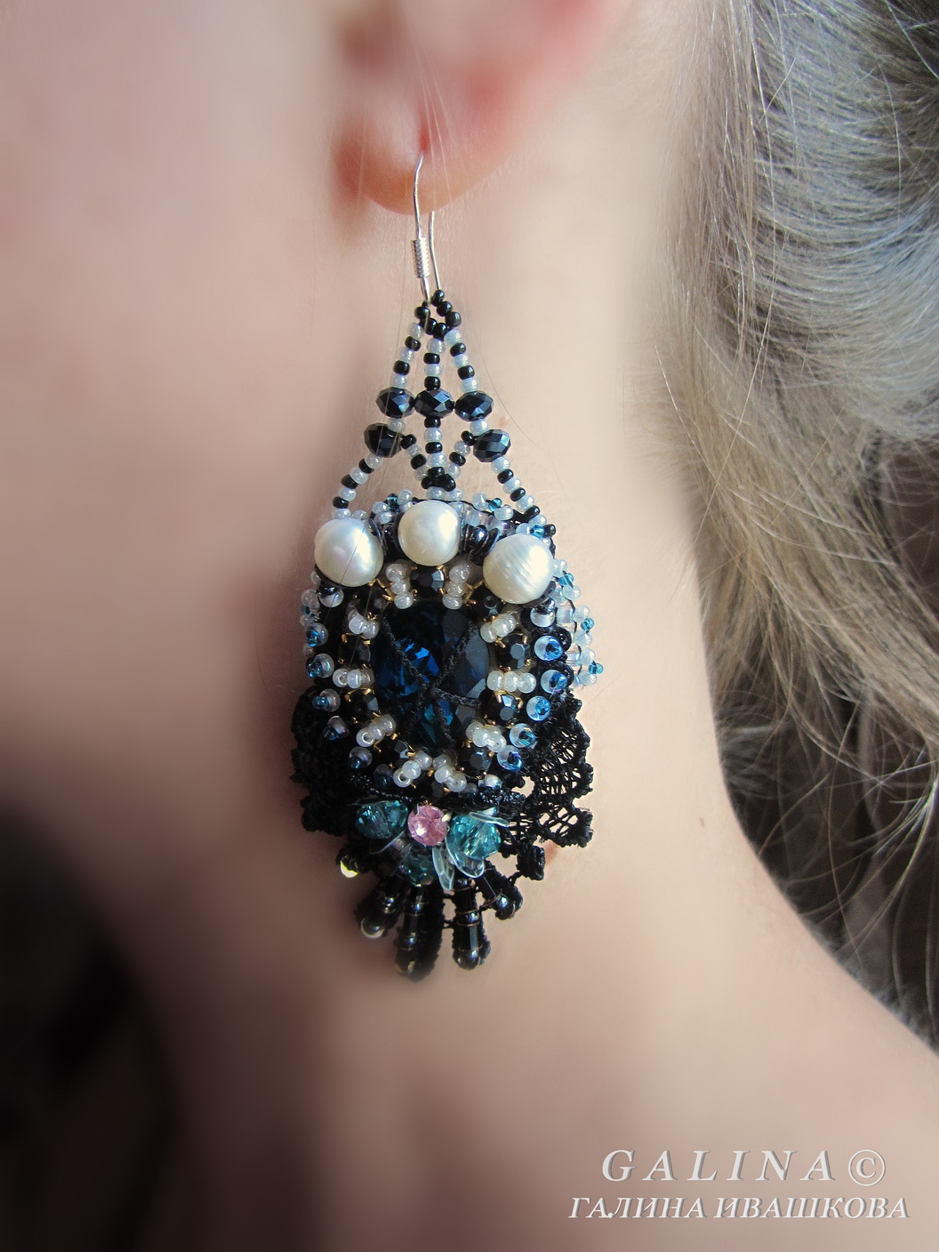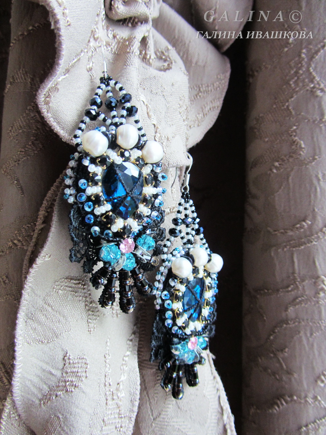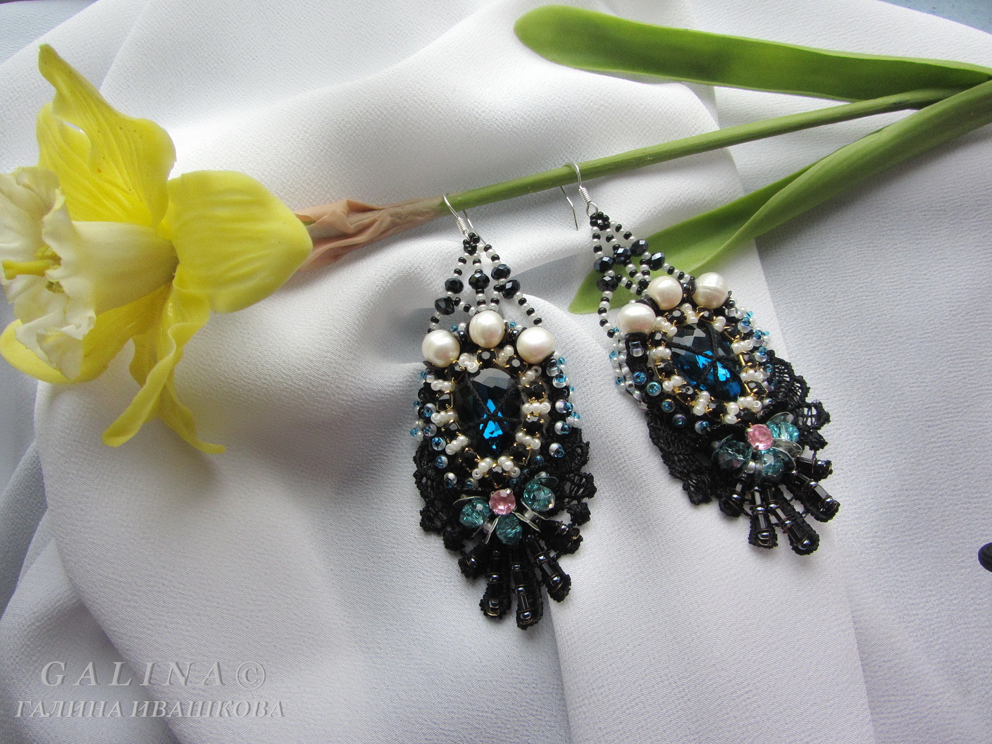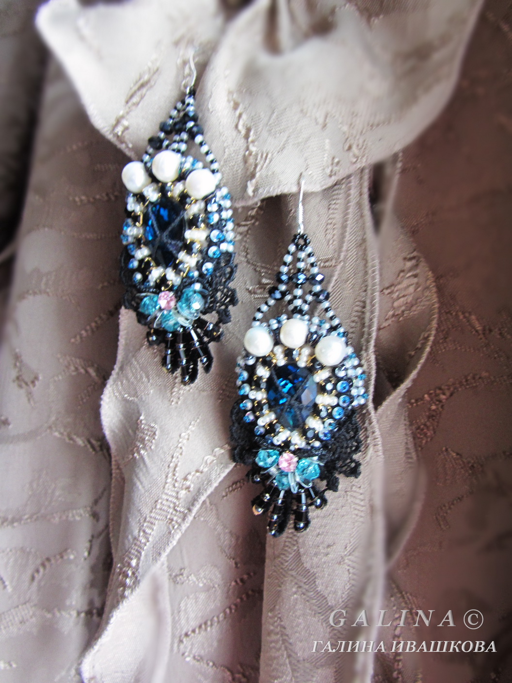 В работе использованы чешский бисер, хрустальные бусины, жемчуг натуральный, жемчуг Сваровски, бусины ювелирное стекло, шёлковые нитки, кружево винтажное, стеклярус, сетка, кристаллы, стразовая лента, мелкие золотые и чёрные пайетки, капроновые нитки.
