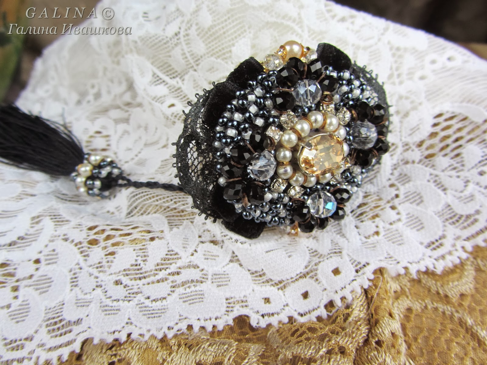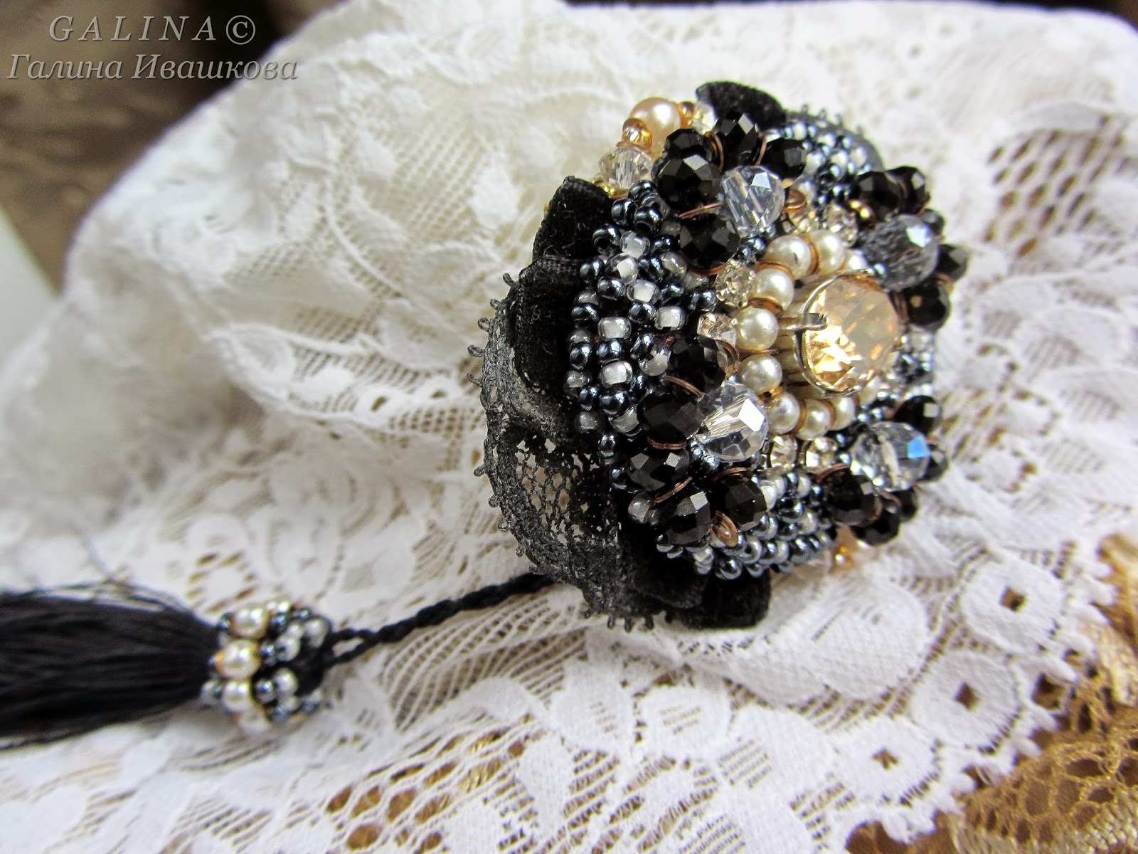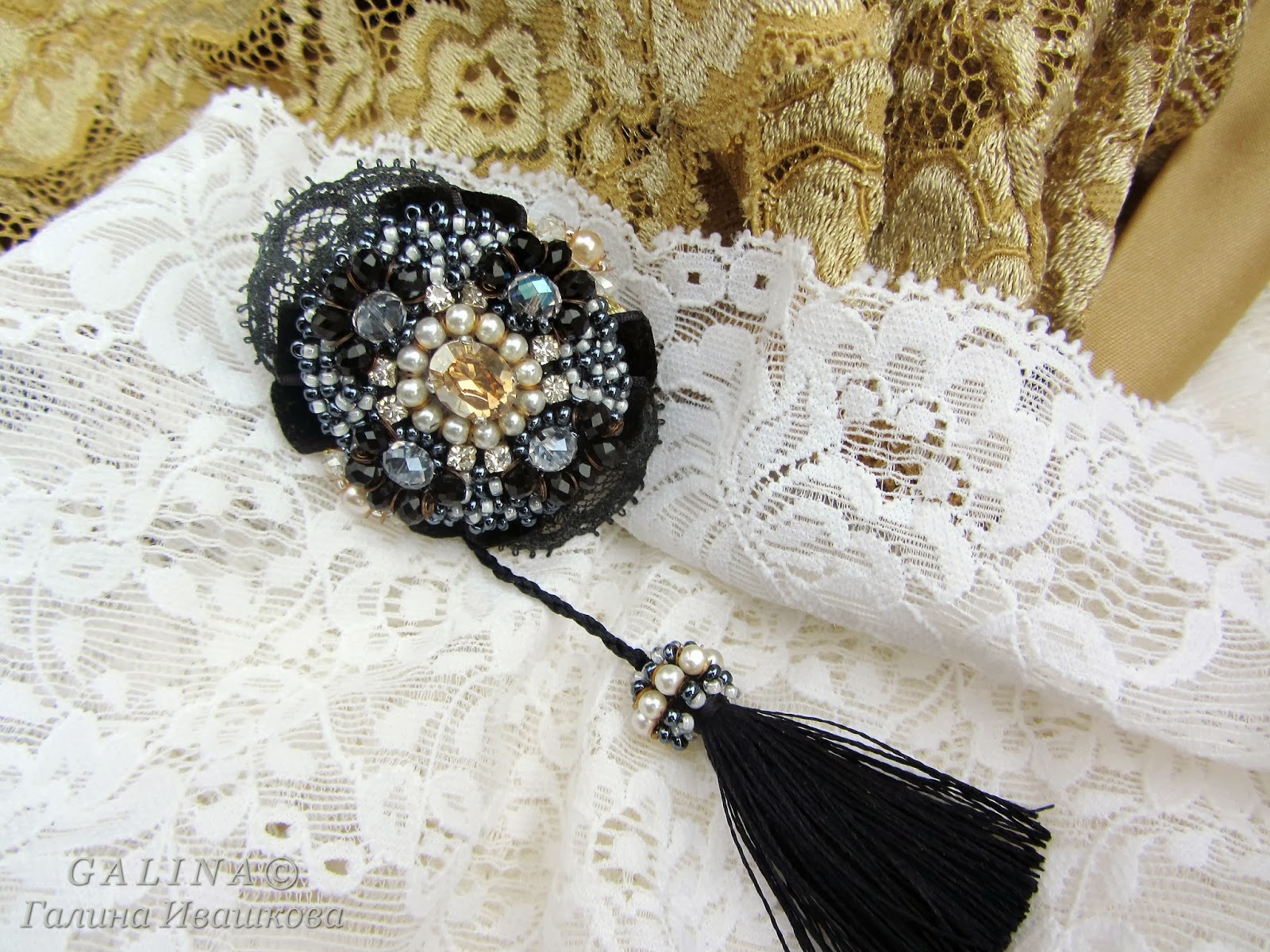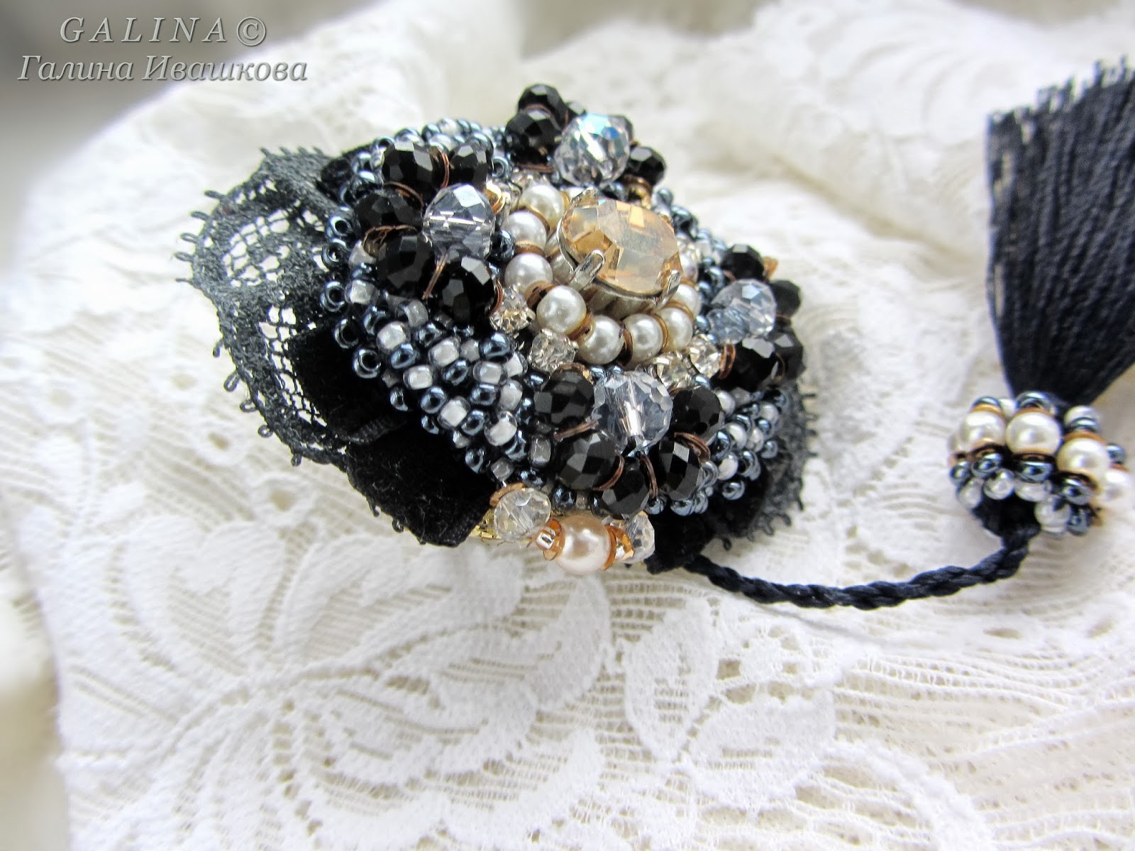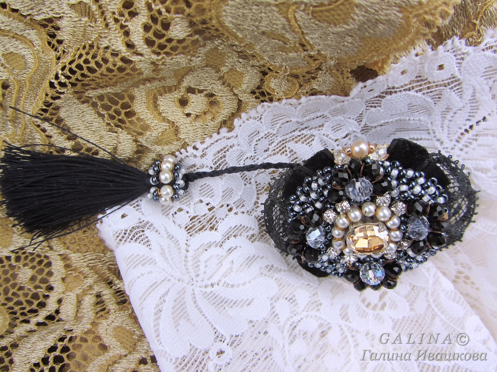 В работе использованы чешский и японский бисер, ювелирные кристаллы Сваровски, хрустальные бусины, пайетки японские золотистые, жемчуг Сваровски, французское кружево, металлизированная тесьма, сетка, кисточка - натуральный шёлк.