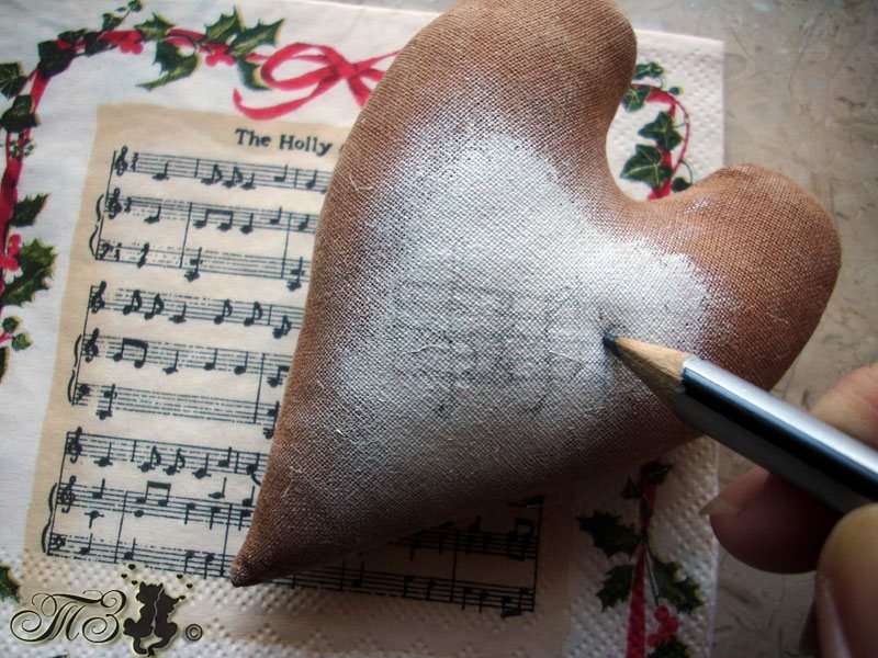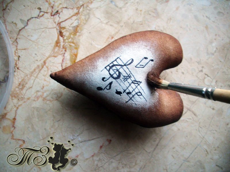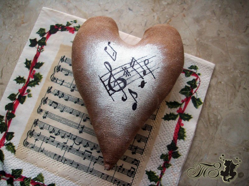 На вторую сторону сердечка можно приклеить фрагмент с другой салфетки, например, с нотами. А можно и нарисовать ноты самим. Вот так, как показано на фото.