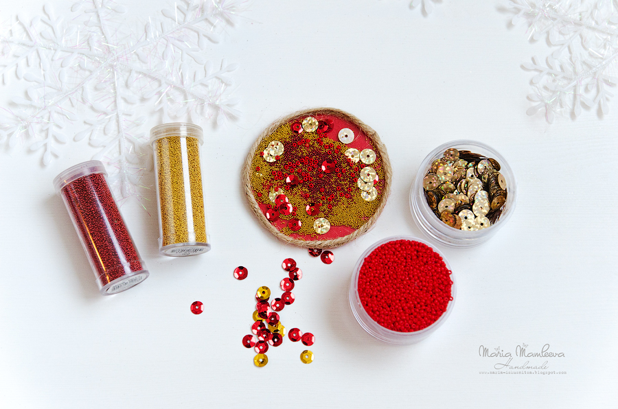 Внутрь засыпаем все, что душе угодно:) У меня нашелся микробисер двух цветов, золотые и красные пайетки и ярко красный бисер.