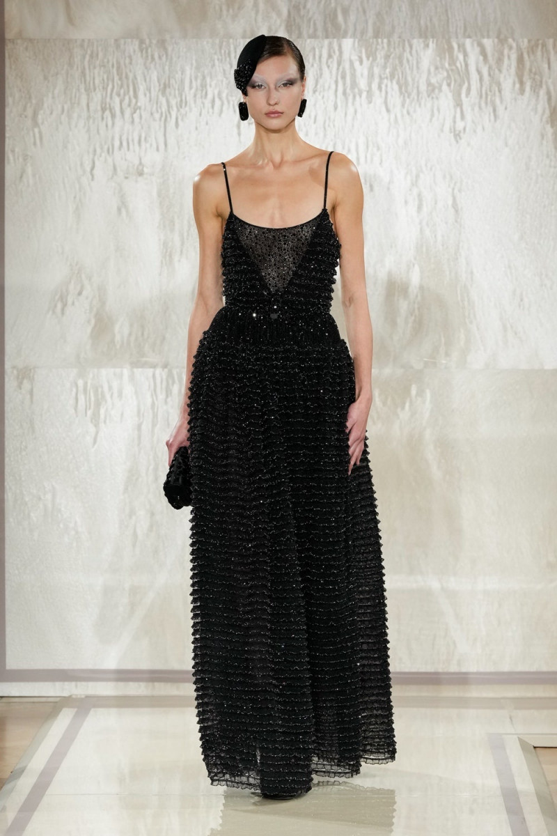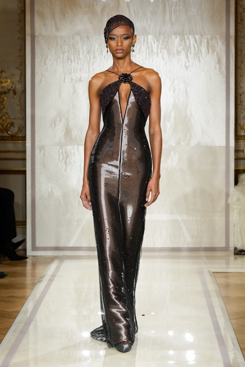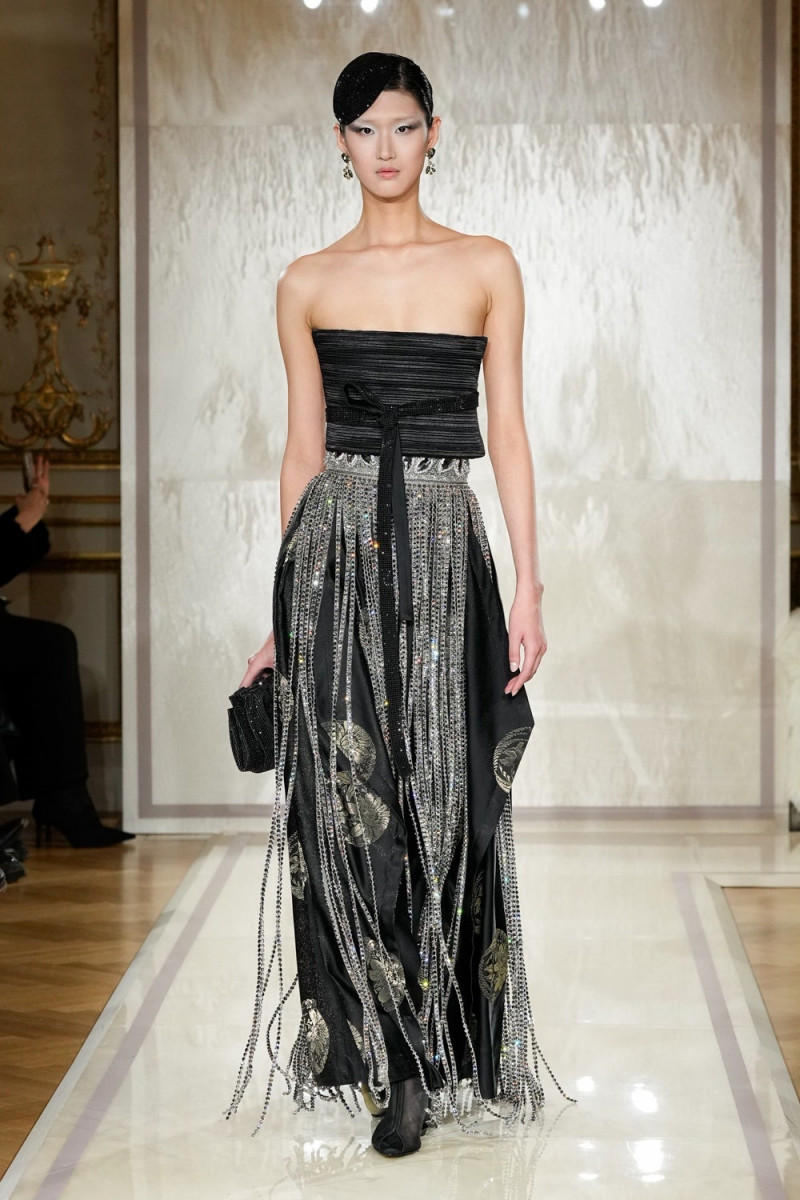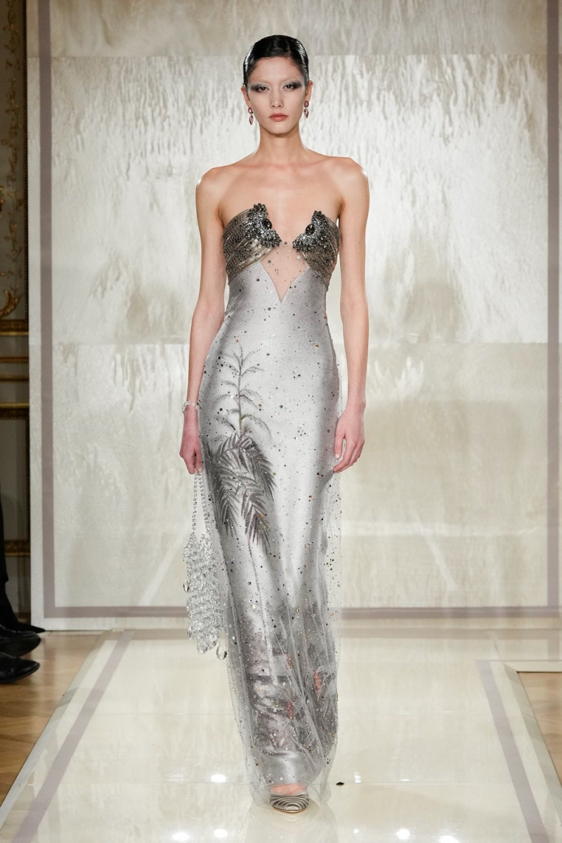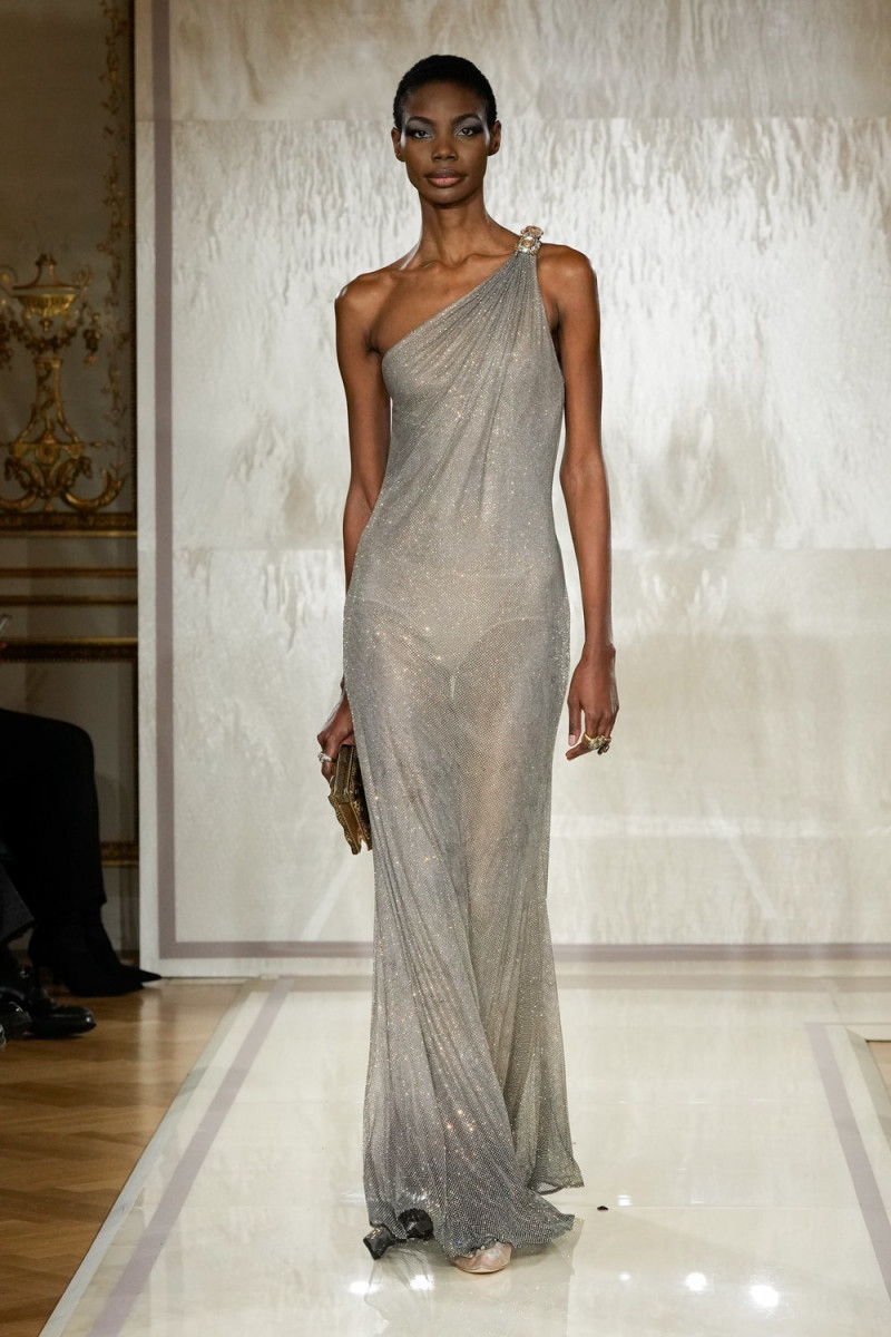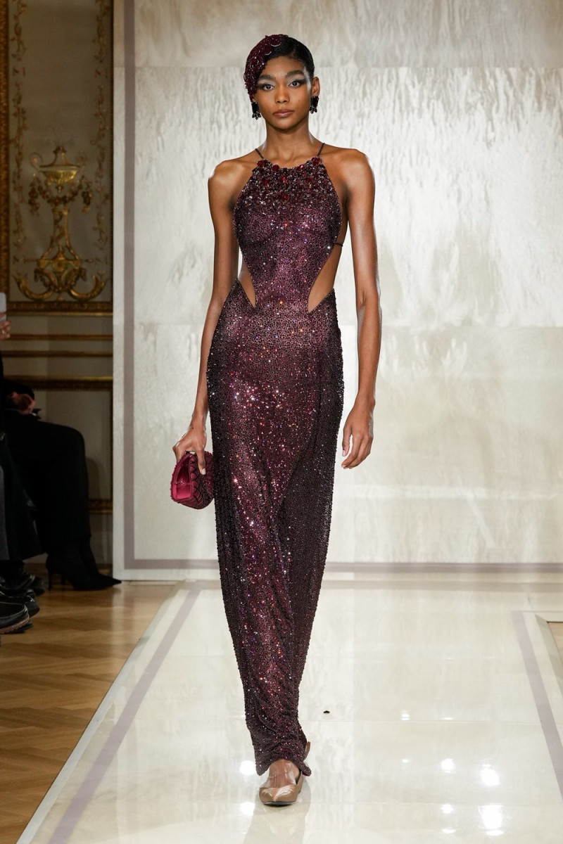 " Lumières Коллекция была исследованием сияния, пронизанного фирменной сдержанностью и утонченностью Армани. От жидких атласов, которые обволакивали тело, как расплавленное золото, до сложных, вышитых вручную сеток, накладывающихся на струящиеся брючные костюмы, одежда сияла тихим, но властным блеском. Блестящие платья со смелыми вырезами и драгоценными акцентами ловили свет при каждом движении, подтверждая непревзойденное мастерство Армани в создании элегантности без излишеств.