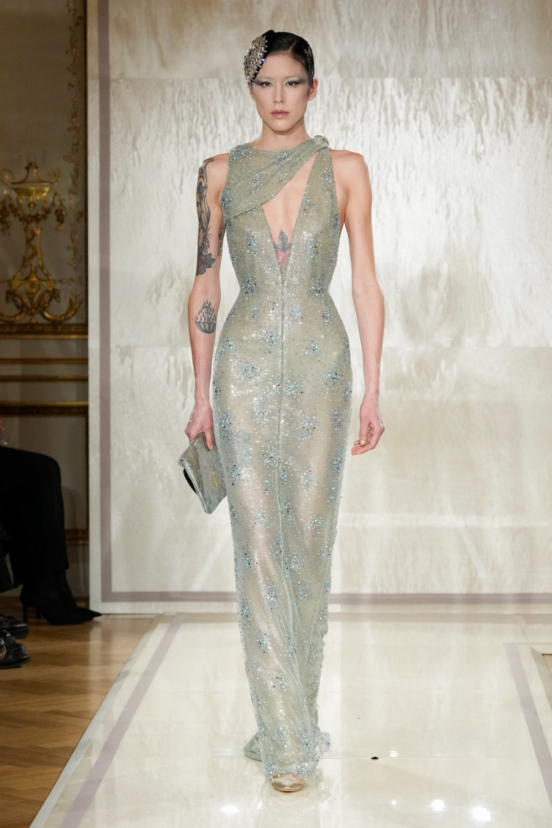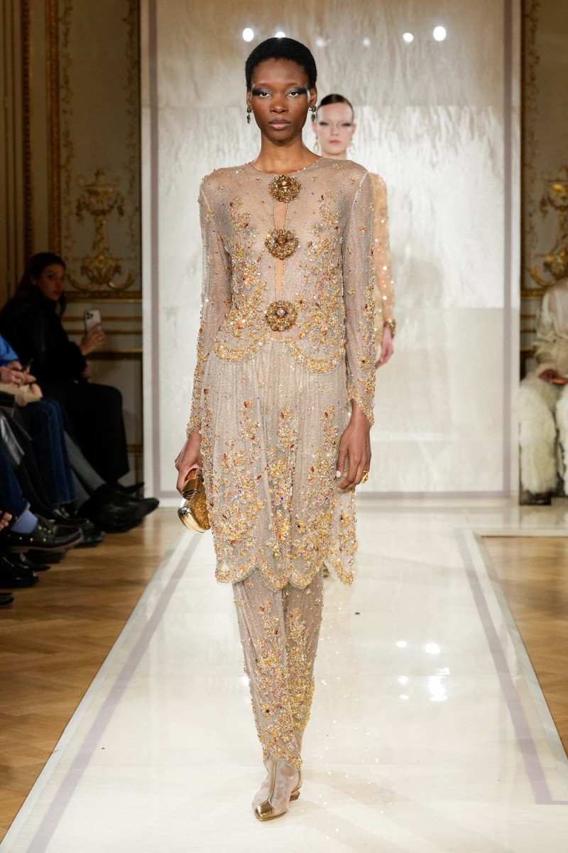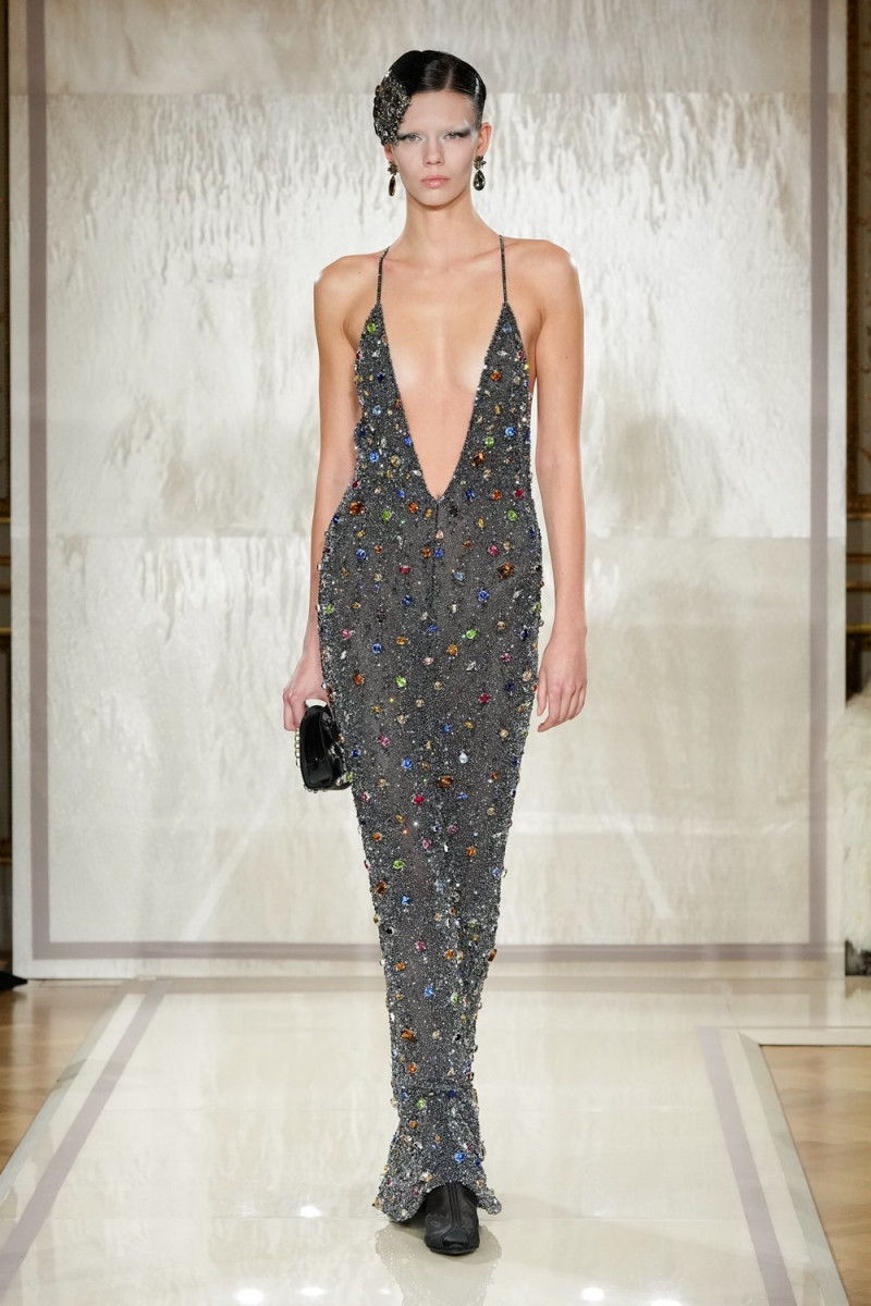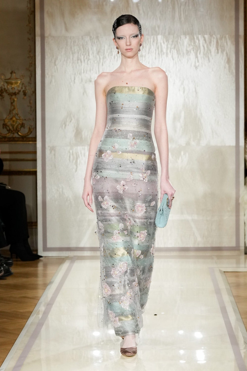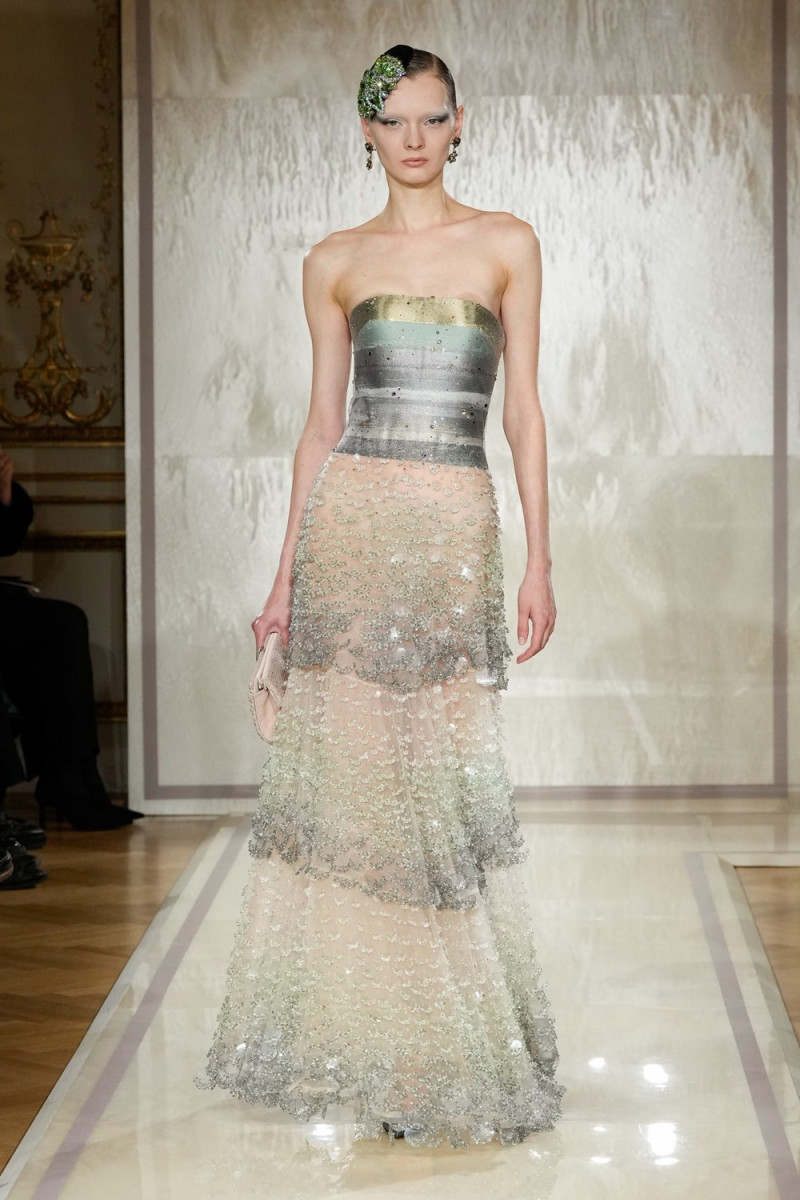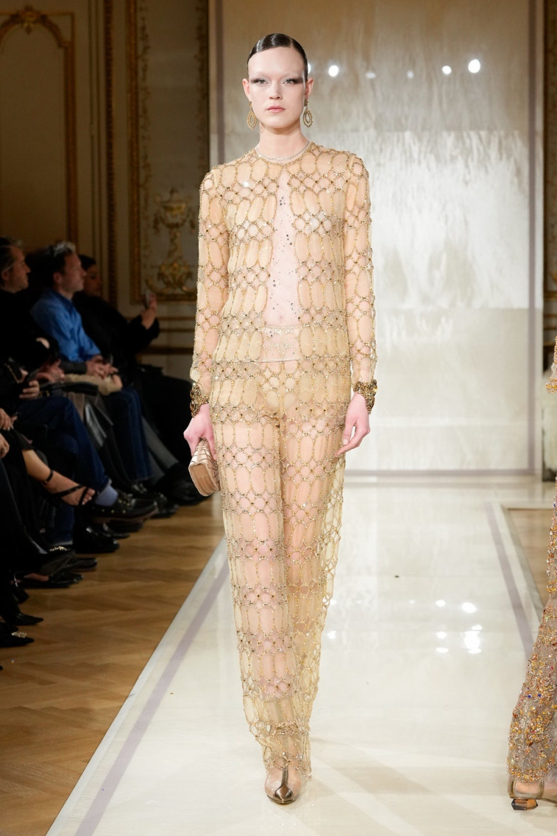 " Lumières Коллекция была исследованием сияния, пронизанного фирменной сдержанностью и утонченностью Армани. От жидких атласов, которые обволакивали тело, как расплавленное золото, до сложных, вышитых вручную сеток, накладывающихся на струящиеся брючные костюмы, одежда сияла тихим, но властным блеском. Блестящие платья со смелыми вырезами и драгоценными акцентами ловили свет при каждом движении, подтверждая непревзойденное мастерство Армани в создании элегантности без излишеств.