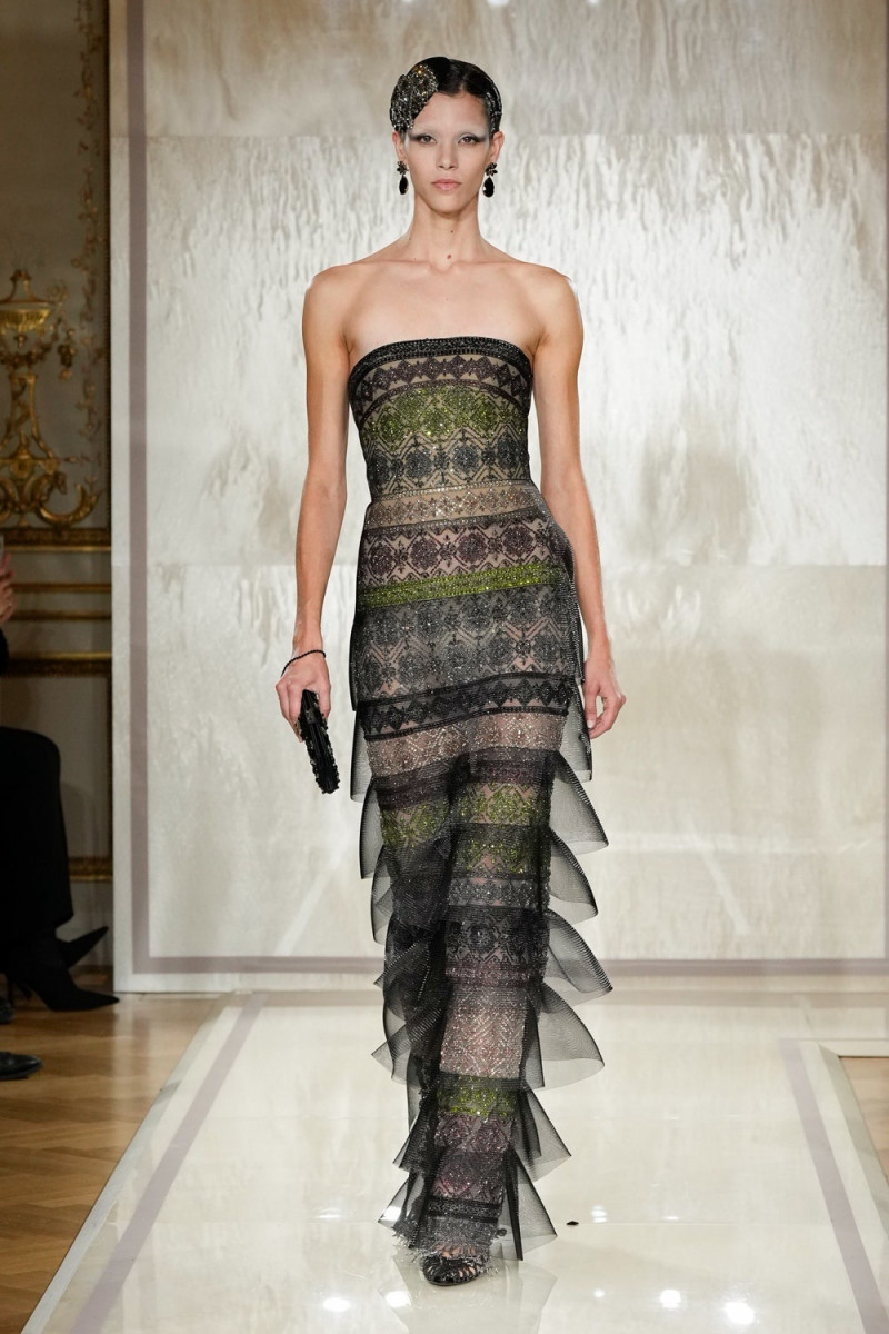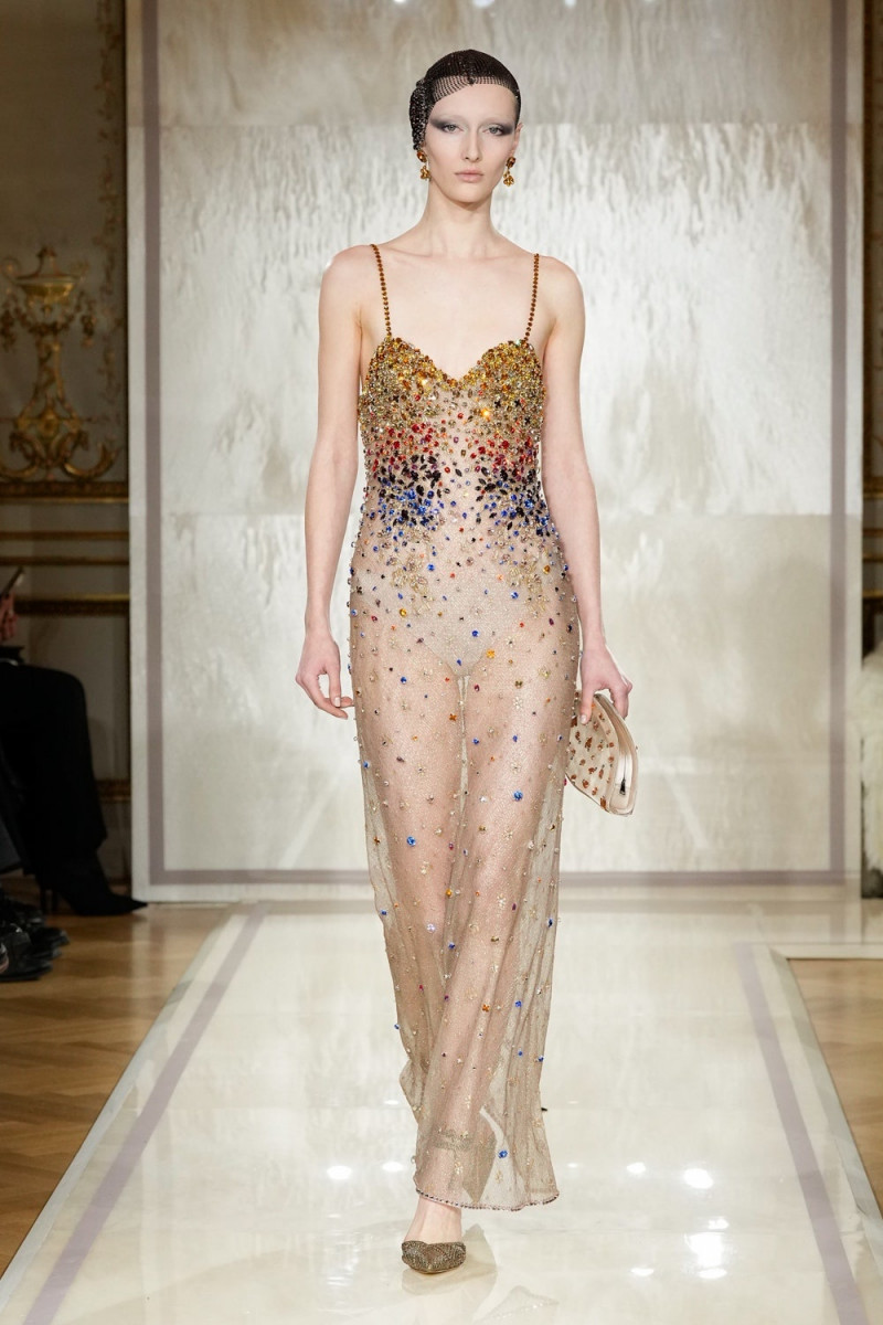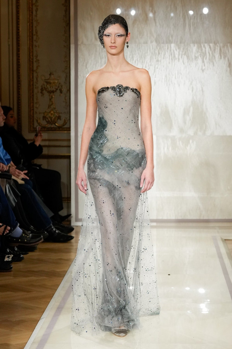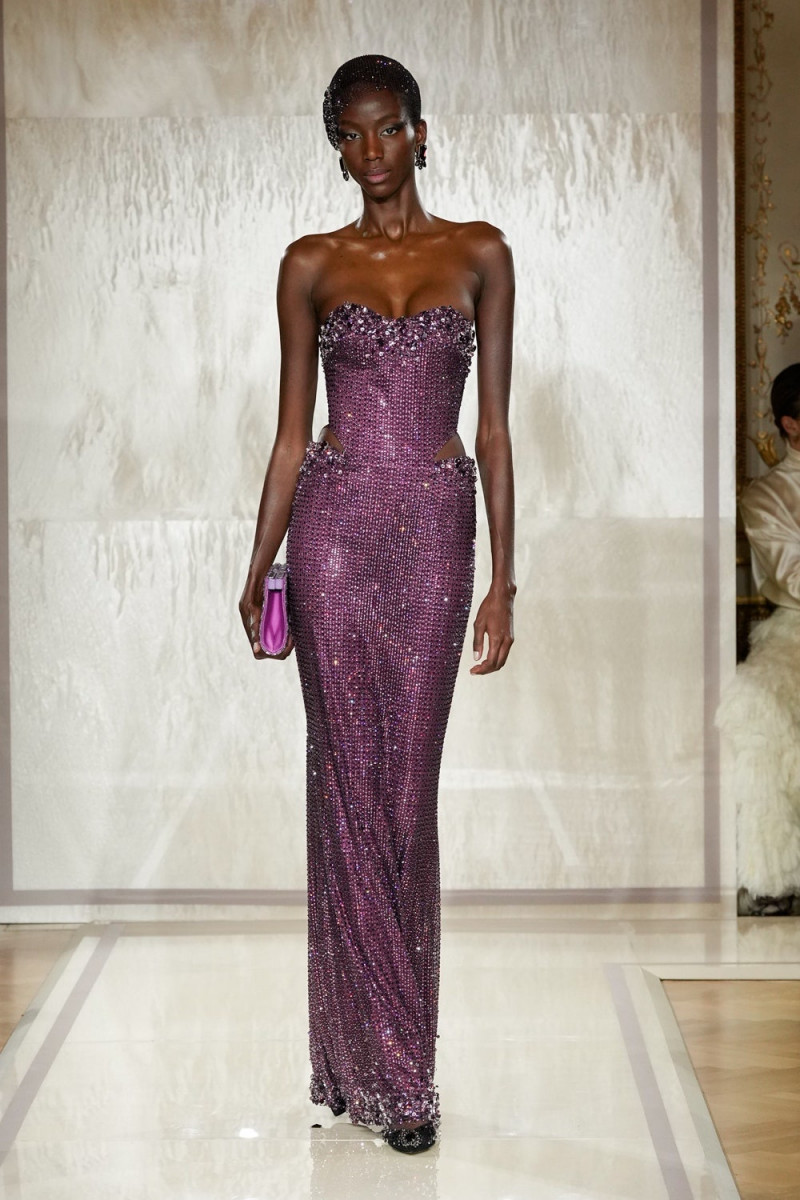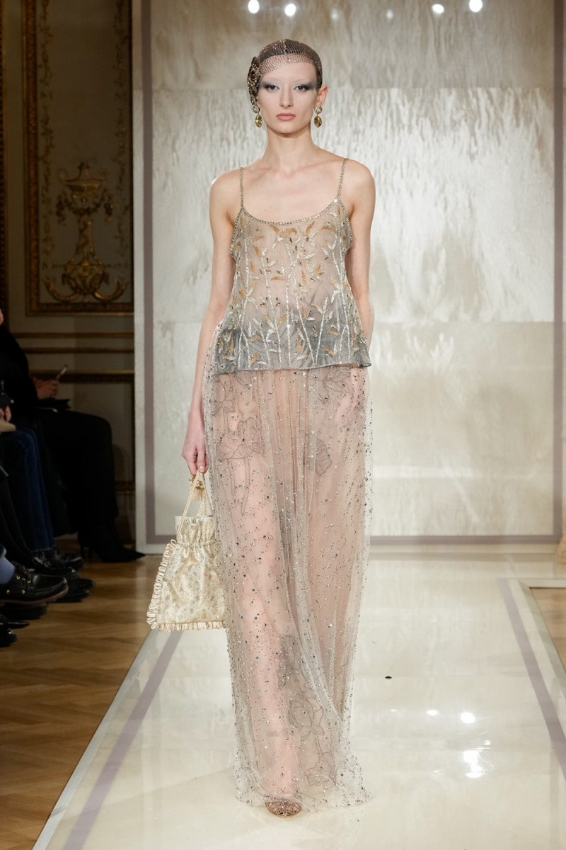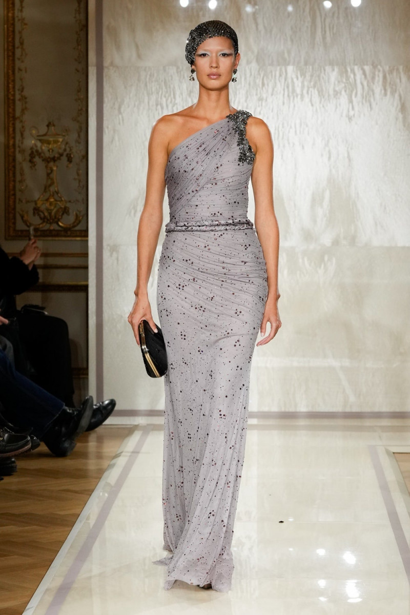 " Lumières Коллекция была исследованием сияния, пронизанного фирменной сдержанностью и утонченностью Армани. От жидких атласов, которые обволакивали тело, как расплавленное золото, до сложных, вышитых вручную сеток, накладывающихся на струящиеся брючные костюмы, одежда сияла тихим, но властным блеском. Блестящие платья со смелыми вырезами и драгоценными акцентами ловили свет при каждом движении, подтверждая непревзойденное мастерство Армани в создании элегантности без излишеств.