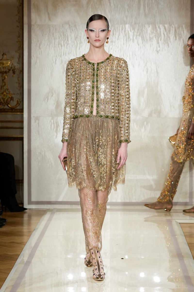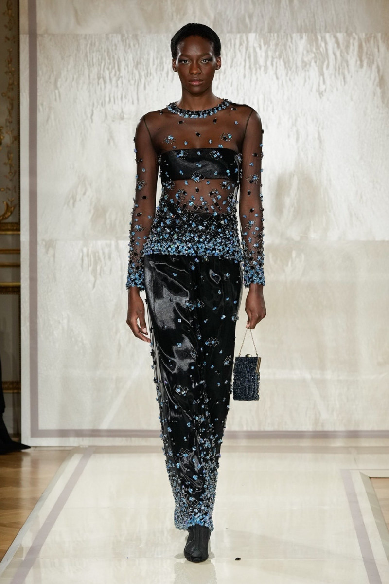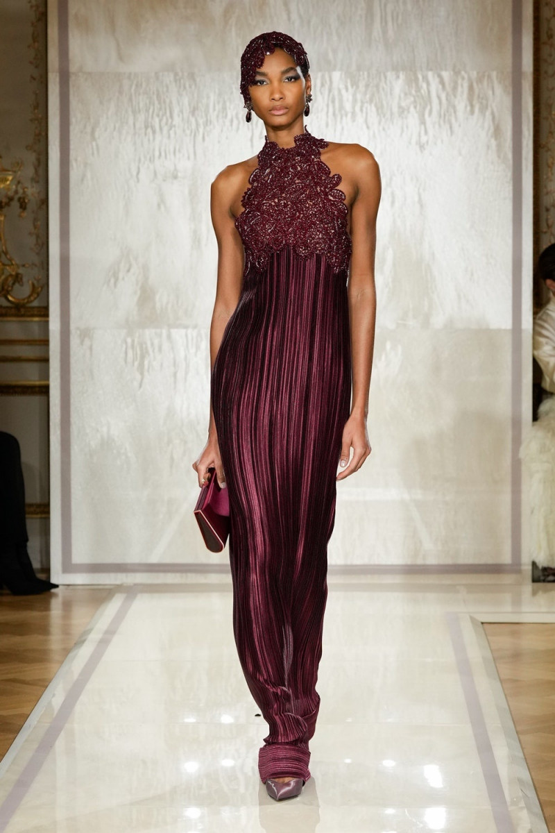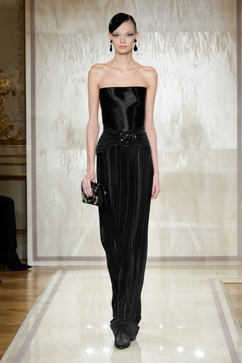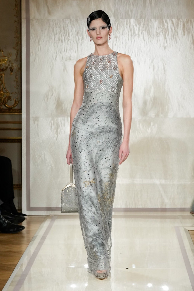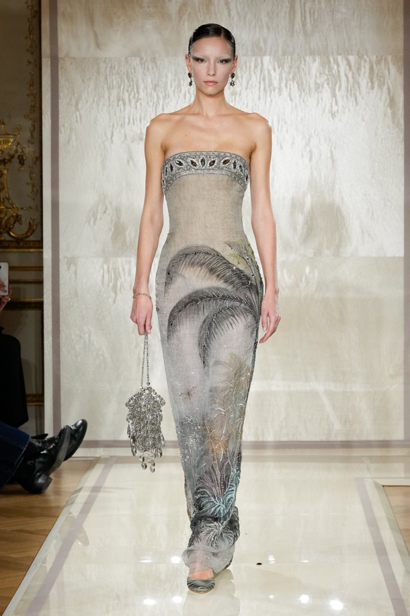 " Lumières Коллекция была исследованием сияния, пронизанного фирменной сдержанностью и утонченностью Армани. От жидких атласов, которые обволакивали тело, как расплавленное золото, до сложных, вышитых вручную сеток, накладывающихся на струящиеся брючные костюмы, одежда сияла тихим, но властным блеском. Блестящие платья со смелыми вырезами и драгоценными акцентами ловили свет при каждом движении, подтверждая непревзойденное мастерство Армани в создании элегантности без излишеств.