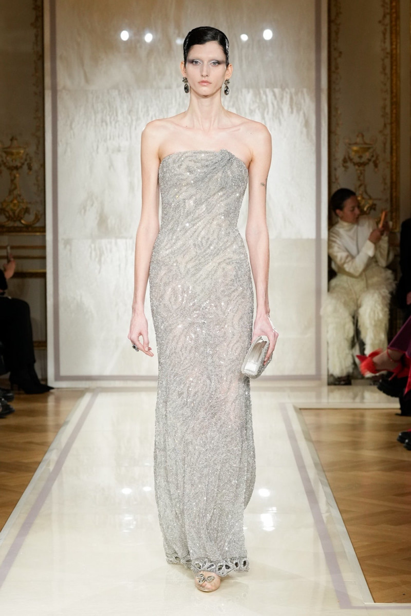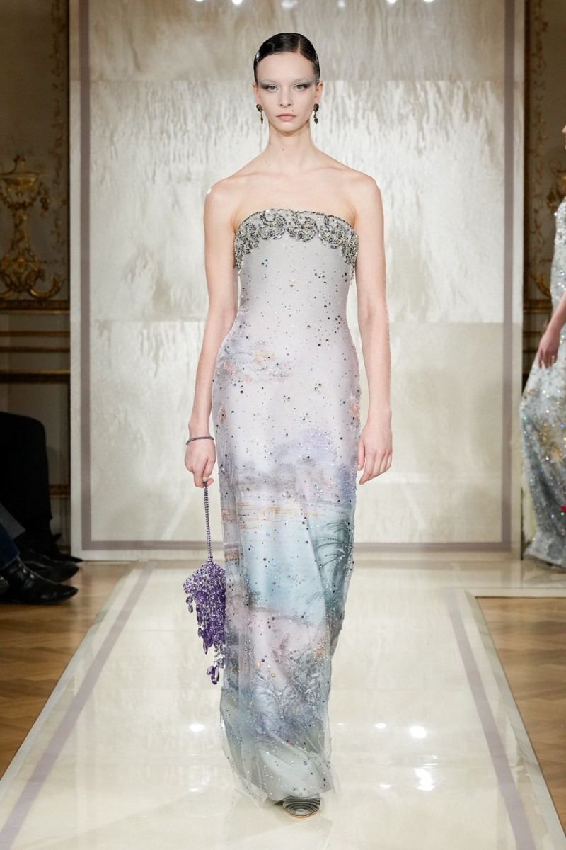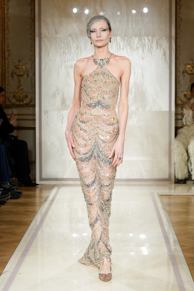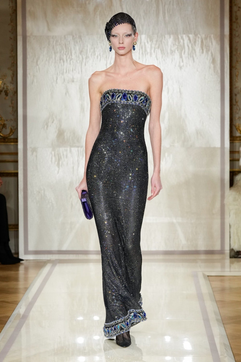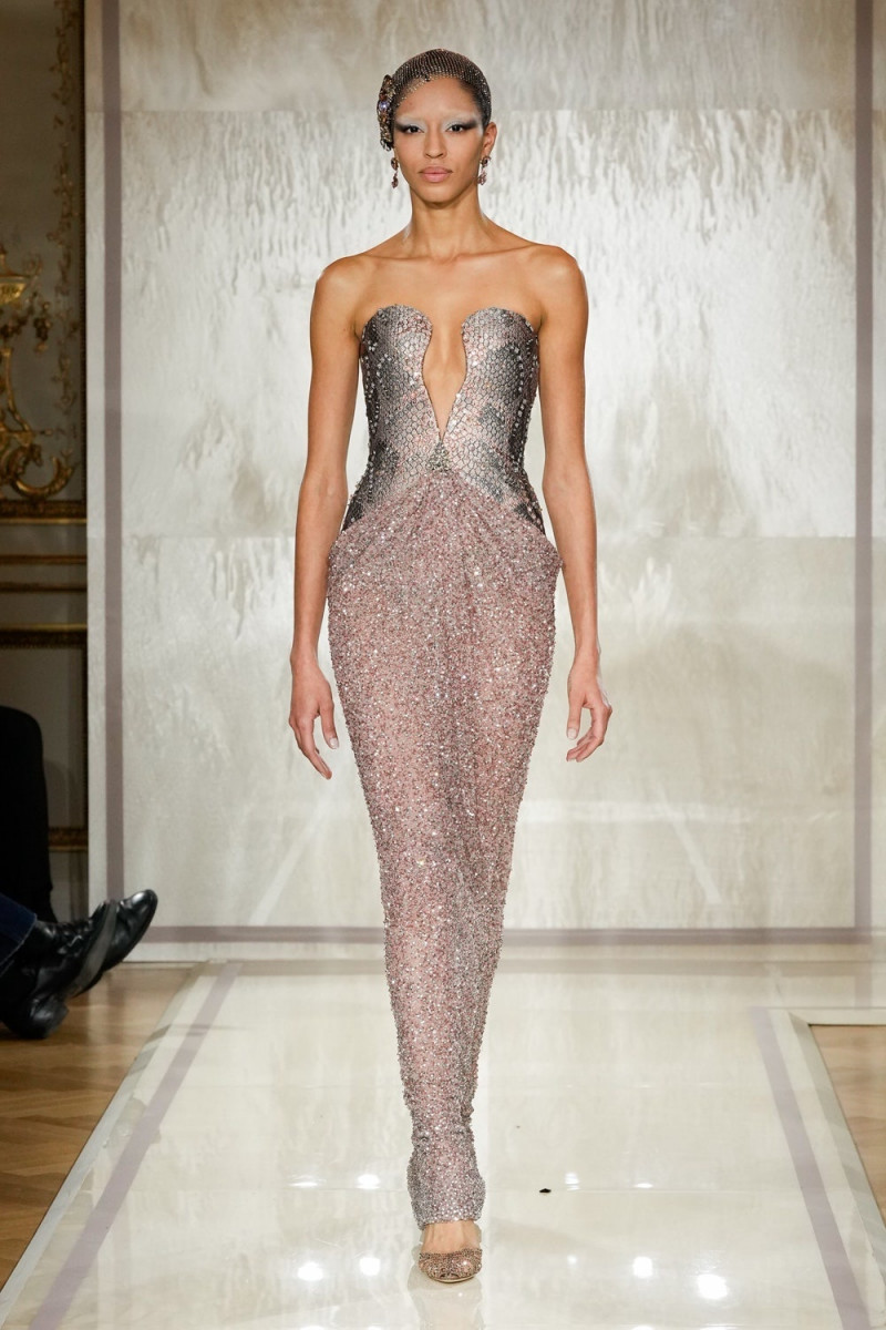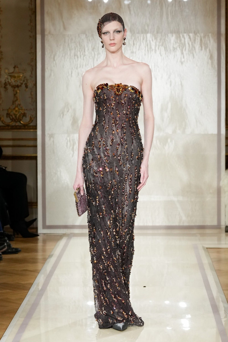 " Lumières Коллекция была исследованием сияния, пронизанного фирменной сдержанностью и утонченностью Армани. От жидких атласов, которые обволакивали тело, как расплавленное золото, до сложных, вышитых вручную сеток, накладывающихся на струящиеся брючные костюмы, одежда сияла тихим, но властным блеском. Блестящие платья со смелыми вырезами и драгоценными акцентами ловили свет при каждом движении, подтверждая непревзойденное мастерство Армани в создании элегантности без излишеств.