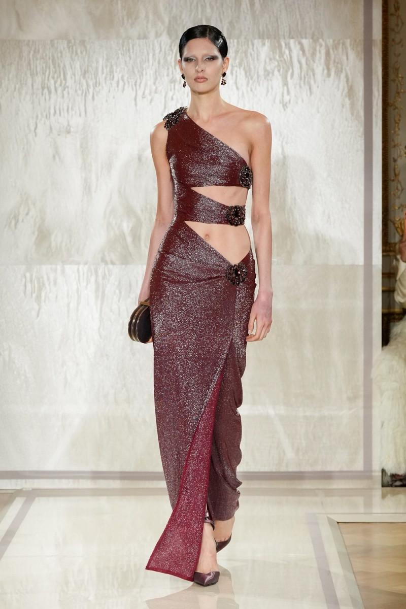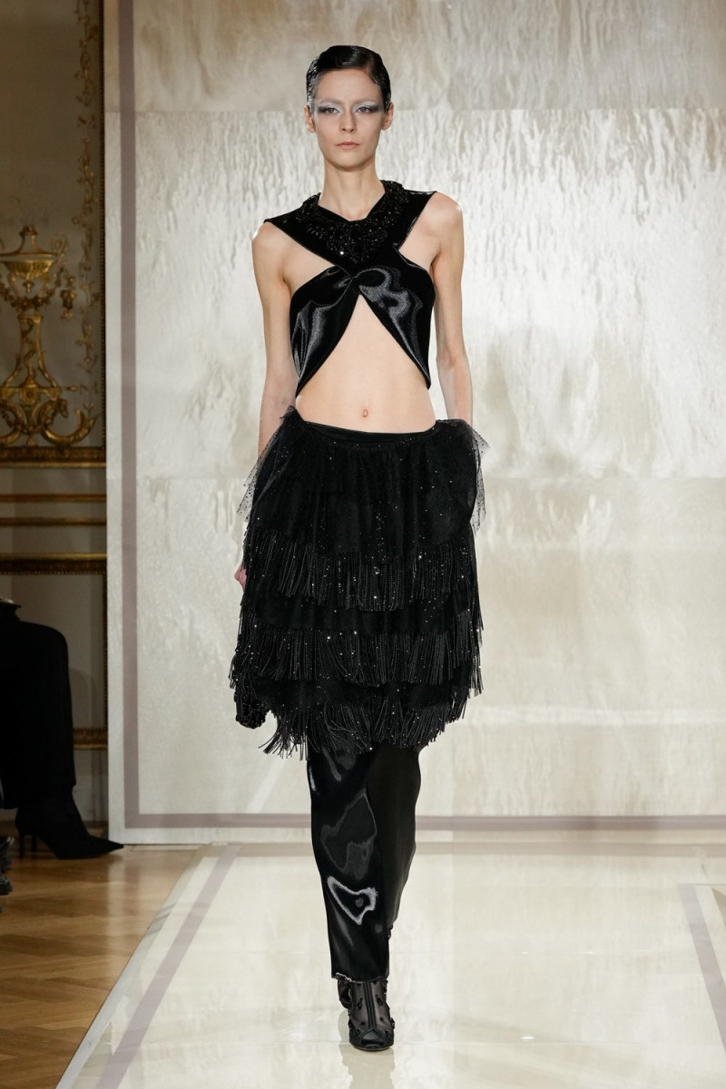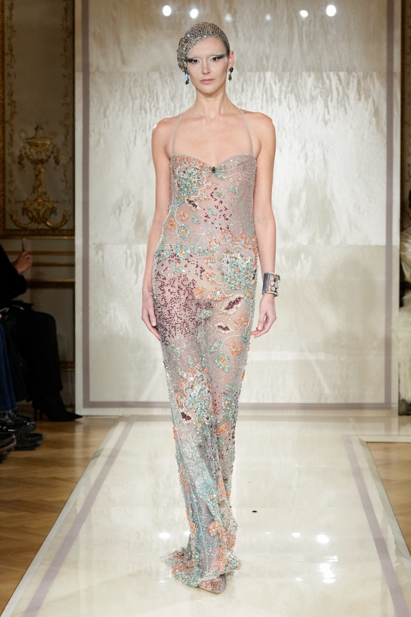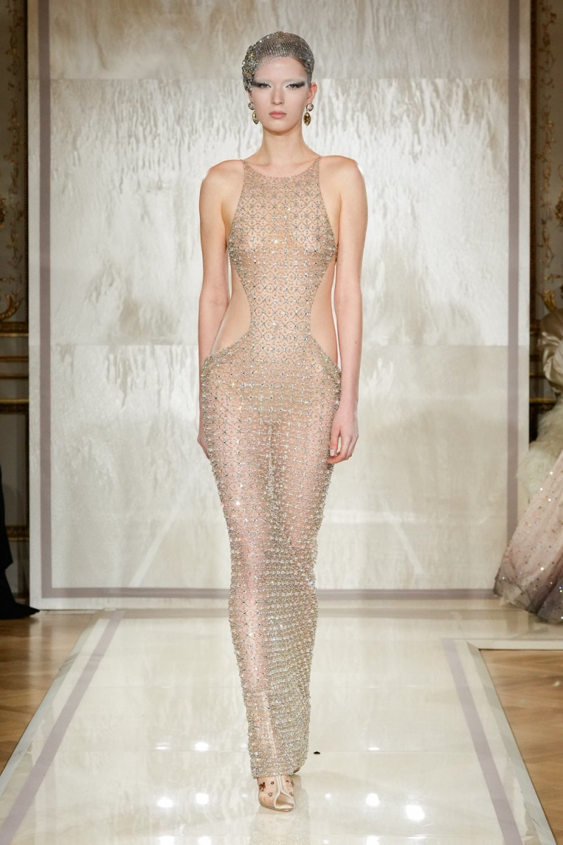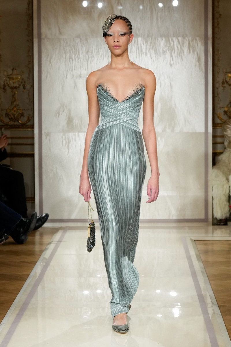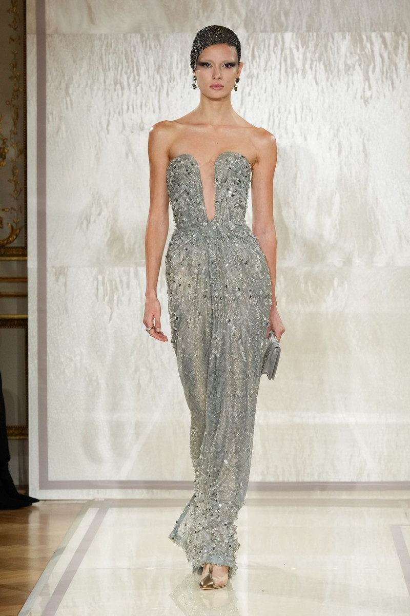 " Lumières Коллекция была исследованием сияния, пронизанного фирменной сдержанностью и утонченностью Армани. От жидких атласов, которые обволакивали тело, как расплавленное золото, до сложных, вышитых вручную сеток, накладывающихся на струящиеся брючные костюмы, одежда сияла тихим, но властным блеском. Блестящие платья со смелыми вырезами и драгоценными акцентами ловили свет при каждом движении, подтверждая непревзойденное мастерство Армани в создании элегантности без излишеств.