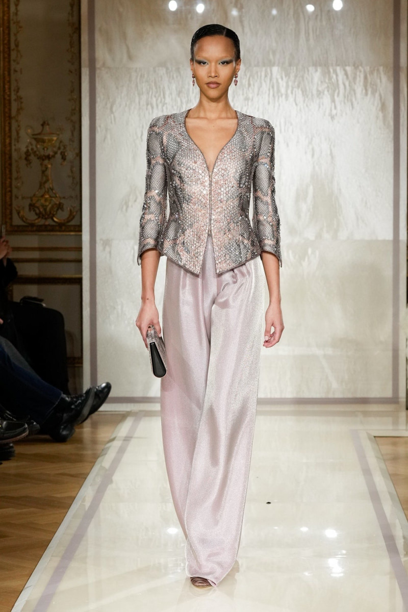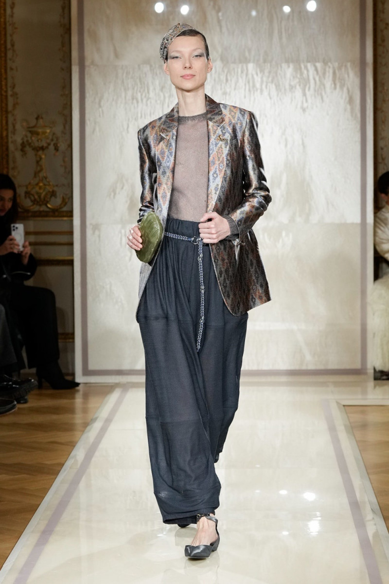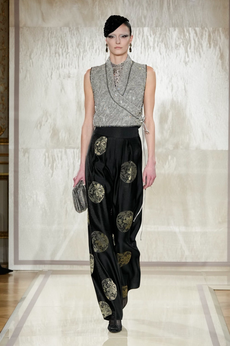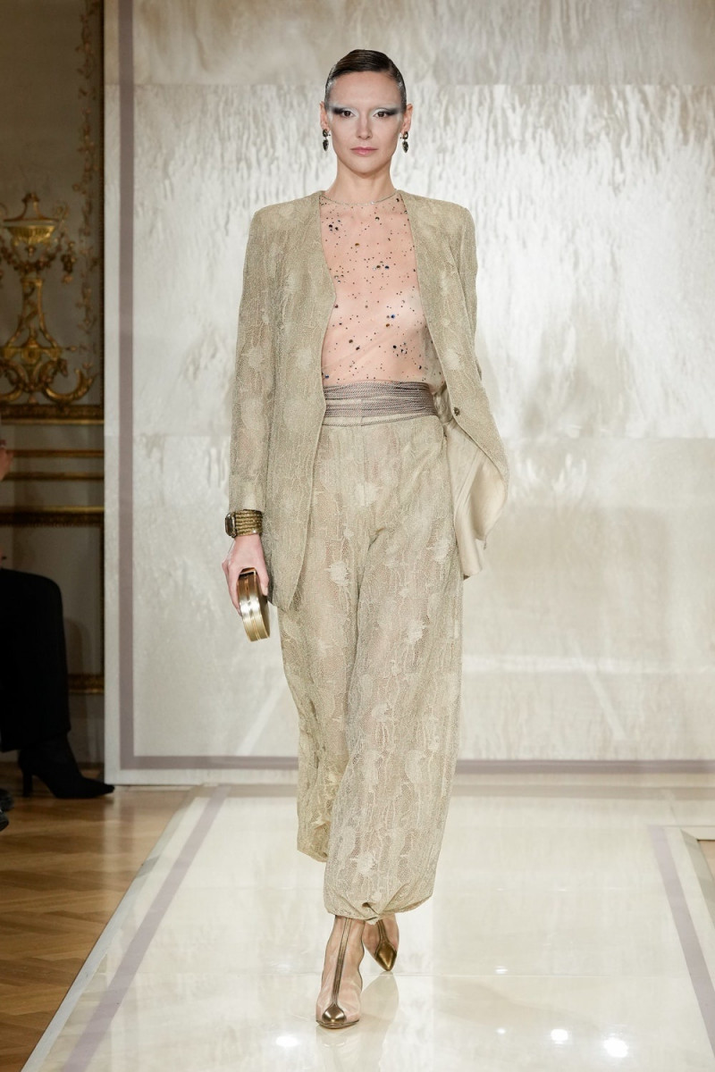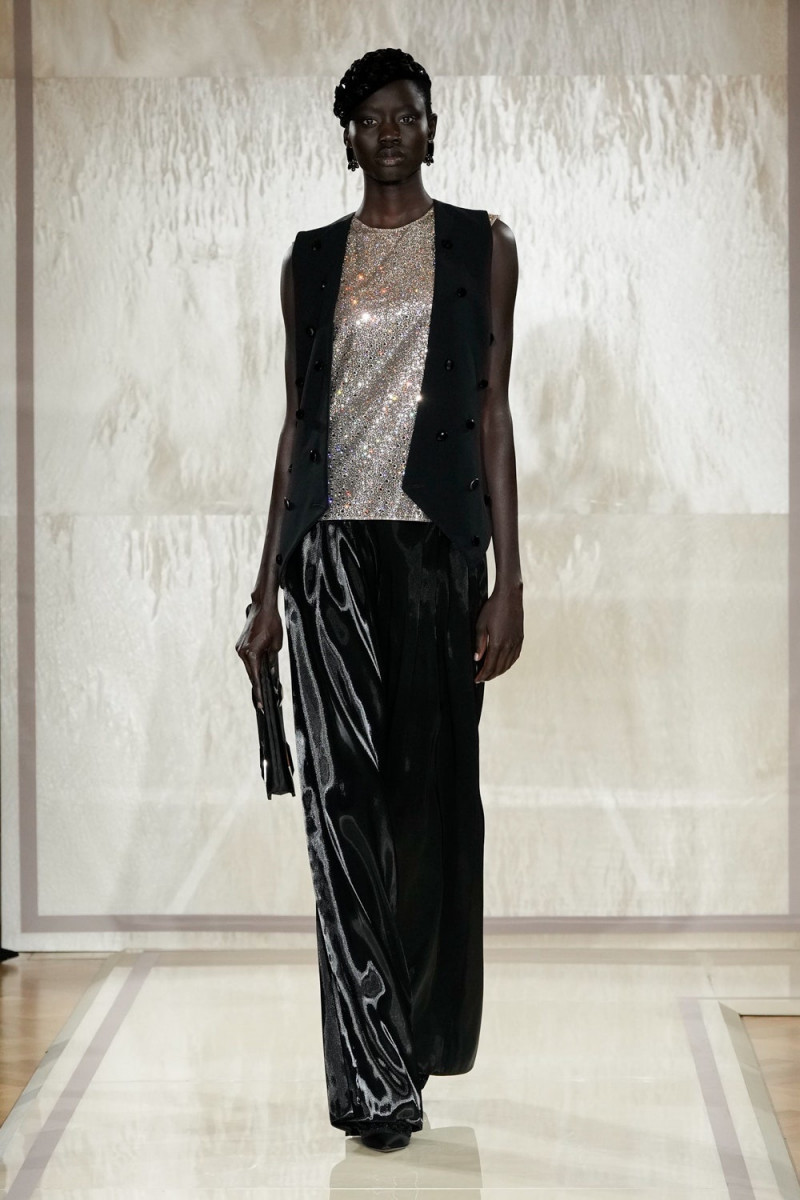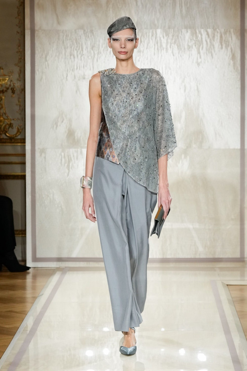 Фирменный струящийся покрой Армани остался краеугольным камнем коллекции, переосмысленной с долей экстравагантности. Брюки — основной элемент Армани — были представлены в различных формах: от мягко плиссированных и объемных силуэтов до заправленных в ботильоны на каблуках или собранных на щиколотке в знак уважения к восточным влияниям. Надетые под асимметричные туники, в сочетании с жакетами с пагодами на плечах или с изящно структурированными жилетами, эти модели излучали спокойную уверенность, которая давно определяет женщину Армани.