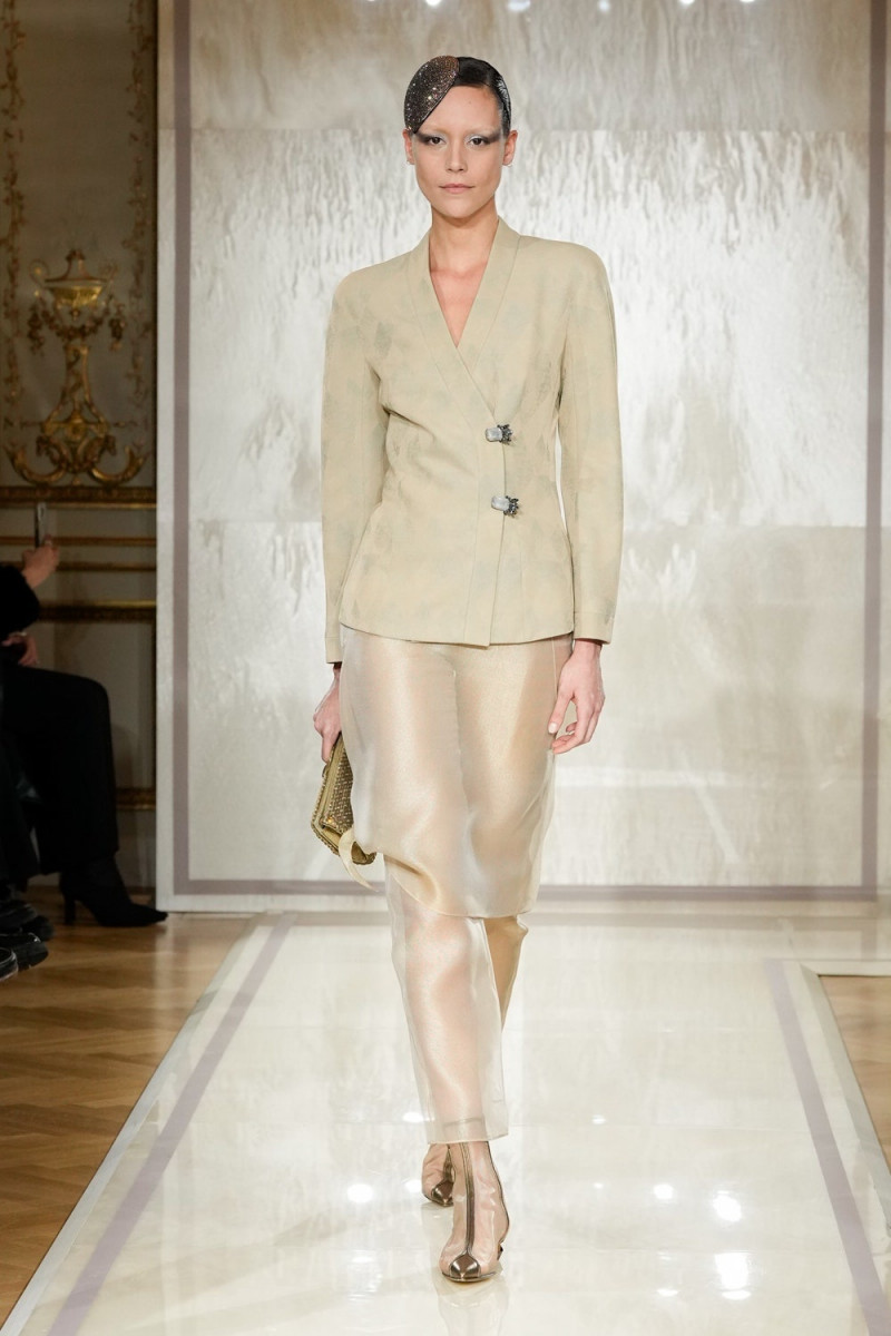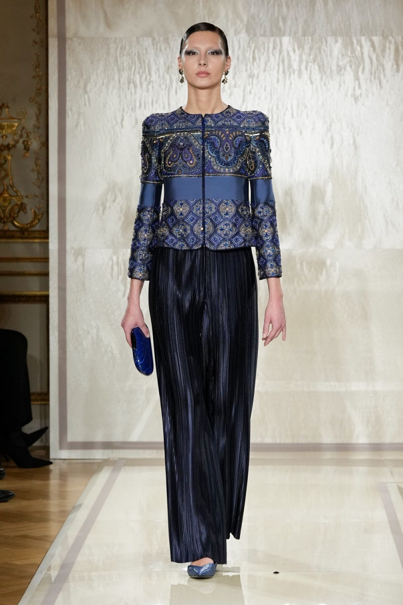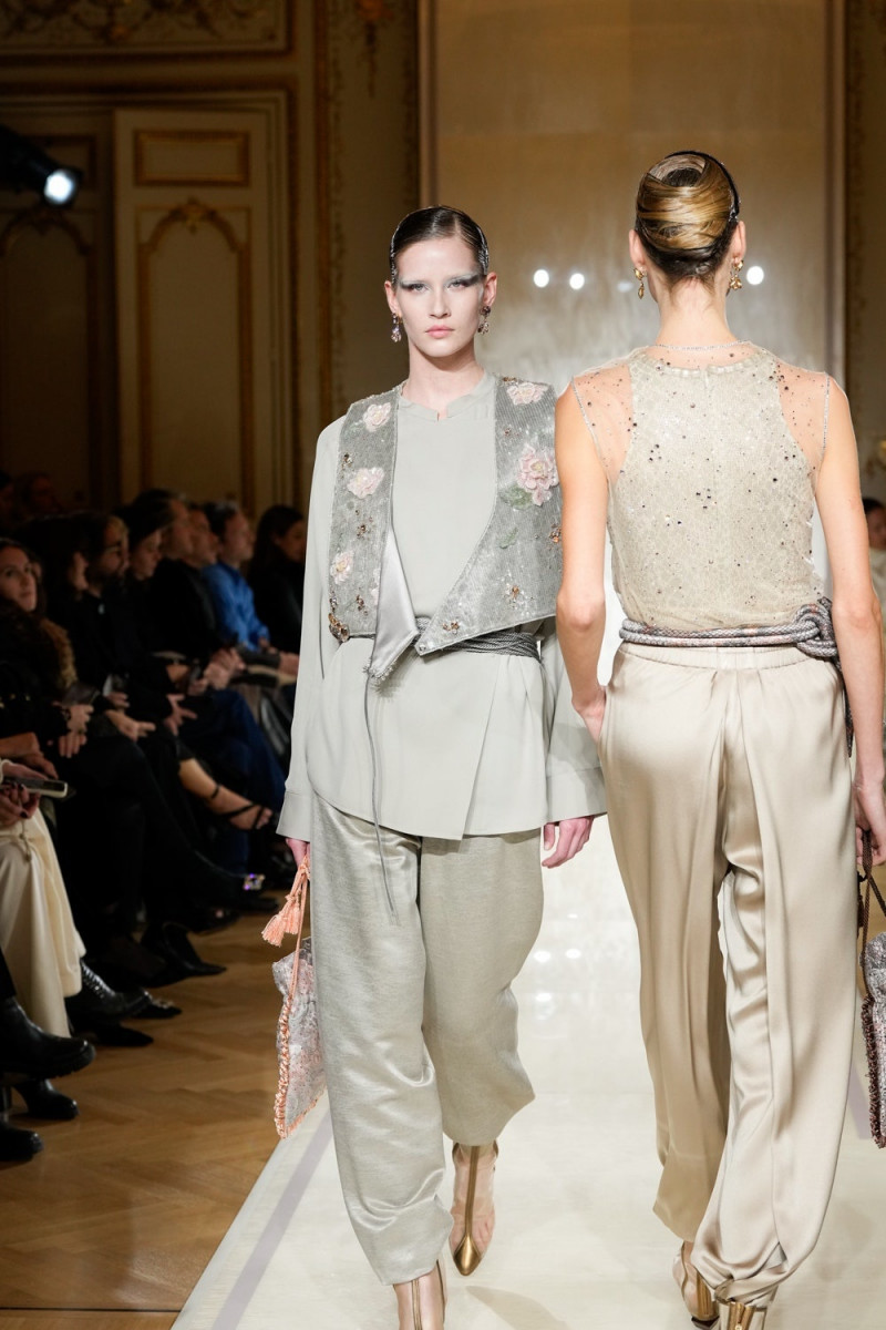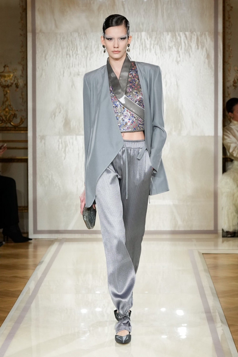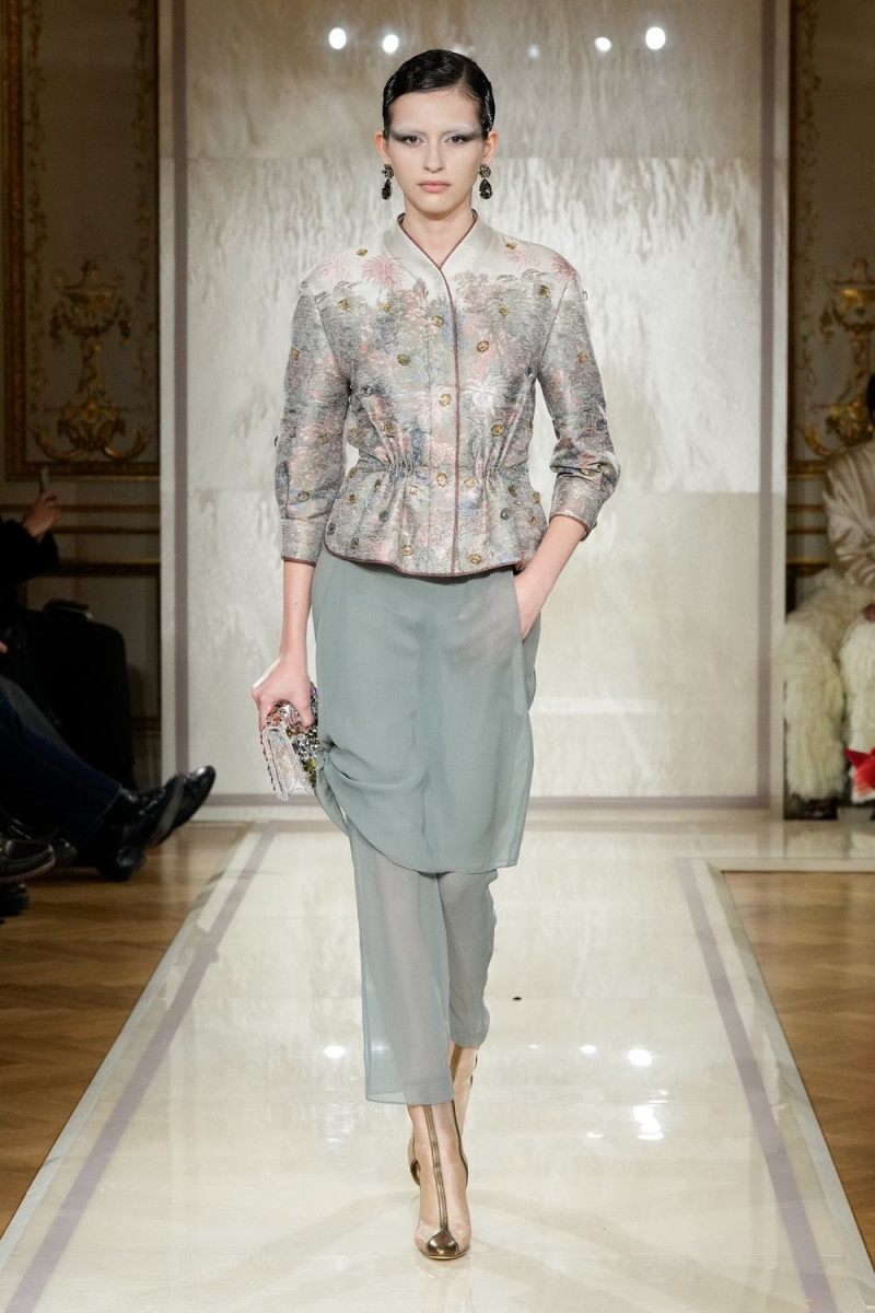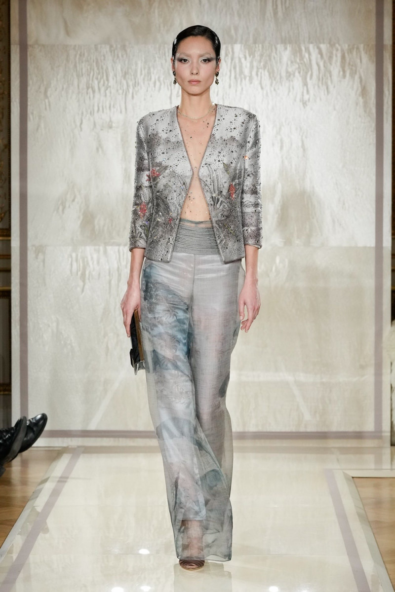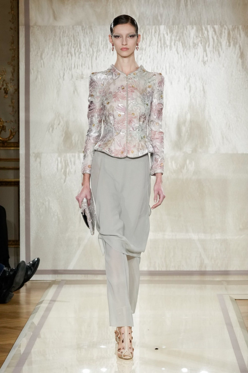Фирменный струящийся покрой Армани остался краеугольным камнем коллекции, переосмысленной с долей экстравагантности. Брюки — основной элемент Армани — были представлены в различных формах: от мягко плиссированных и объемных силуэтов до заправленных в ботильоны на каблуках или собранных на щиколотке в знак уважения к восточным влияниям. Надетые под асимметричные туники, в сочетании с жакетами с пагодами на плечах или с изящно структурированными жилетами, эти модели излучали спокойную уверенность, которая давно определяет женщину Армани.