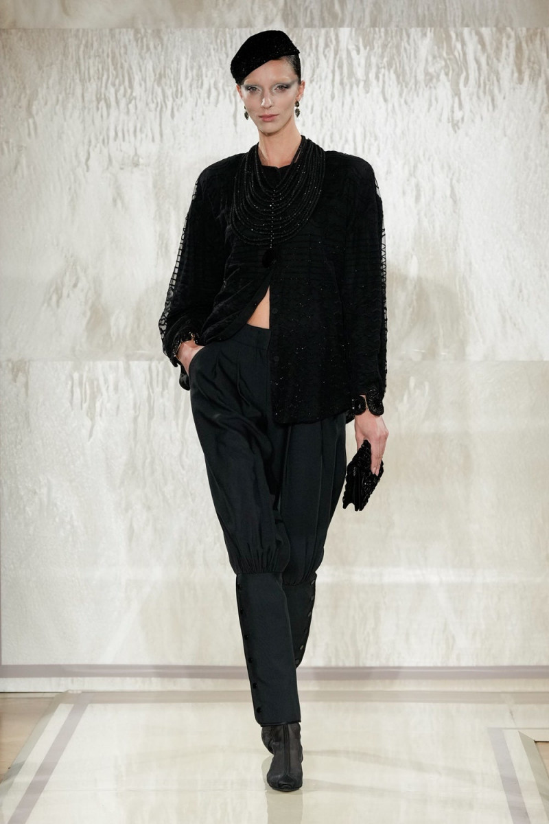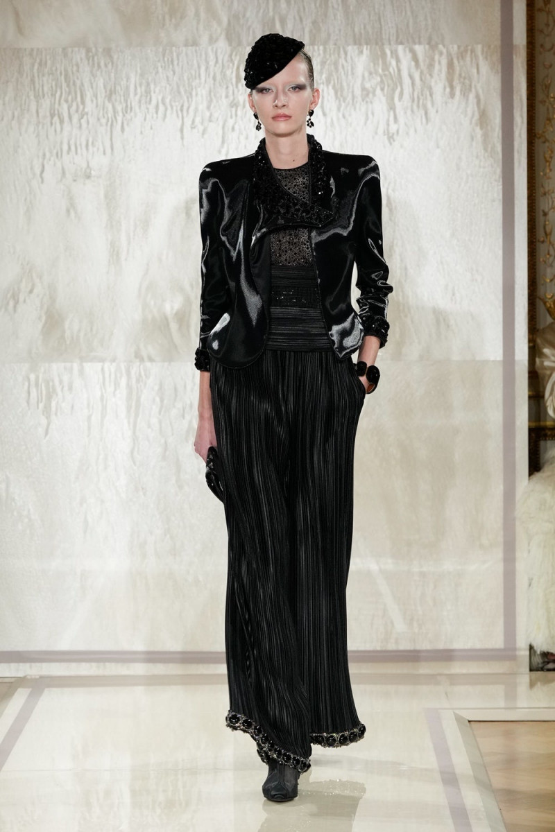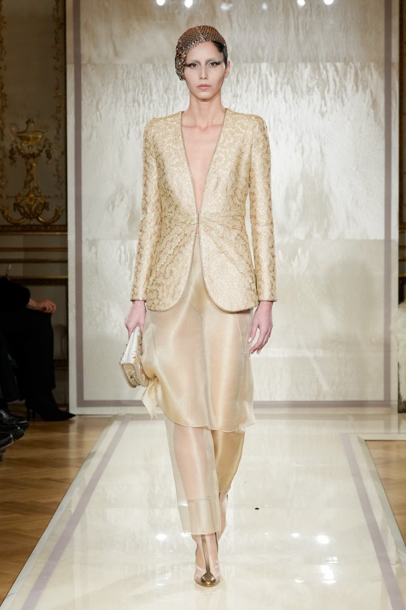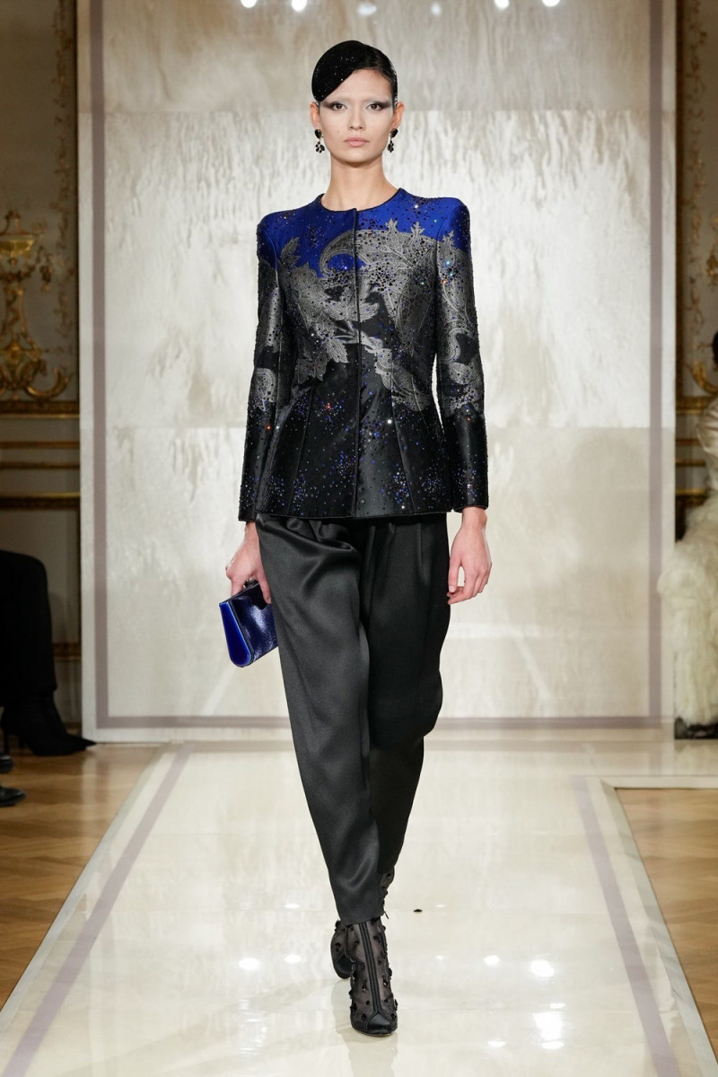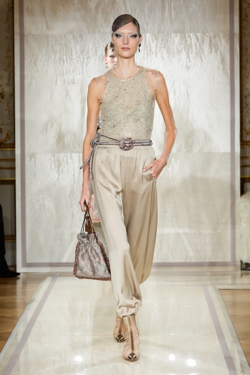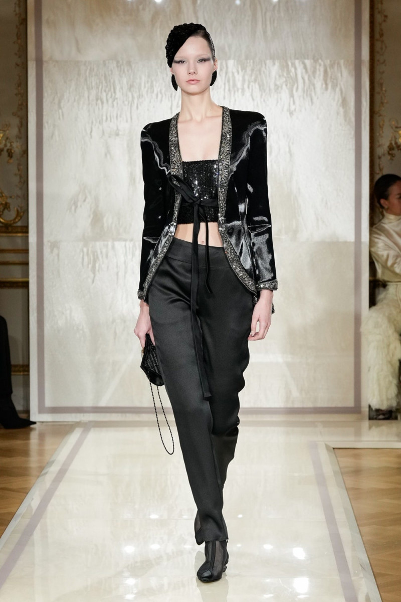 Фирменный струящийся покрой Армани остался краеугольным камнем коллекции, переосмысленной с долей экстравагантности. Брюки — основной элемент Армани — были представлены в различных формах: от мягко плиссированных и объемных силуэтов до заправленных в ботильоны на каблуках или собранных на щиколотке в знак уважения к восточным влияниям. Надетые под асимметричные туники, в сочетании с жакетами с пагодами на плечах или с изящно структурированными жилетами, эти модели излучали спокойную уверенность, которая давно определяет женщину Армани.