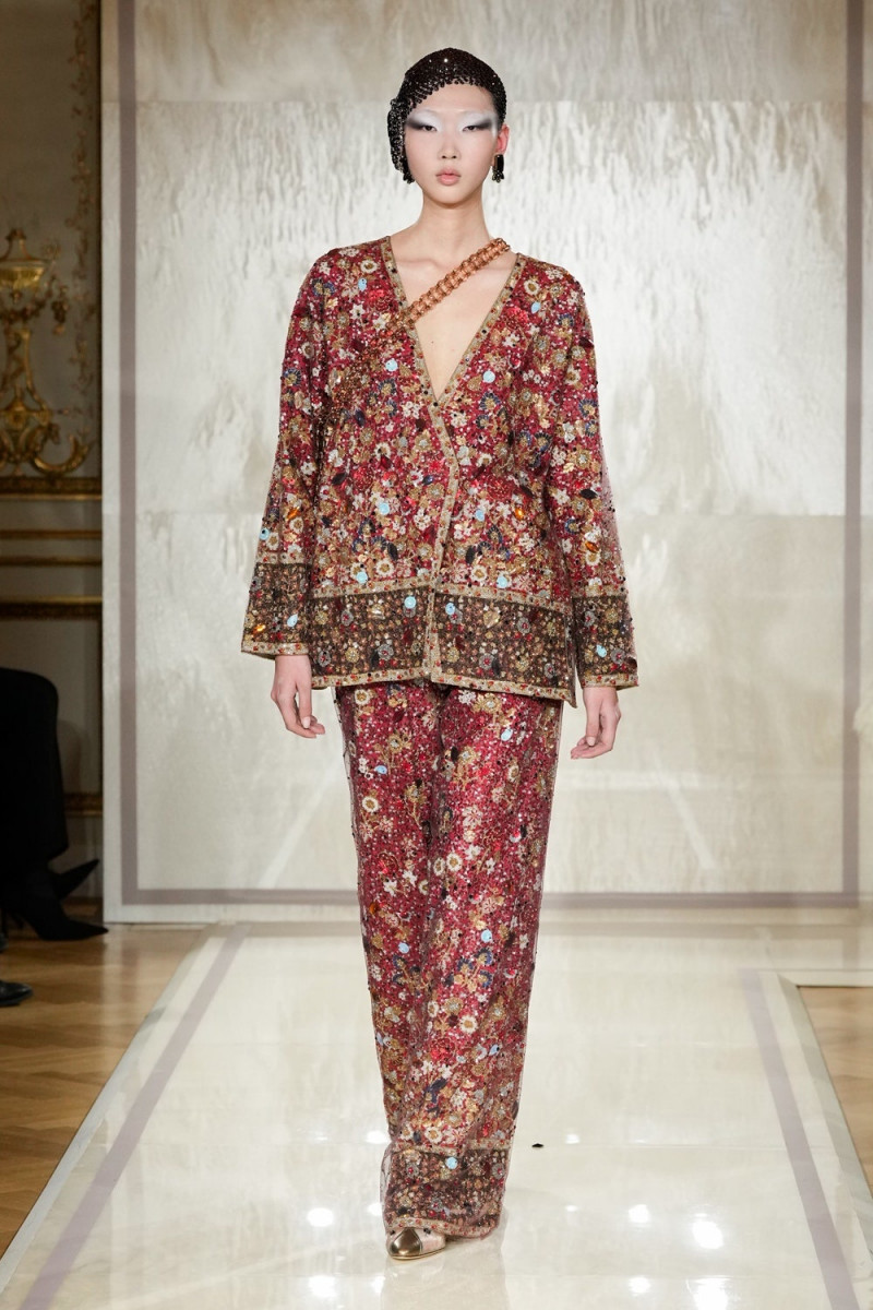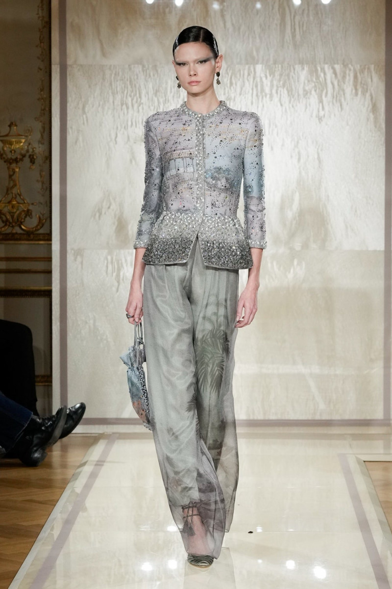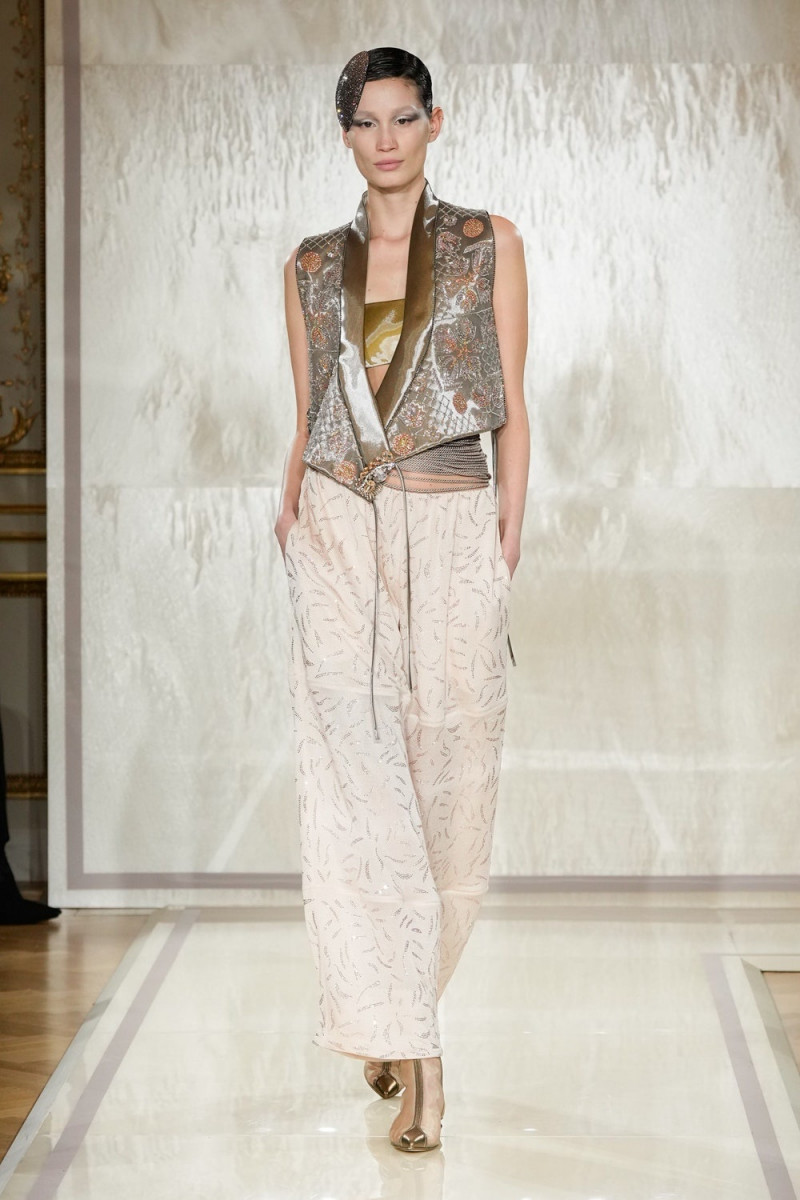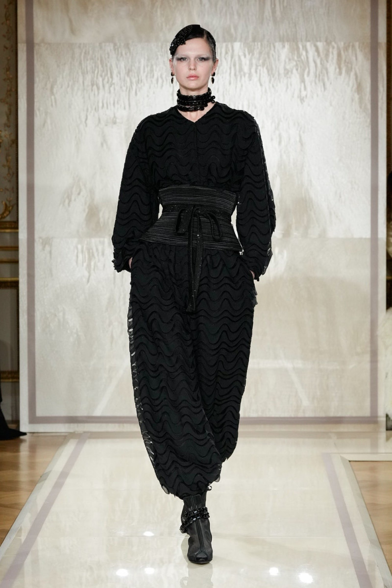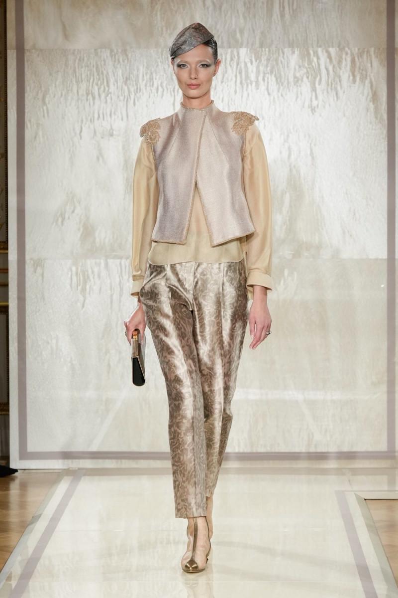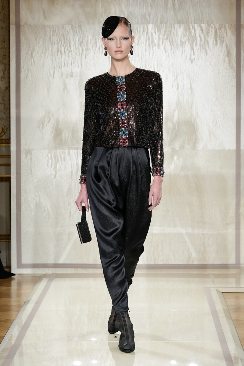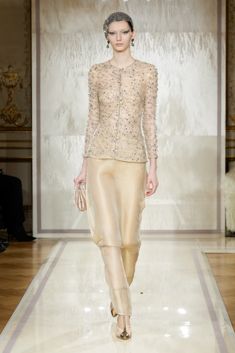 Фирменный струящийся покрой Армани остался краеугольным камнем коллекции, переосмысленной с долей экстравагантности. Брюки — основной элемент Армани — были представлены в различных формах: от мягко плиссированных и объемных силуэтов до заправленных в ботильоны на каблуках или собранных на щиколотке в знак уважения к восточным влияниям. Надетые под асимметричные туники, в сочетании с жакетами с пагодами на плечах или с изящно структурированными жилетами, эти модели излучали спокойную уверенность, которая давно определяет женщину Армани.