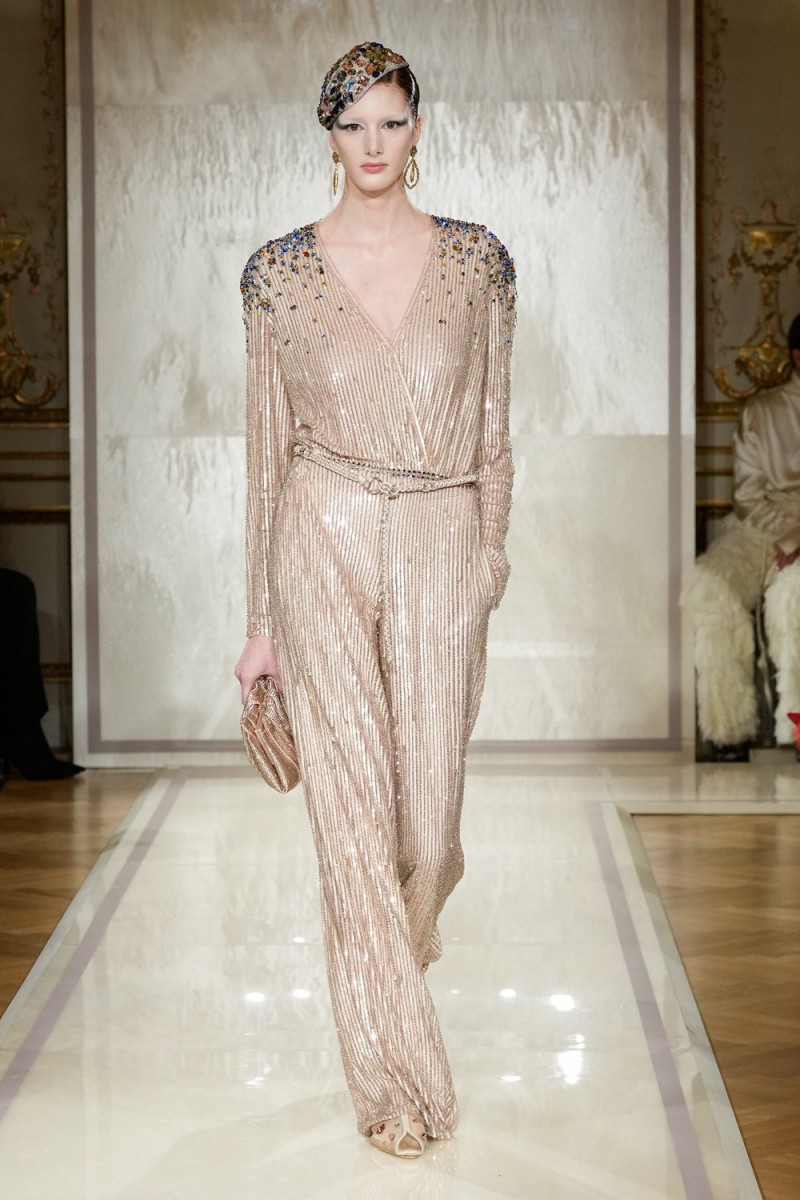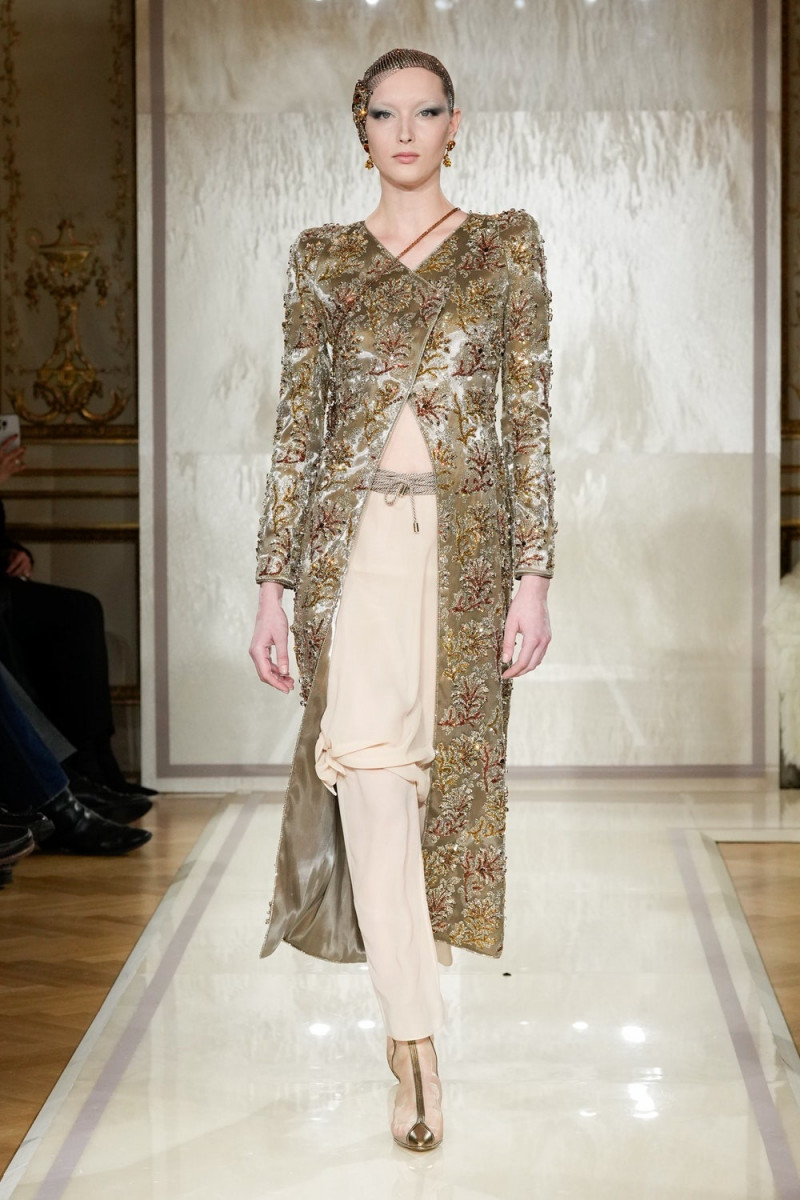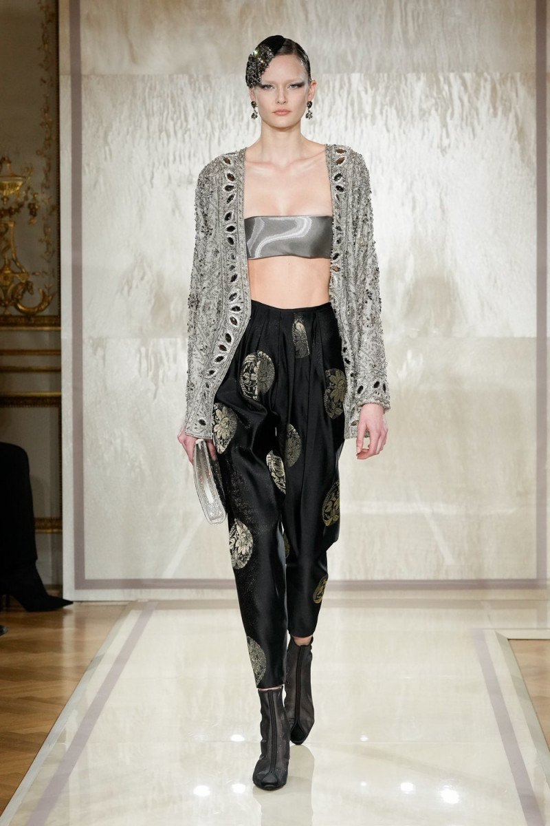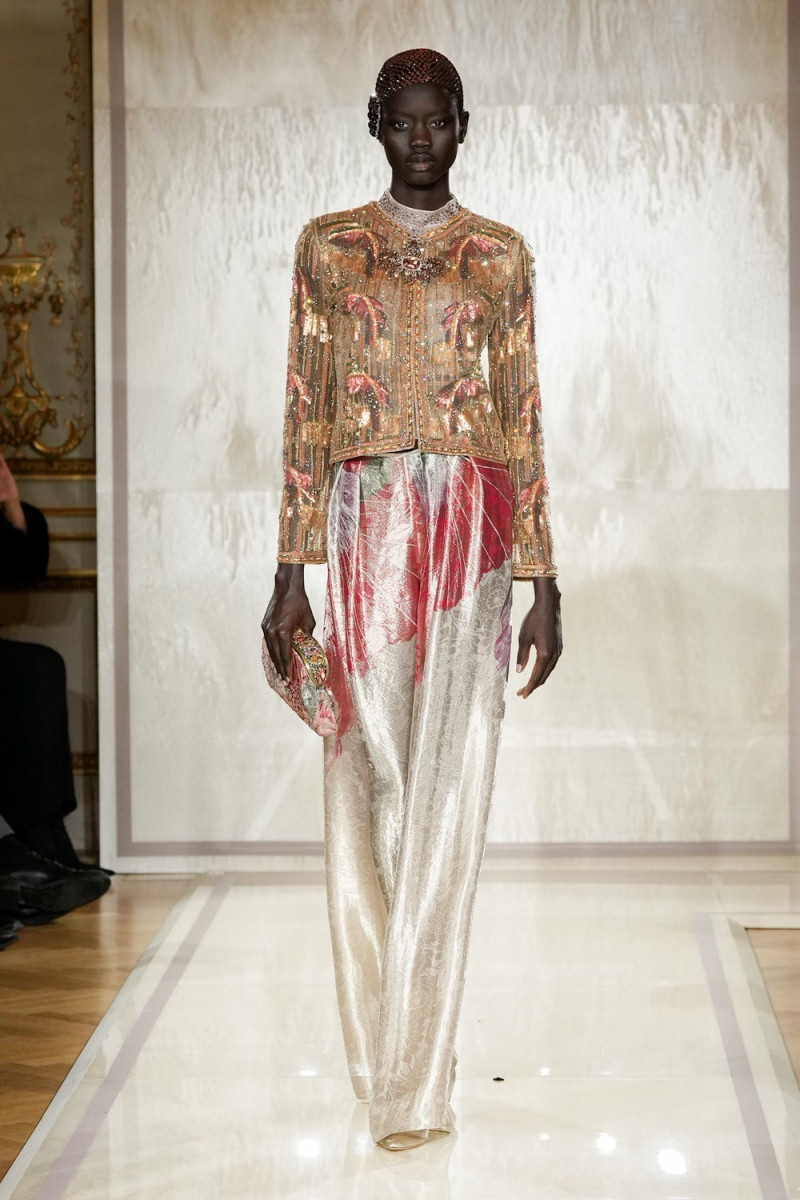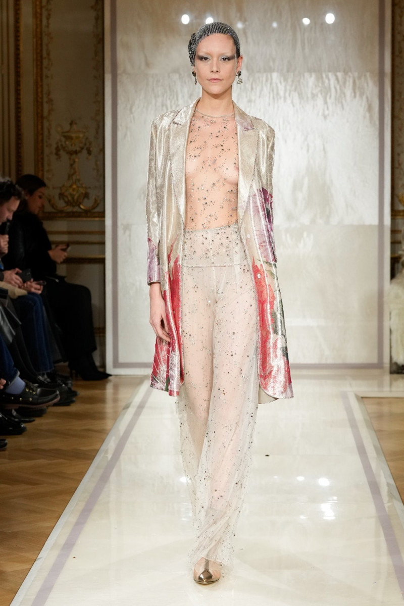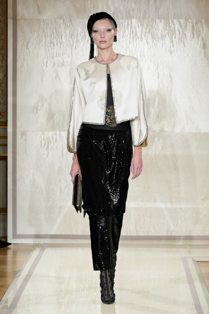 Фирменный струящийся покрой Армани остался краеугольным камнем коллекции, переосмысленной с долей экстравагантности. Брюки — основной элемент Армани — были представлены в различных формах: от мягко плиссированных и объемных силуэтов до заправленных в ботильоны на каблуках или собранных на щиколотке в знак уважения к восточным влияниям. Надетые под асимметричные туники, в сочетании с жакетами с пагодами на плечах или с изящно структурированными жилетами, эти модели излучали спокойную уверенность, которая давно определяет женщину Армани.