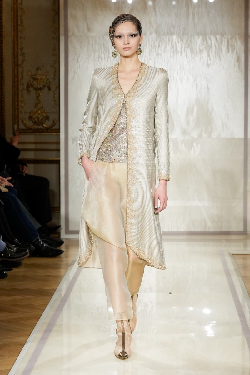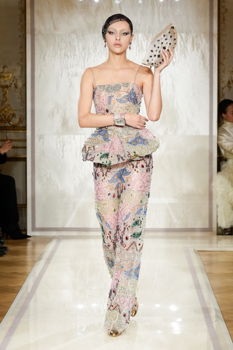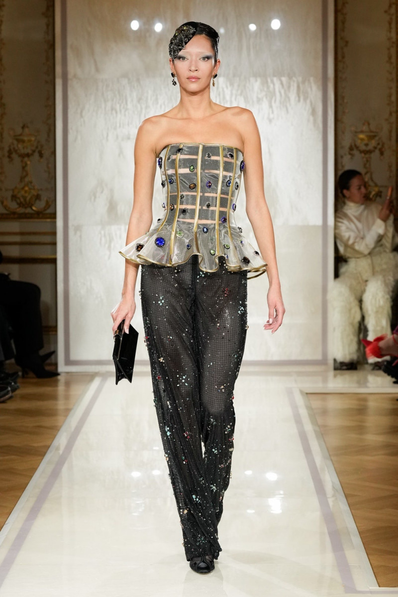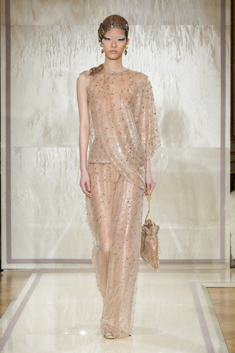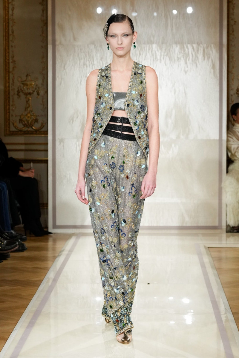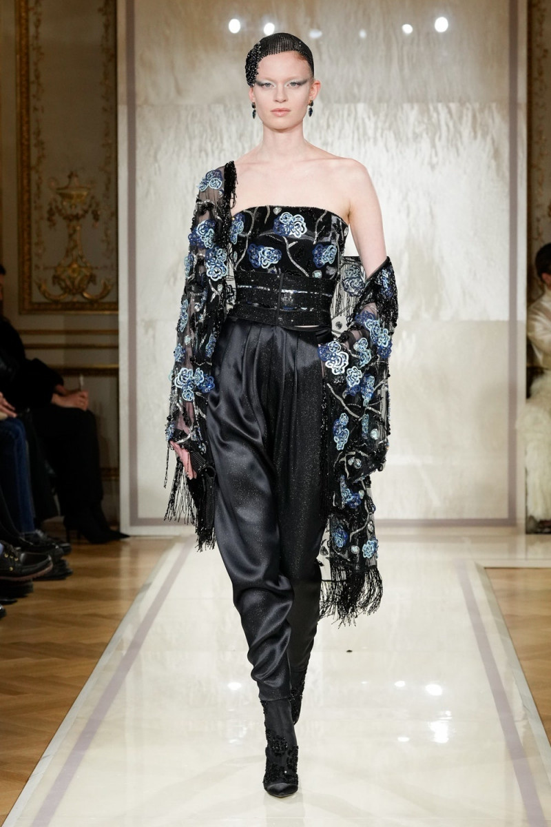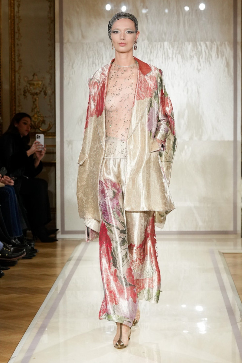 Фирменный струящийся покрой Армани остался краеугольным камнем коллекции, переосмысленной с долей экстравагантности. Брюки — основной элемент Армани — были представлены в различных формах: от мягко плиссированных и объемных силуэтов до заправленных в ботильоны на каблуках или собранных на щиколотке в знак уважения к восточным влияниям. Надетые под асимметричные туники, в сочетании с жакетами с пагодами на плечах или с изящно структурированными жилетами, эти модели излучали спокойную уверенность, которая давно определяет женщину Армани.