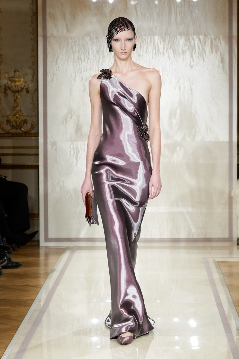 Для более торжественных моментов коллекция предлагала мастер-класс элегантности красной дорожки: широкие платья, асимметрично драпированные силуэты и модели на одно плечо с глубокими вырезами и открытыми спинами. Видение чувственности Армани никогда не бывает откровенно провокационным; вместо этого оно соблазняет своей исключительной легкостью и безупречным исполнением.