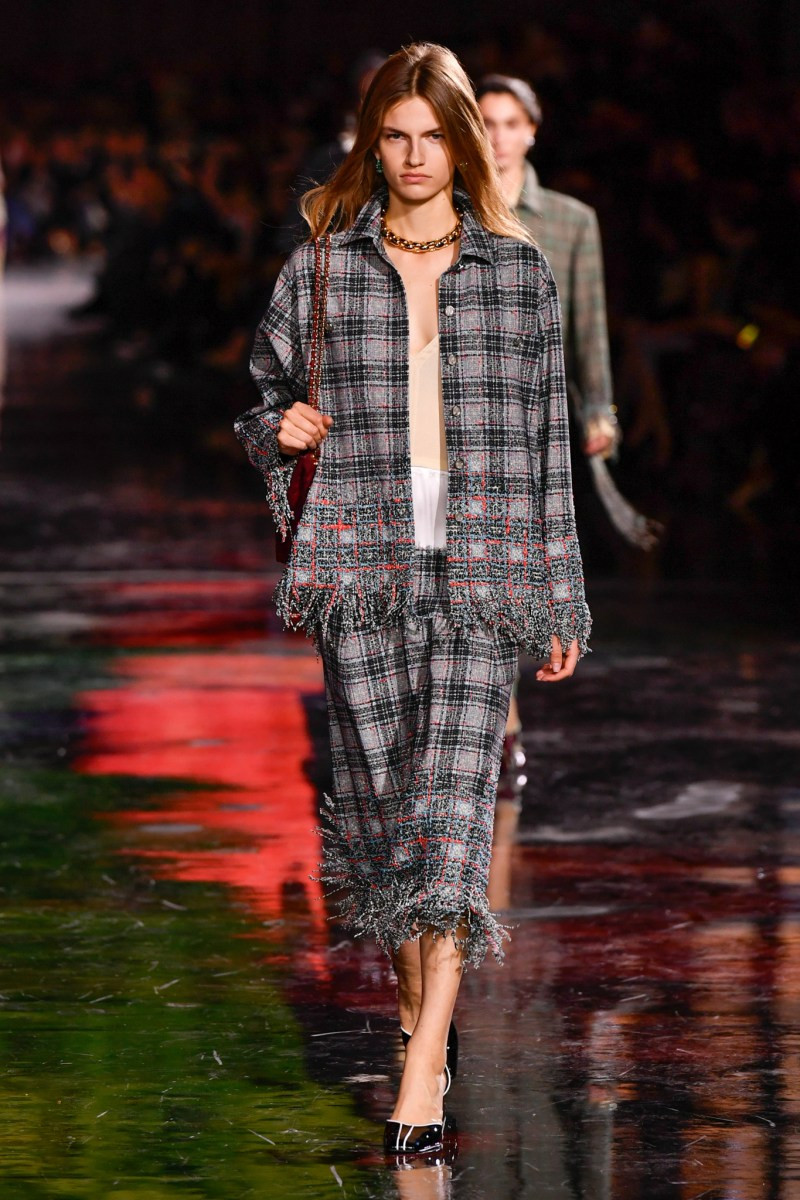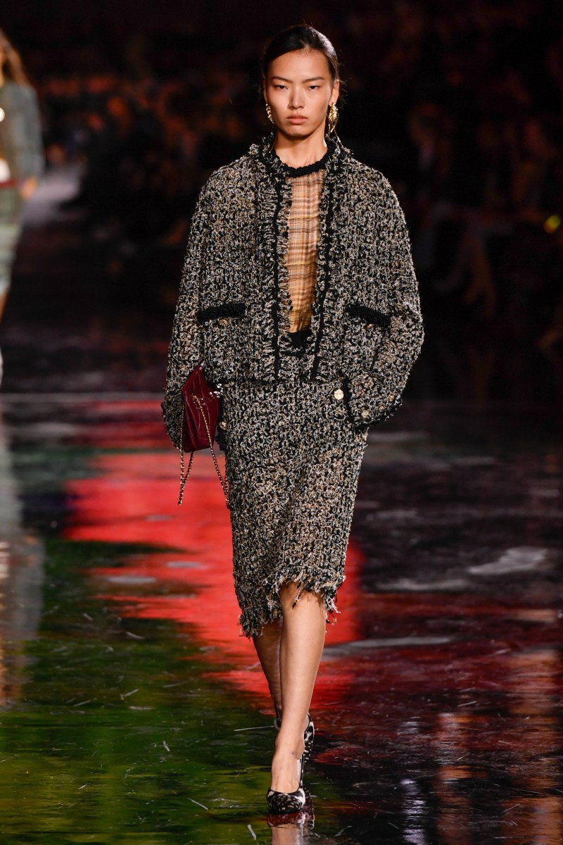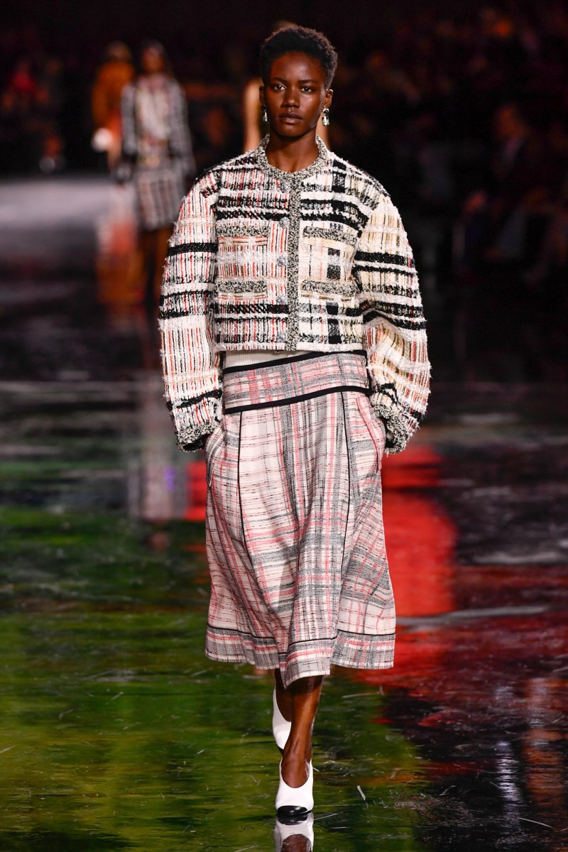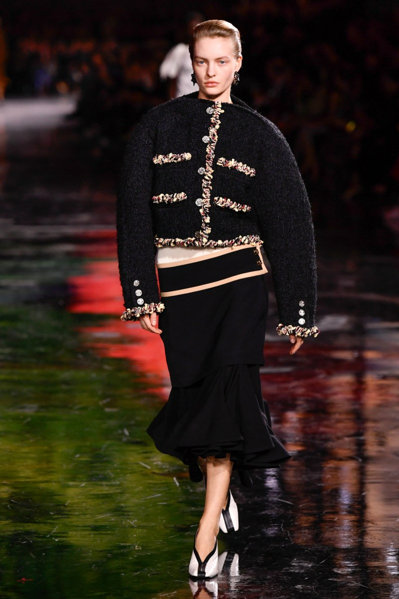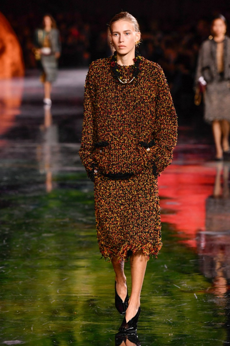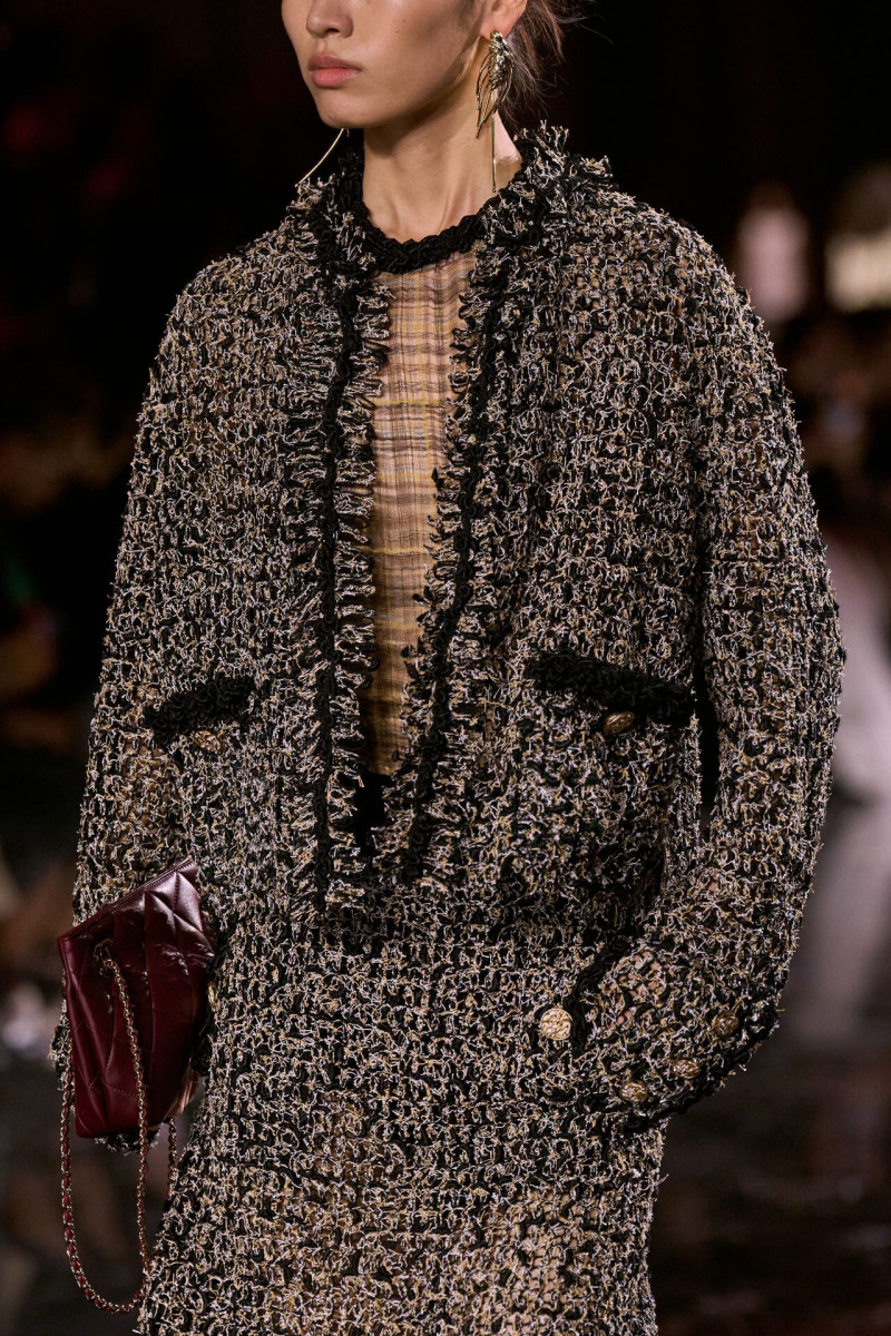 Отдельного разговора заслуживает твид. За двое суток до показа в индустрии «пополз слух», что в «новом Chanel» не будет твида. По факту — и да, и нет. Твидовых образов на подиуме все-таки было достаточно. Прежде всего, платьев и двоек с юбками. Но это не твид в привычном, традиционном понимании. Еще в бытность своей работы с Bottega Veneta, Блази экспериментировал с инновационными тканями-обманками. Вот и у Chanel твид ощущается мягким как трикотаж, он струится и становится полупрозрачным в вечерних образах, облегчается, становятся «подвижными», хотя и сохраняет в некоторых образах свою строгость и элегантность. Фантастический коммерческий потенциал у мешковатых бомберов из облегченного твида.