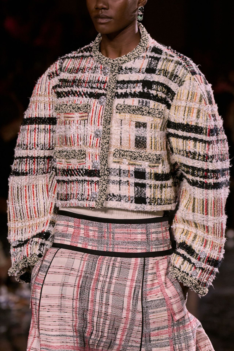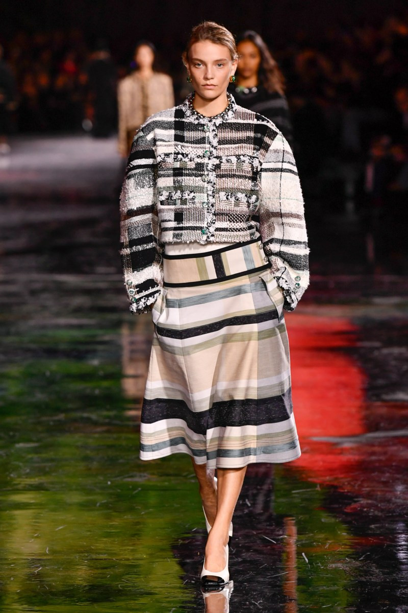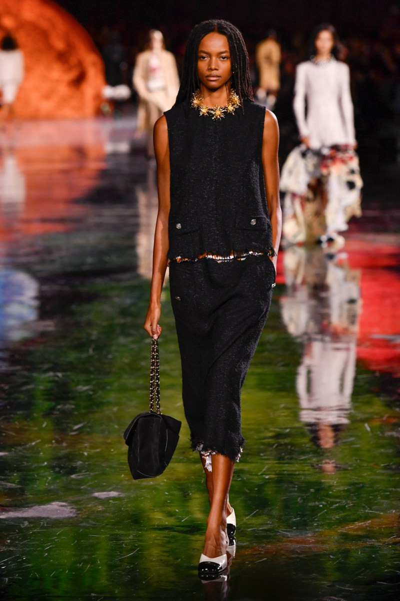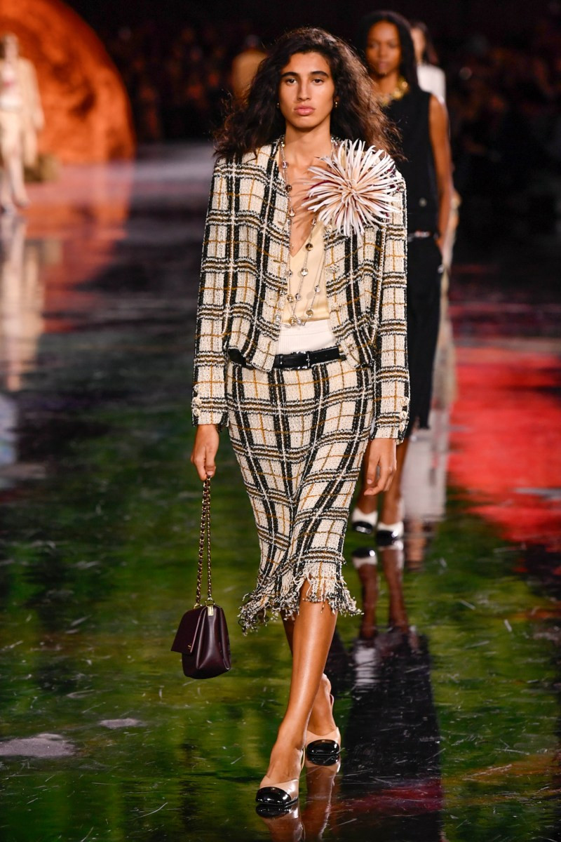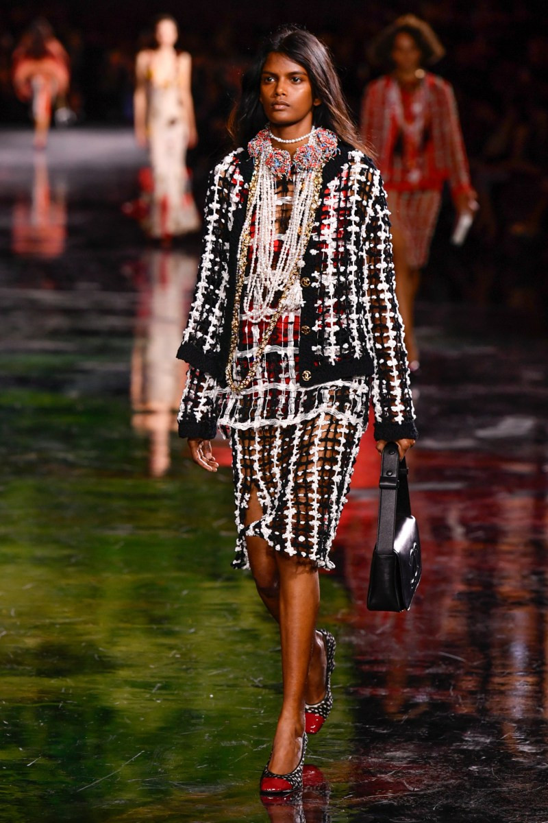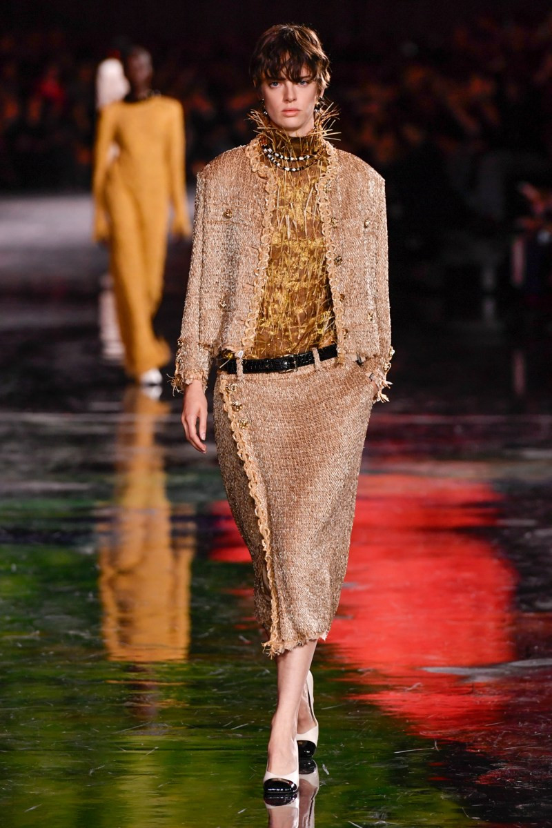 Отдельного разговора заслуживает твид. За двое суток до показа в индустрии «пополз слух», что в «новом Chanel» не будет твида. По факту — и да, и нет. Твидовых образов на подиуме все-таки было достаточно. Прежде всего, платьев и двоек с юбками. Но это не твид в привычном, традиционном понимании. Еще в бытность своей работы с Bottega Veneta, Блази экспериментировал с инновационными тканями-обманками. Вот и у Chanel твид ощущается мягким как трикотаж, он струится и становится полупрозрачным в вечерних образах, облегчается, становятся «подвижными», хотя и сохраняет в некоторых образах свою строгость и элегантность. Фантастический коммерческий потенциал у мешковатых бомберов из облегченного твида.