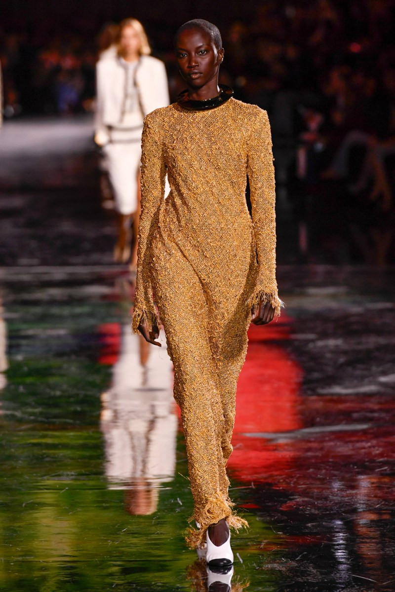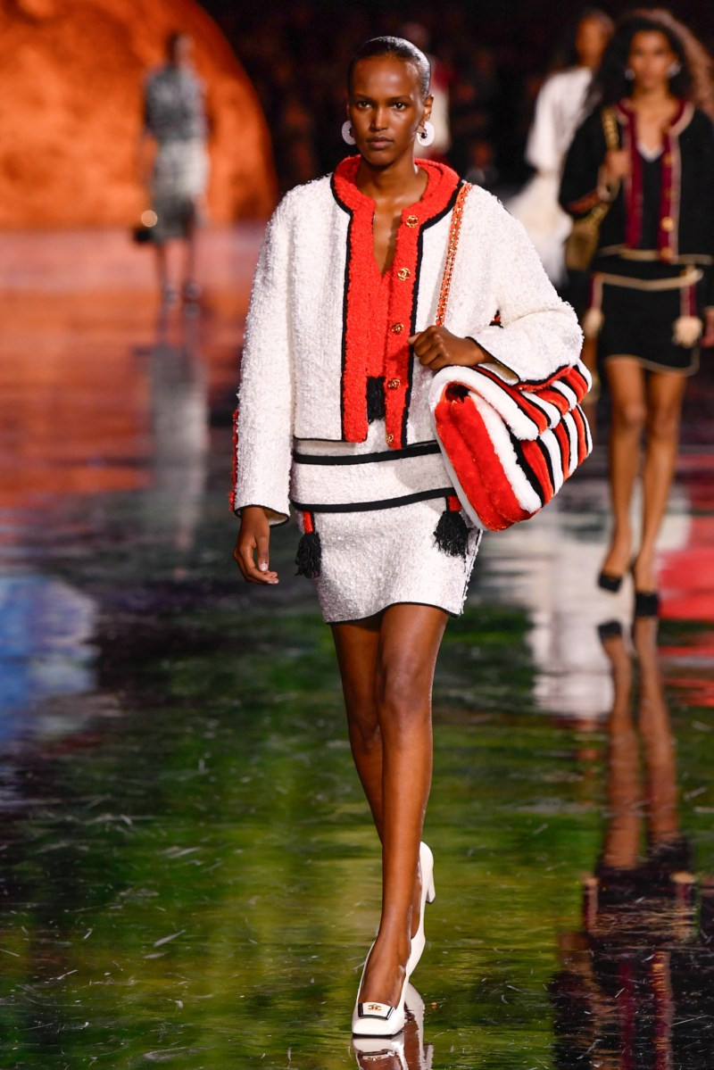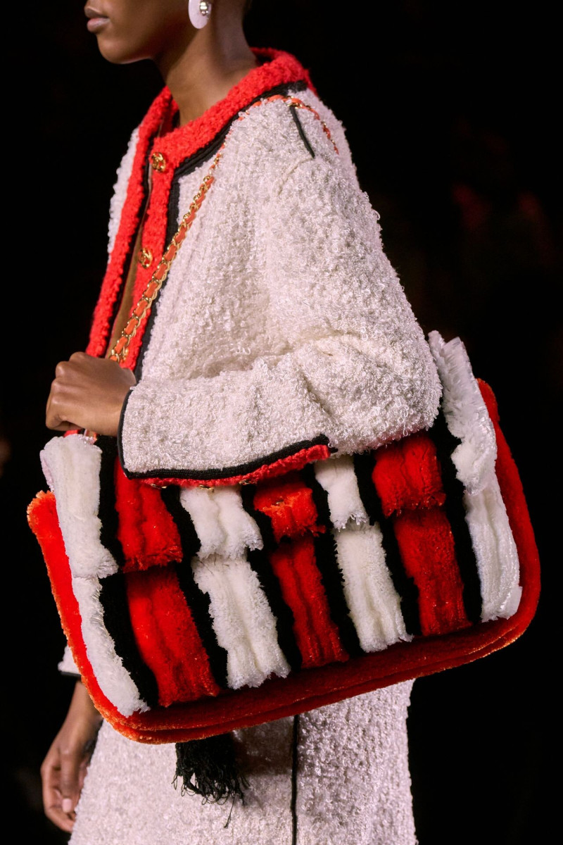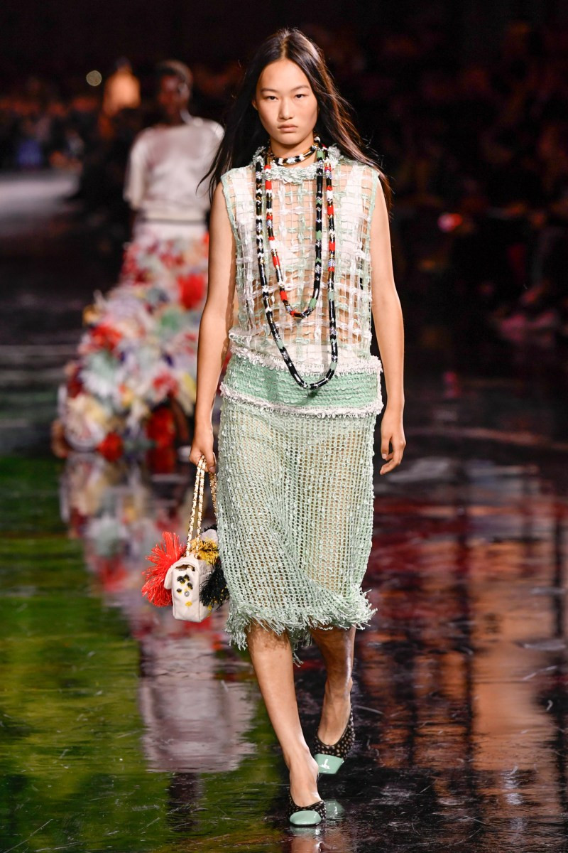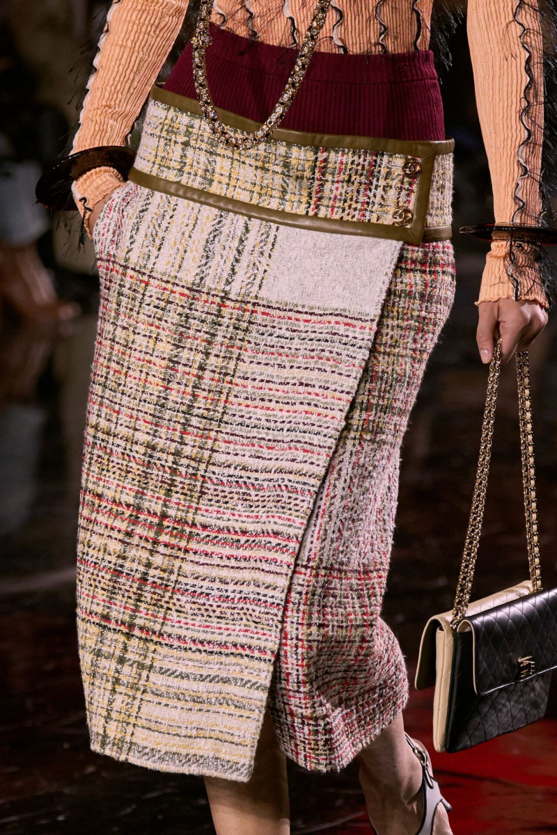 Отдельного разговора заслуживает твид. За двое суток до показа в индустрии «пополз слух», что в «новом Chanel» не будет твида. По факту — и да, и нет. Твидовых образов на подиуме все-таки было достаточно. Прежде всего, платьев и двоек с юбками. Но это не твид в привычном, традиционном понимании. Еще в бытность своей работы с Bottega Veneta, Блази экспериментировал с инновационными тканями-обманками. Вот и у Chanel твид ощущается мягким как трикотаж, он струится и становится полупрозрачным в вечерних образах, облегчается, становятся «подвижными», хотя и сохраняет в некоторых образах свою строгость и элегантность. Фантастический коммерческий потенциал у мешковатых бомберов из облегченного твида.