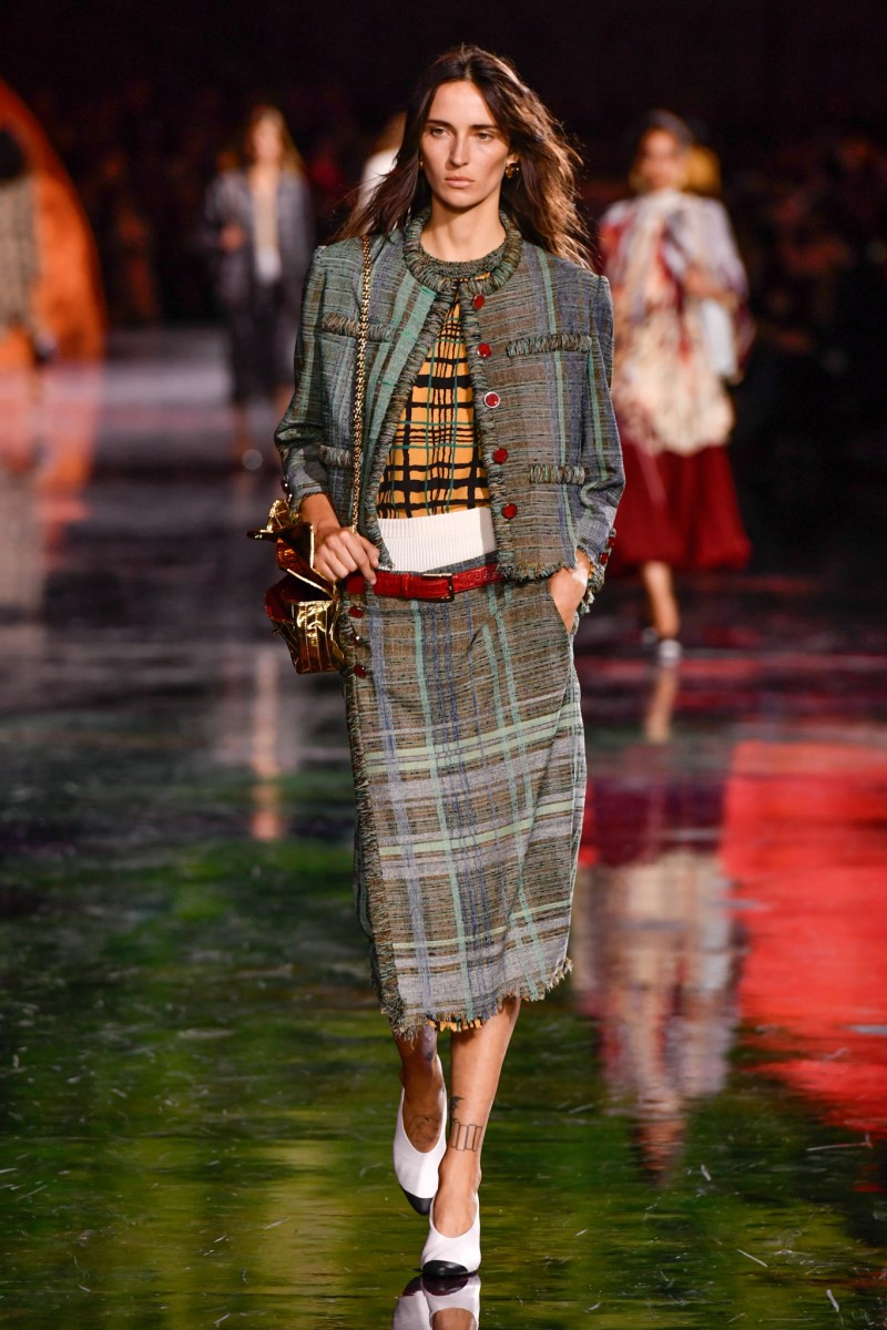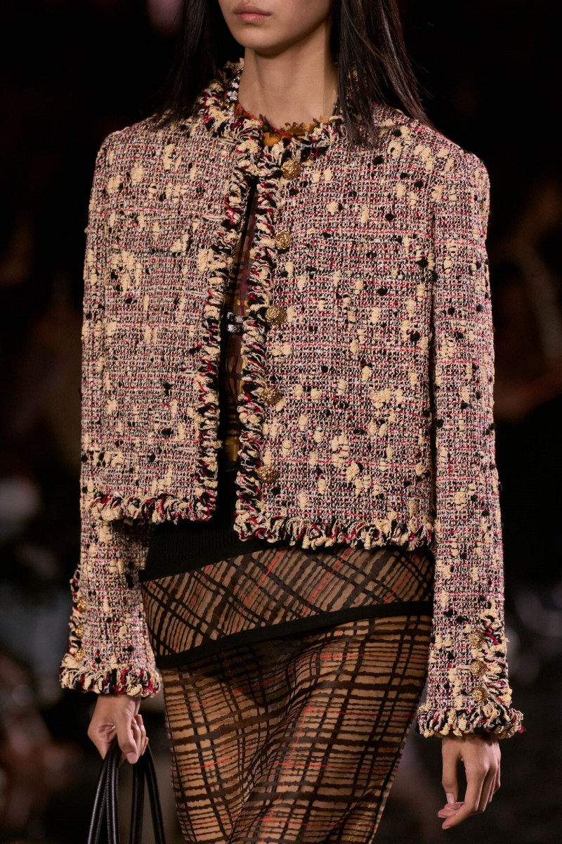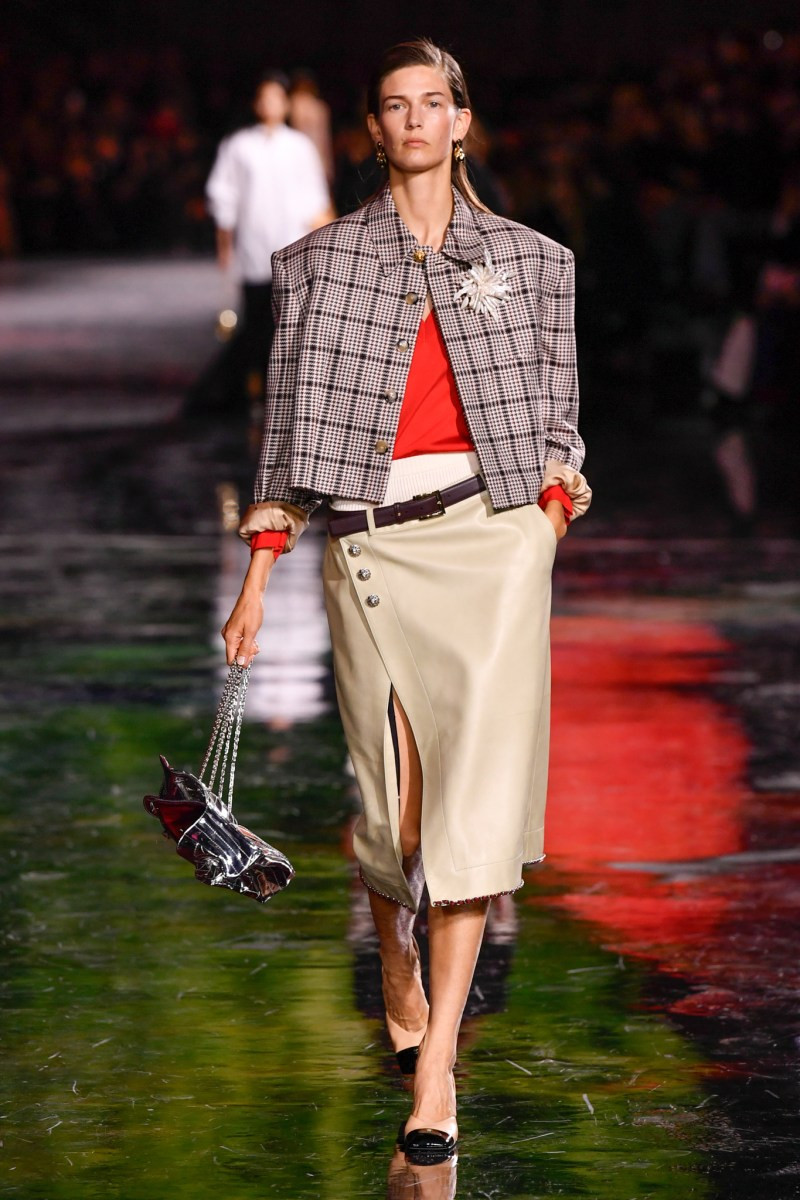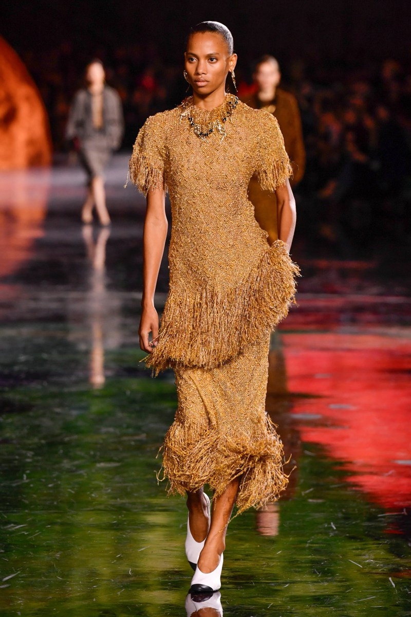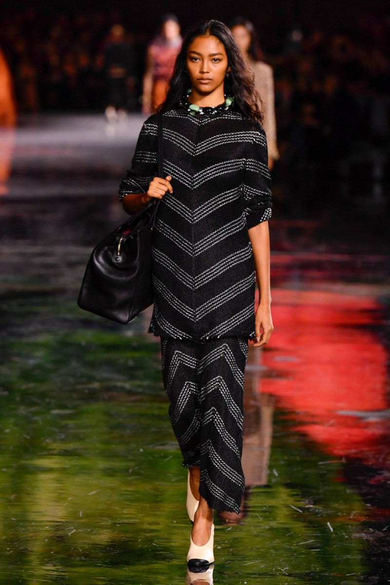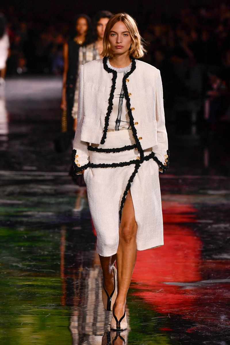Отдельного разговора заслуживает твид. За двое суток до показа в индустрии «пополз слух», что в «новом Chanel» не будет твида. По факту — и да, и нет. Твидовых образов на подиуме все-таки было достаточно. Прежде всего, платьев и двоек с юбками. Но это не твид в привычном, традиционном понимании. Еще в бытность своей работы с Bottega Veneta, Блази экспериментировал с инновационными тканями-обманками. Вот и у Chanel твид ощущается мягким как трикотаж, он струится и становится полупрозрачным в вечерних образах, облегчается, становятся «подвижными», хотя и сохраняет в некоторых образах свою строгость и элегантность. Фантастический коммерческий потенциал у мешковатых бомберов из облегченного твида.