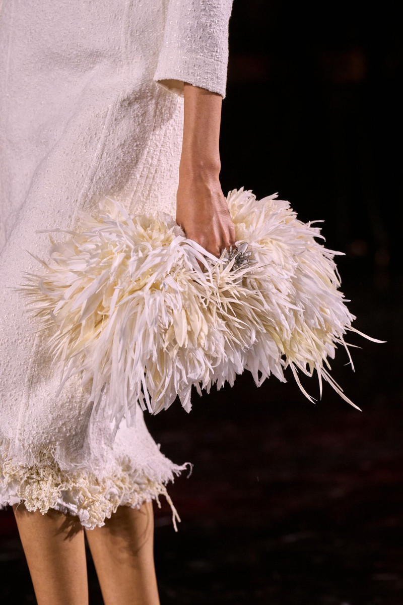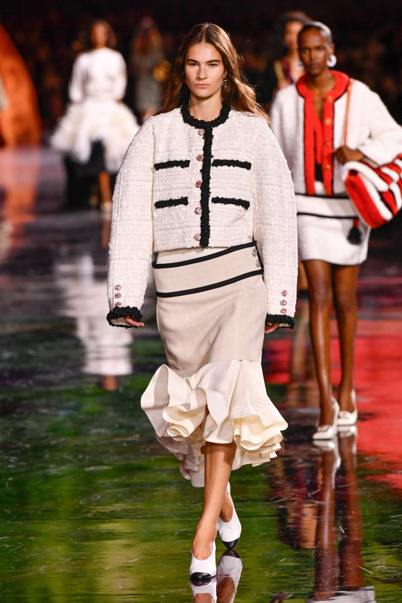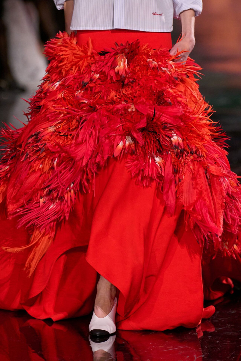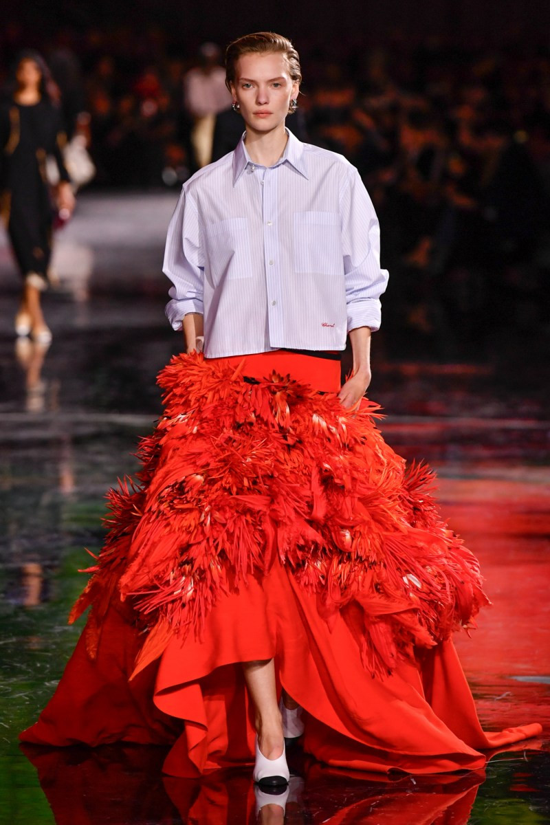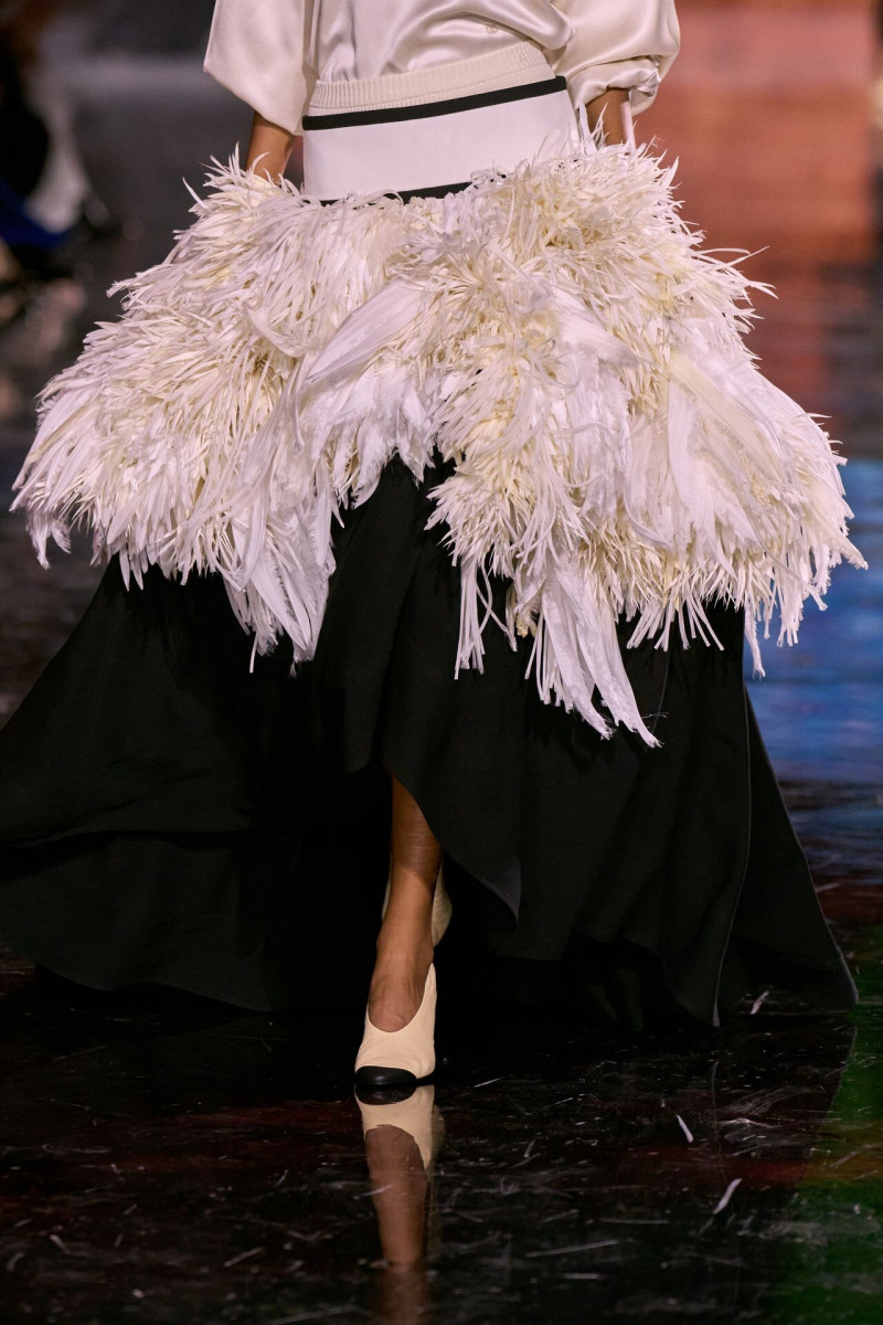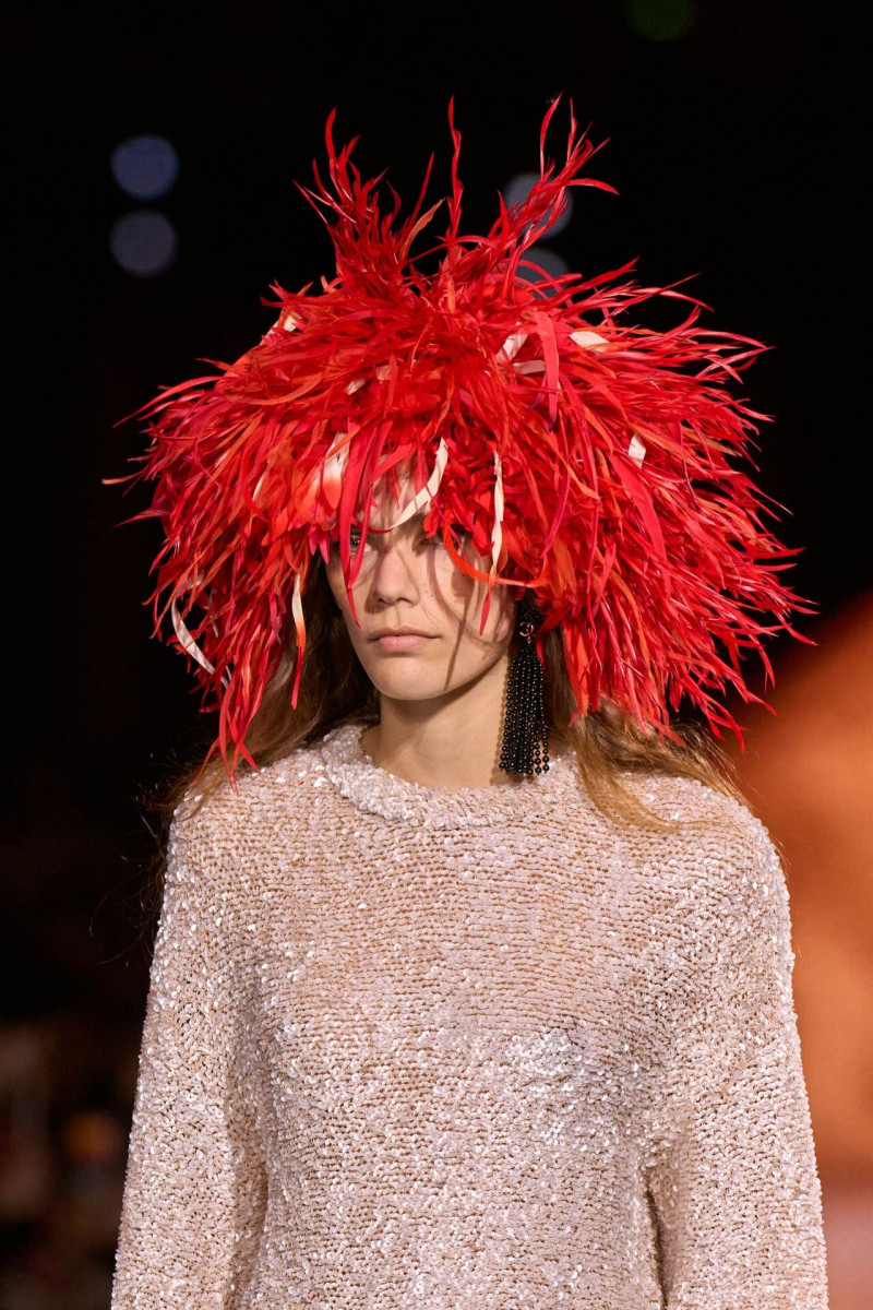 Помимо «очень Chanel» несколько образов на подиуме были «очень Блази». Дизайнеру позволили эту креативную вольность, как когда-то позволяли Карлу Лагерфельду. Мы увидели почерк дизайнера в образах с юбками-фламенко, головными уборами, похожими на «соломенные» парики, цветочных мотивах, выполненных из перьев.